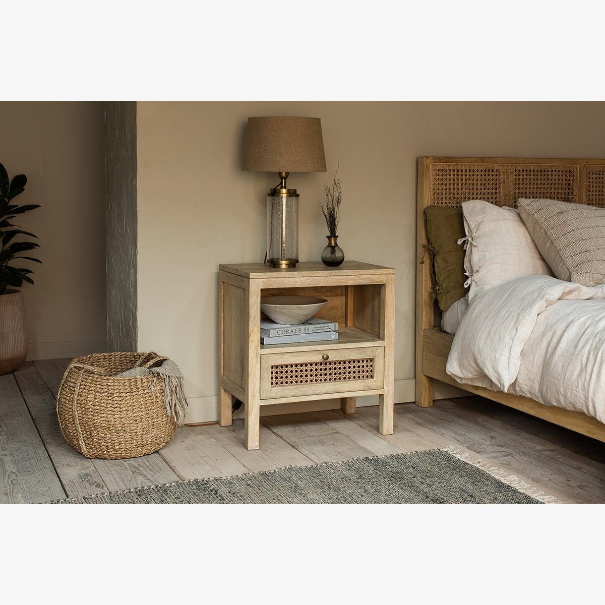 The soft natural tones of our Kanz bedside table create a warm, sophisticated aesthetic. It’s crafted from mango wood, a sustainable alternative to other wood types as it’s only harvested once the tree stops bearing fruit. The wood grain is clearly displayed, adding an appealing organic look and feel. Intricately handwoven cane completes the look, enhancing the mango wood with a beautifully detailed finish. A practical drawer is included which is ideal for storing books, a pair of glasses and other bedtime essentials. | nkuku Kanz Mango Wood Bedside Table | Bedroom Furniture | Natural