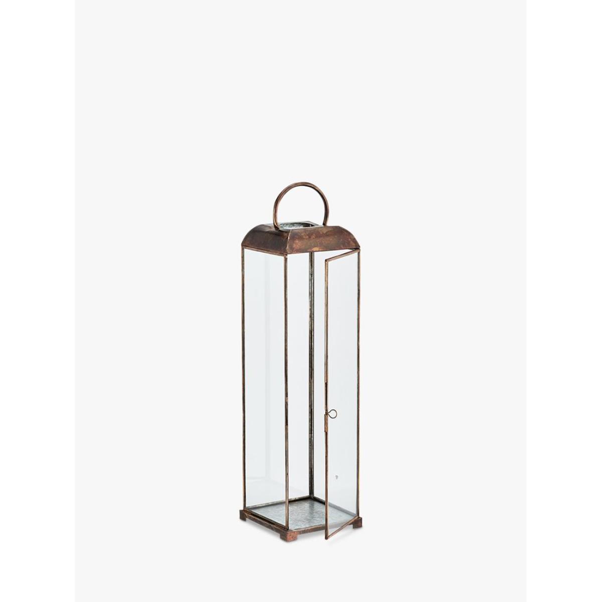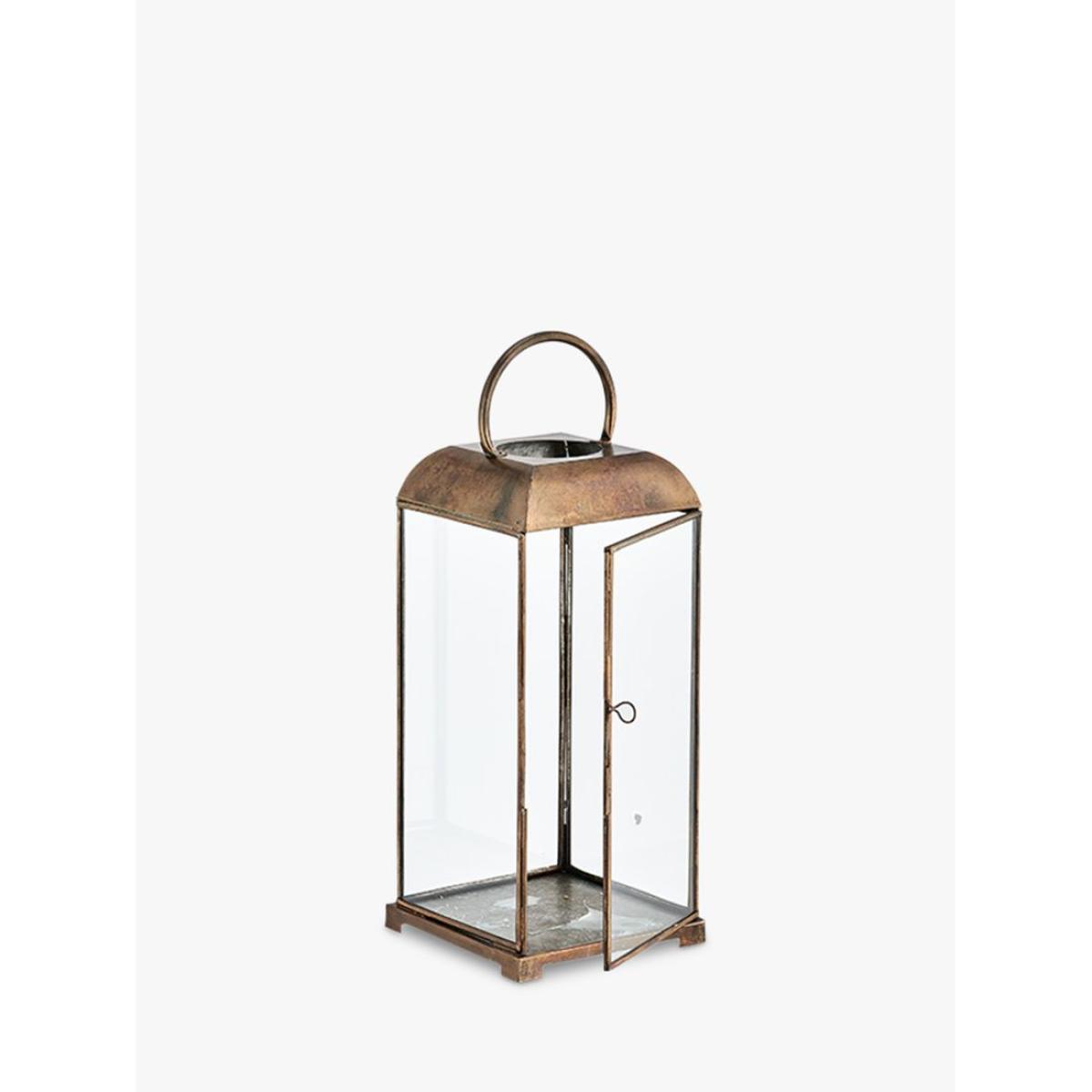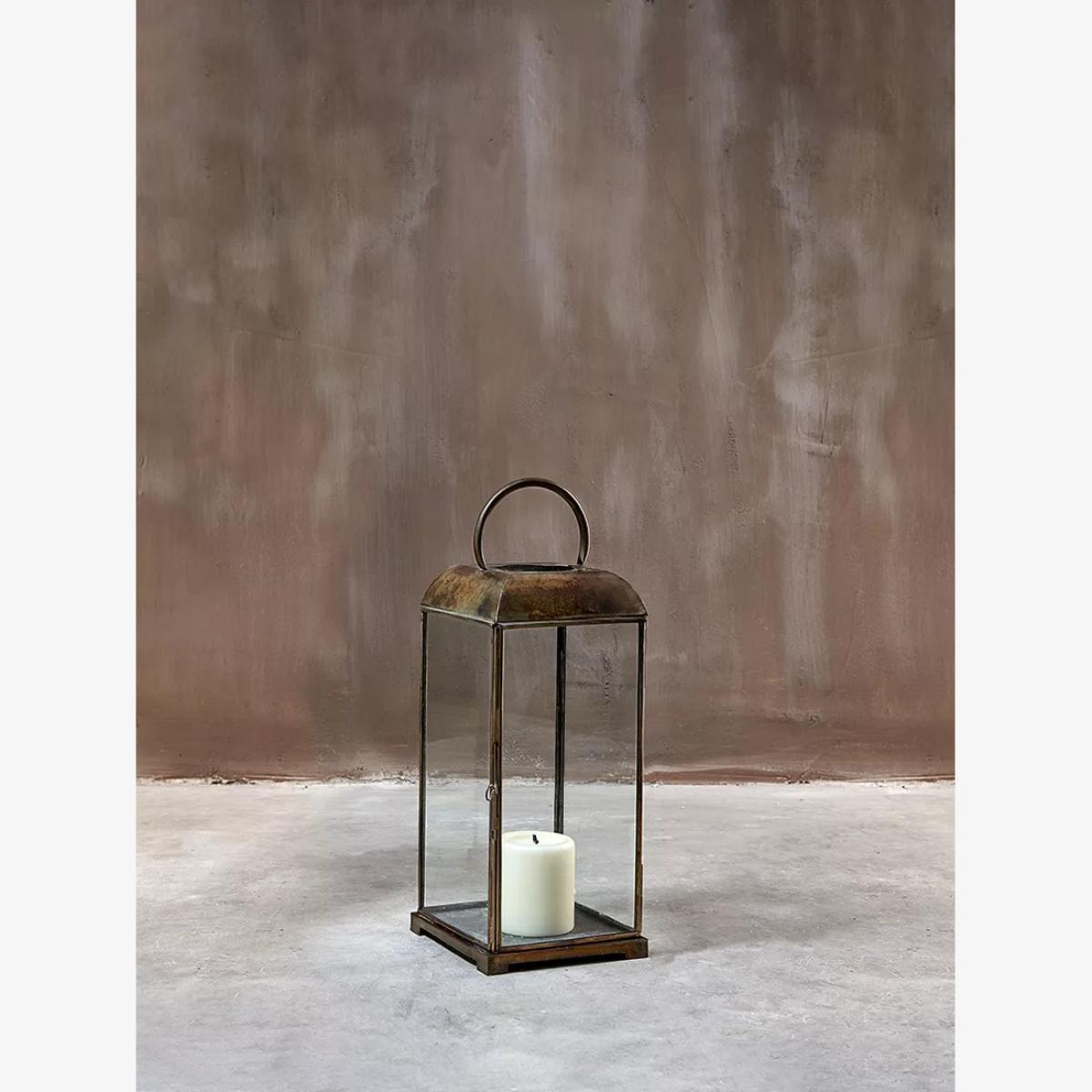 I love this lantern as it combines vintage charm with contemporary simplicity, making it versatile for various interior styles. It works particularly well in rustic, industrial, or eclectic settings, adding a warm, inviting glow without overwhelming the space. Practical styling tips include grouping a few with different heights on a dining table or console for visual interest, or placing it on an outdoor table for cosy evening ambience. Its antique brass finish introduces a subtle metallic touch that pairs beautifully with natural textures like wood, linen, or stone. Keep the candle simple and let the lantern’s design be the hero-perfect for creating intimate, atmospheric corners in your home.