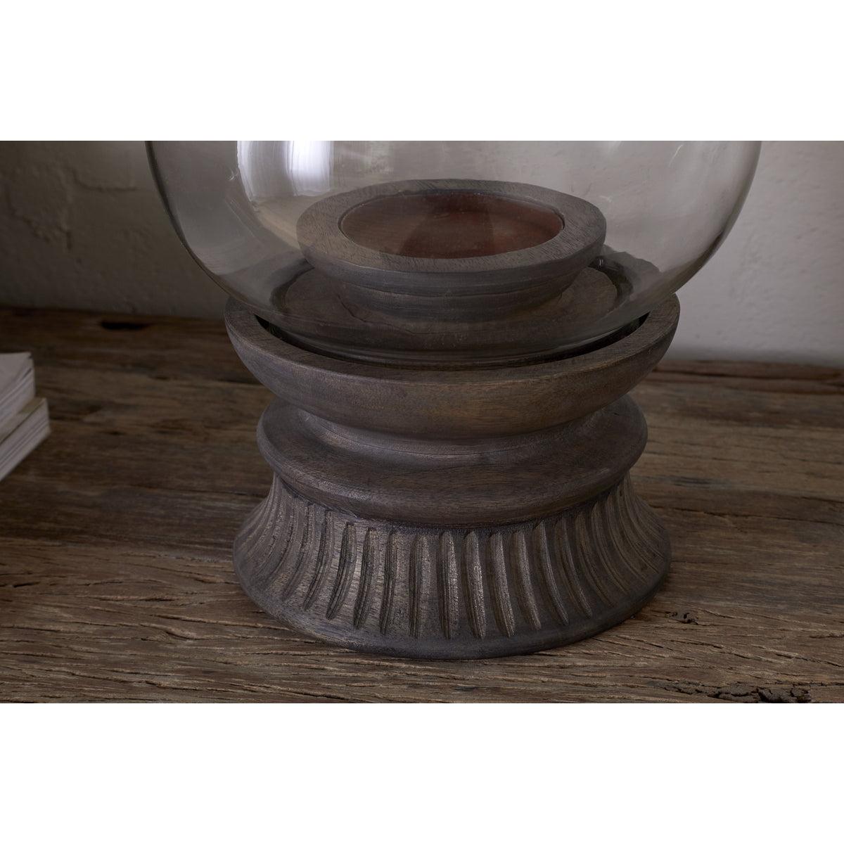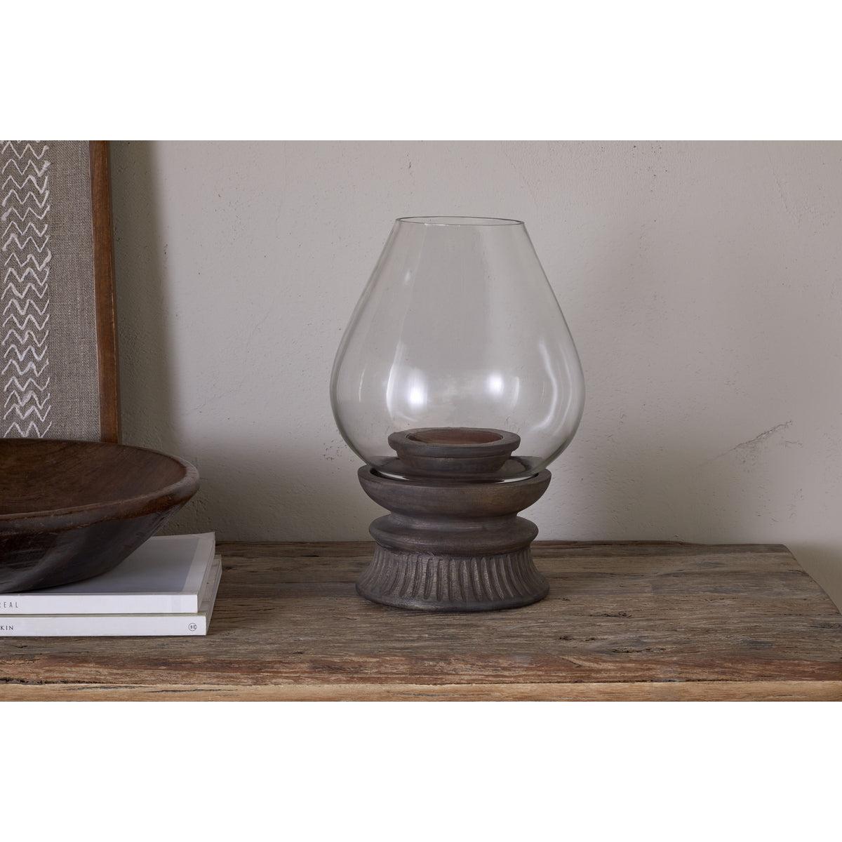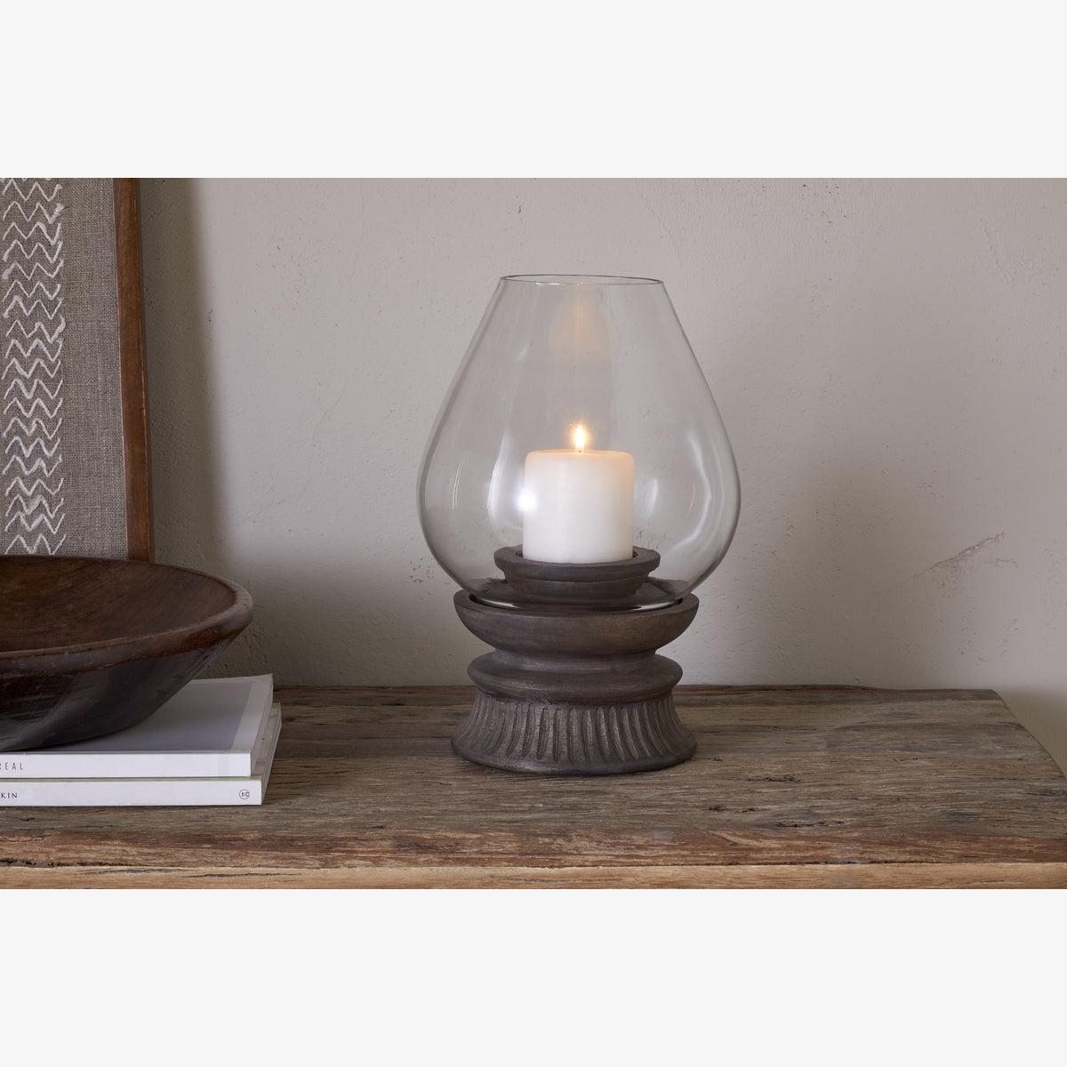 Perfect for atmospheric evenings, our stylish Kawani lantern has an elegant neck that slopes into a generous organic form and sits perfectly in its etched solid mango wood base. The contrasting glass and wood design creates a wonderfully tactile piece that brings understated style to a living space. Display on a sideboard or as a centrepiece to a table and style with our rustic pillar candles.