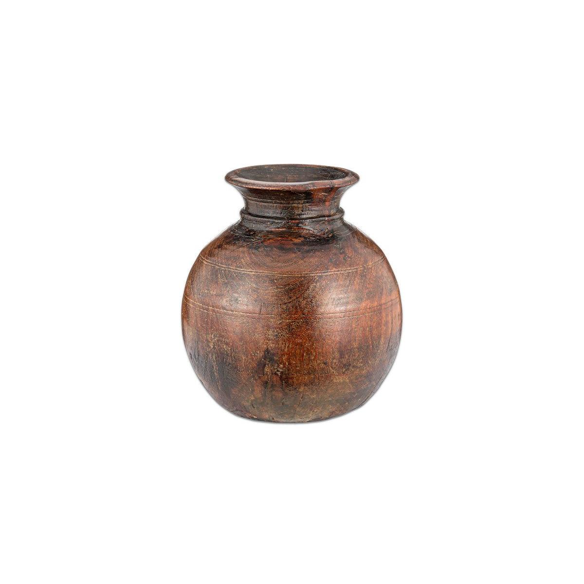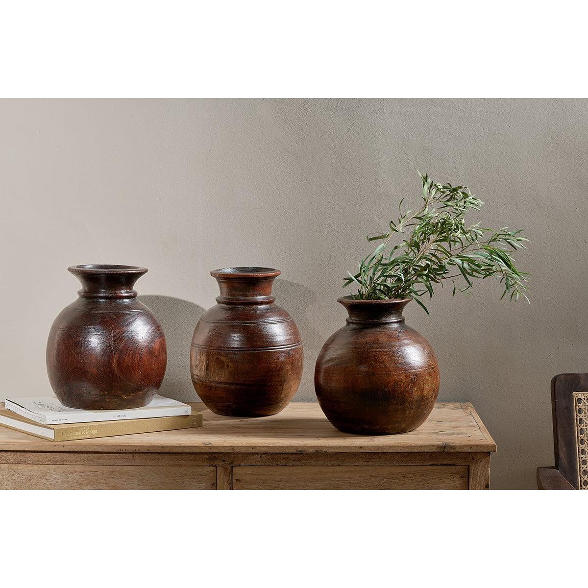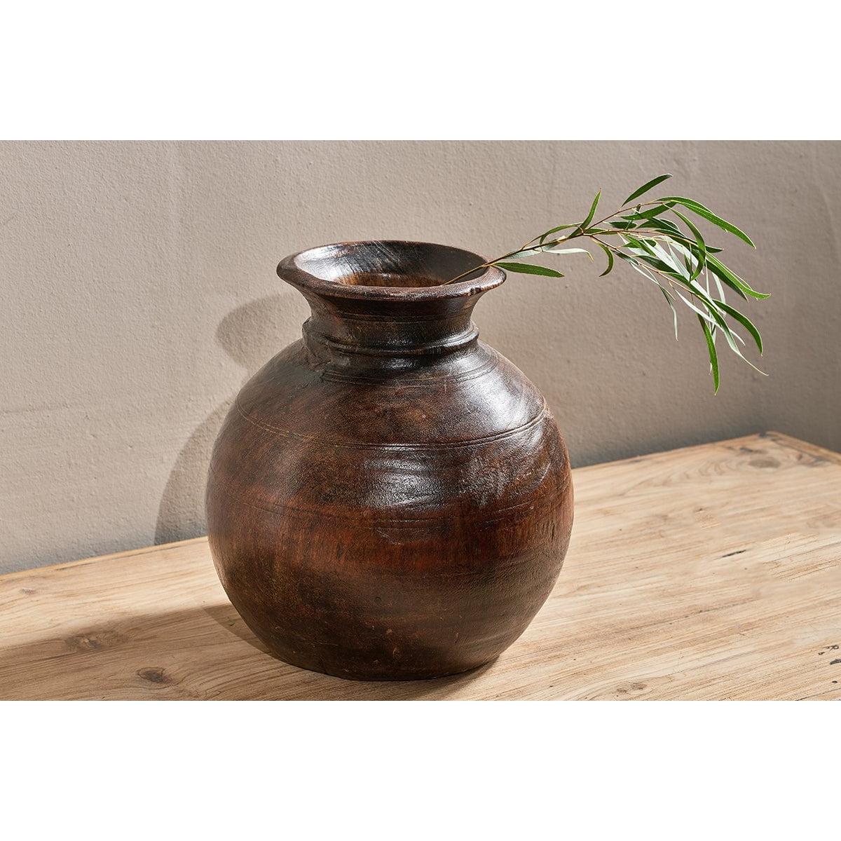 These curvaceous reclaimed wooden pots have an appealing dark antique tone. Naturally weathered by time, the Kiaan pot was originally used in India for storing honey and milk. The urn shape was originally hand carved and the soft curve, carefully sanded and smoothed into shape. There is something special about a reclaimed piece, not only repurposing a product but also bringing something time honed into a home, adds character and interest - as well as a connection with the past. It is always a pleasure to think of the previous use of a reclaimed item, and we love the idea of these being kept in traditional Indian households holding the precious commodities of honey and milk collected from a treasured house cow.