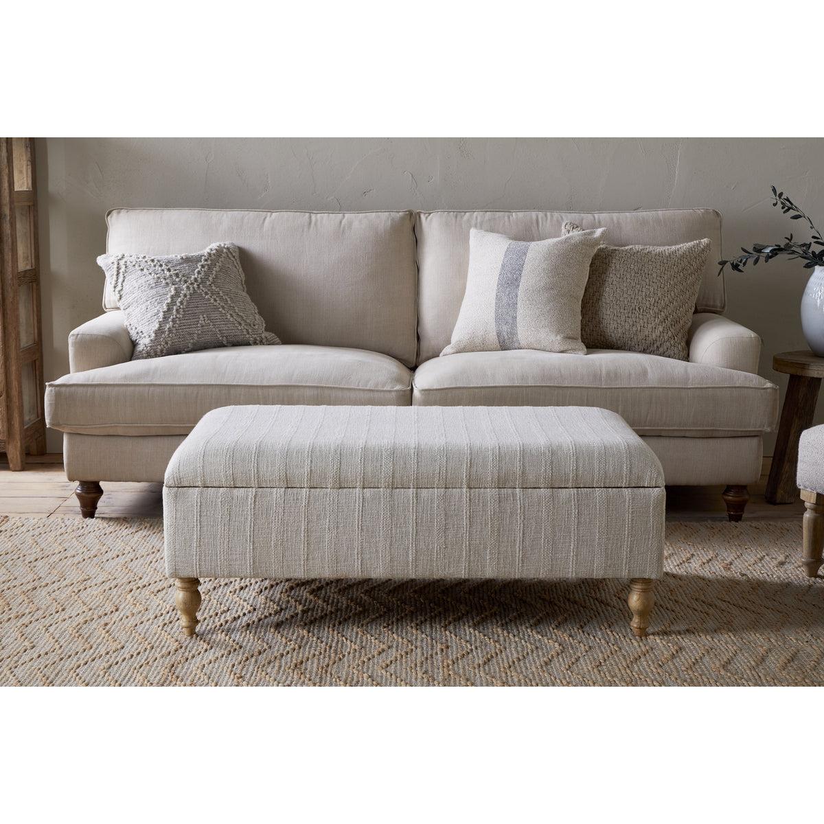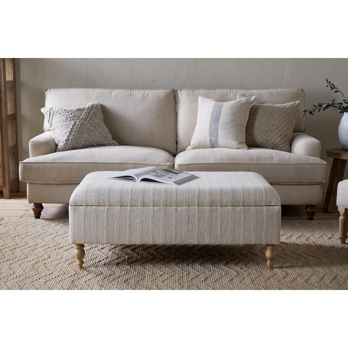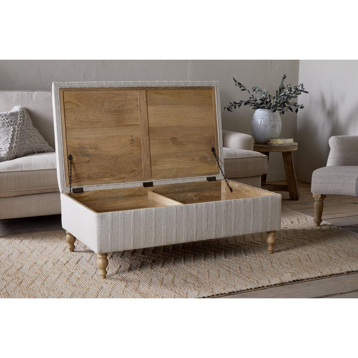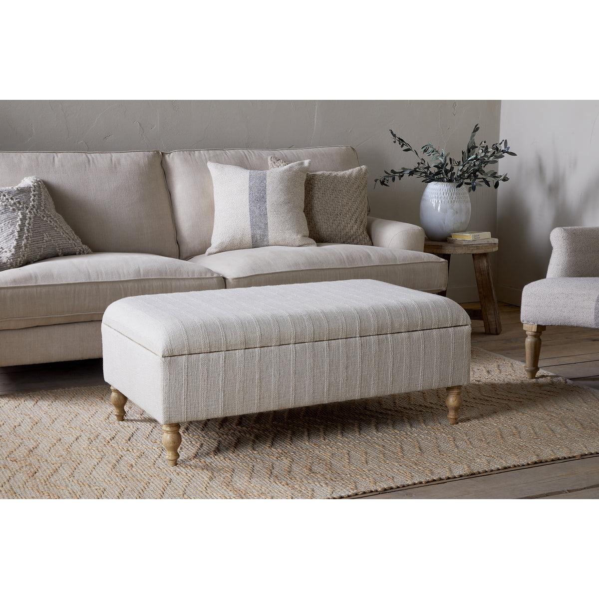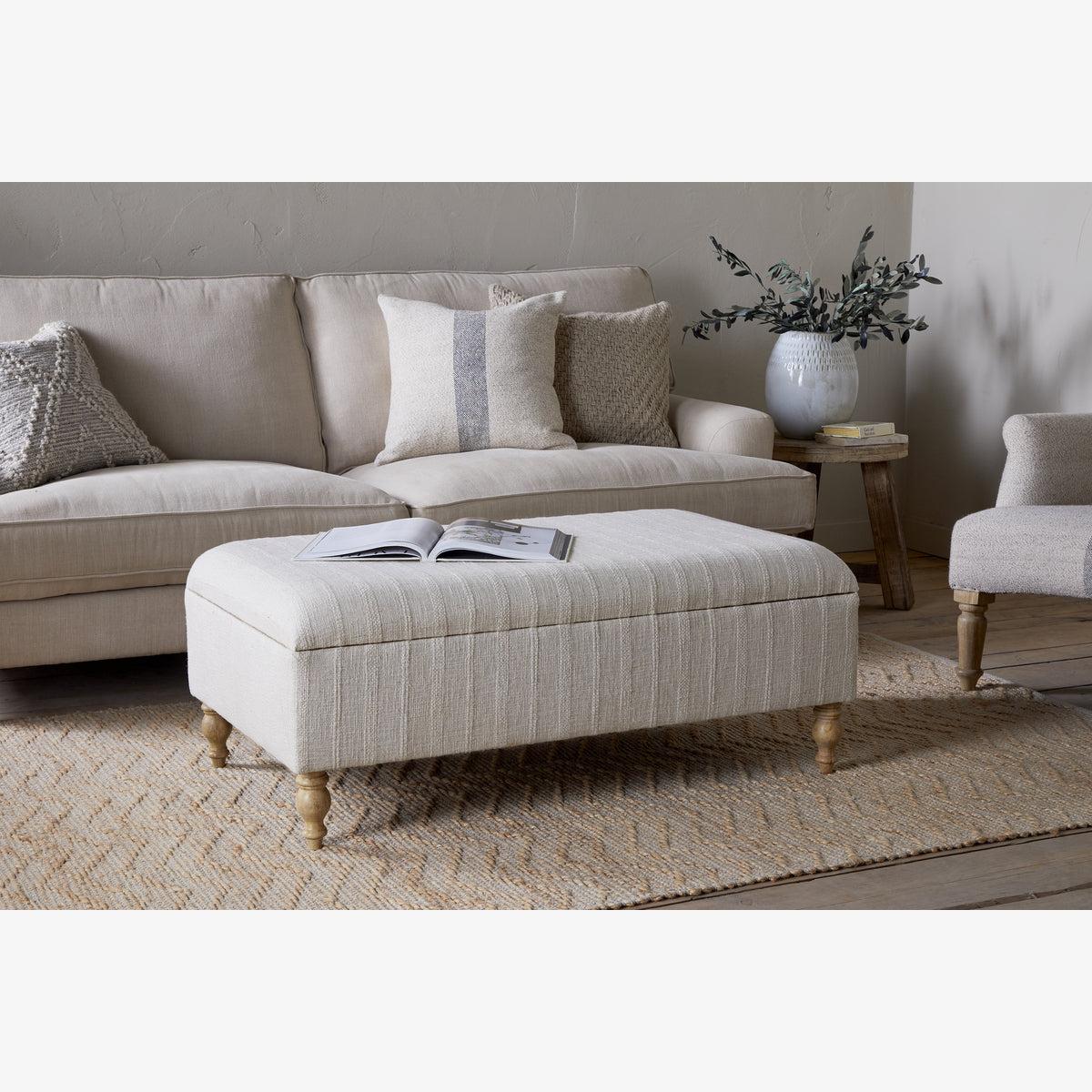 A practical and stylish addition to any living space, this storage ottoman is upholstered in a soft cotton and linen blend with a subtle stripe. Its generous interior is perfect for stowing away blankets, books, or everyday items, while the cushioned top doubles as a comfortable footrest or extra seat. Finished with elegant wooden legs, it-s a versatile piece that brings both form and function to your home.