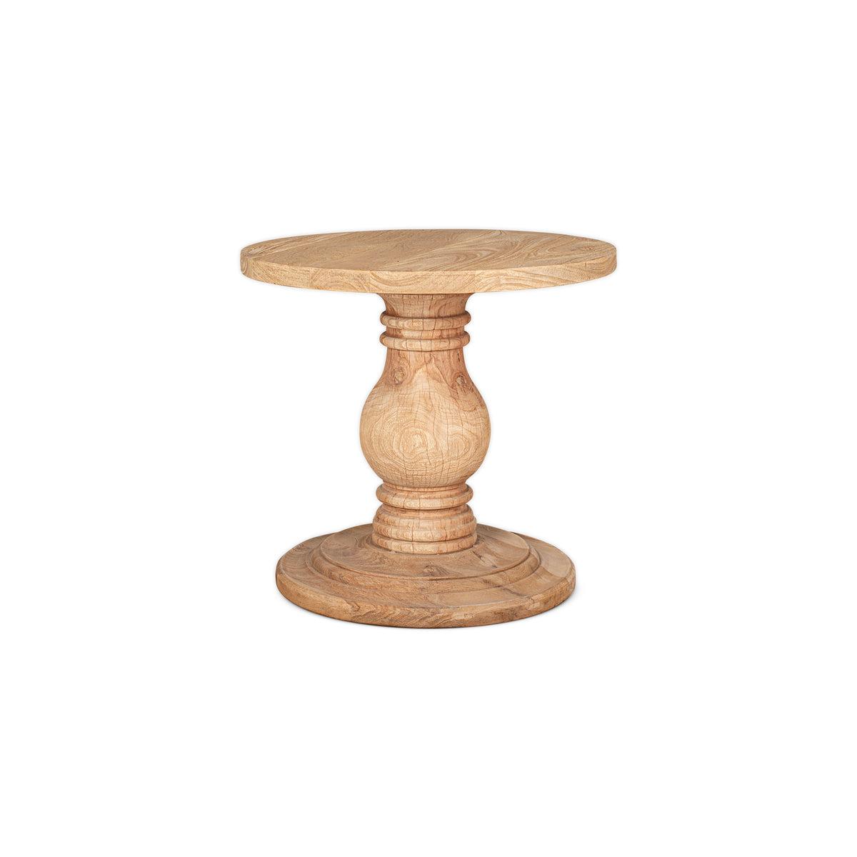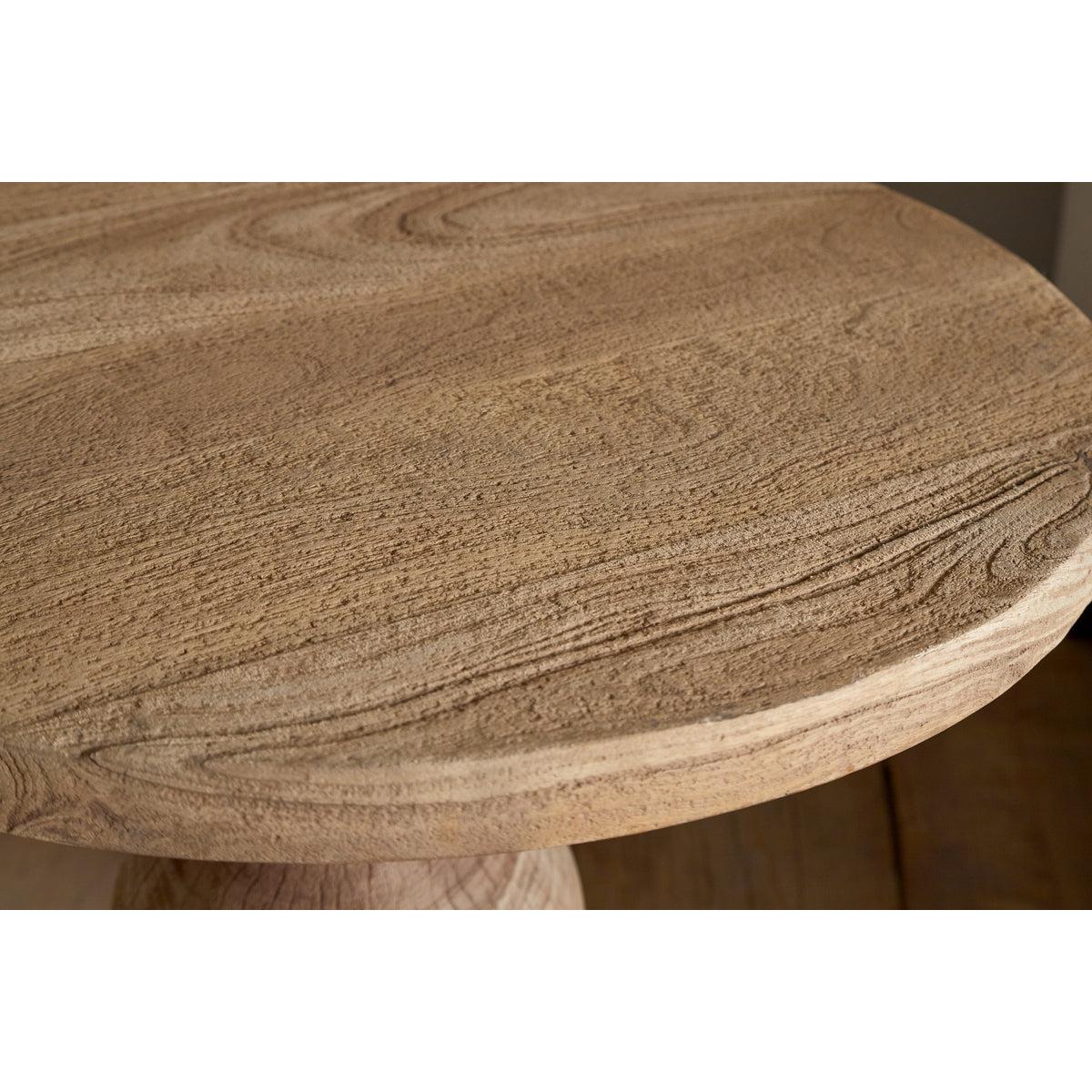With its distinctive silhouette and compact proportions, the Laya side table makes a refined accent in any room. The circular tabletop rests on an elegantly shaped base, creating a balanced and sculptural form. A raw wood finish enhances the natural grain and knots, bringing warmth and texture to your space, perfect beside a sofa, armchair, or bed.