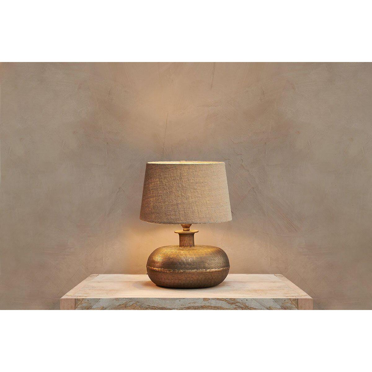 The Lumbu lamp has an interesting antique appearance derived from the honest, artisan techniques used to create it. The antique - brass finish enhances the tactile pattern in an understated and stylish manner. Each lamp comes with a black fabric cord. Complete the look with one our attractive lampshades. | nkuku Lumbu Lamp | Lamps | Antique Brass | Small