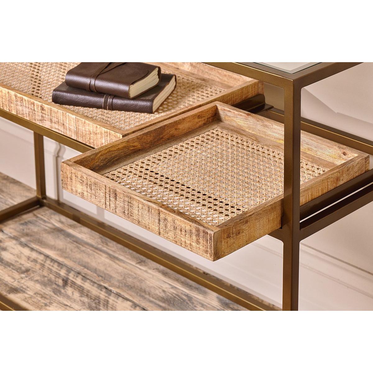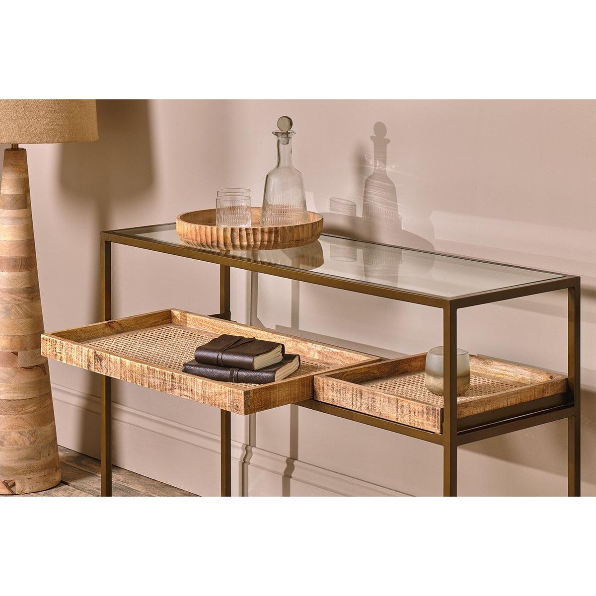 The striking Luzon display console table is the perfect piece for showcasing unique decorative items. The console table features a clean brass frame, a clear glass tabletop, and an attractive lower shelf that is crafted from wood and cane. The lower shelf has two parts: a large rectangular removable tray and a smaller square tray. Style this lower shelf with decorative objet or neatly stack your favourite books, keeping the top clear for a statement lamp or tealights.
