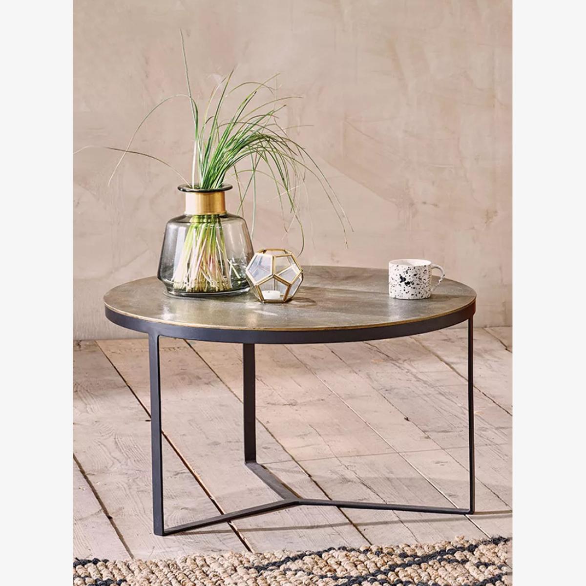 The Nkuku Maba coffee table is full of character. The round top in an antique brass finish paired with the angular iron frame creates a timeless piece of furniture that blends in beautifully with most décor. The table is handmade by skilled artisans in India using traditional techniques. Want to see it first? You may want to see and get a feel for the furniture in one of our shops before ordering. We'll be able to tell you where the range you'd like to view is on display.