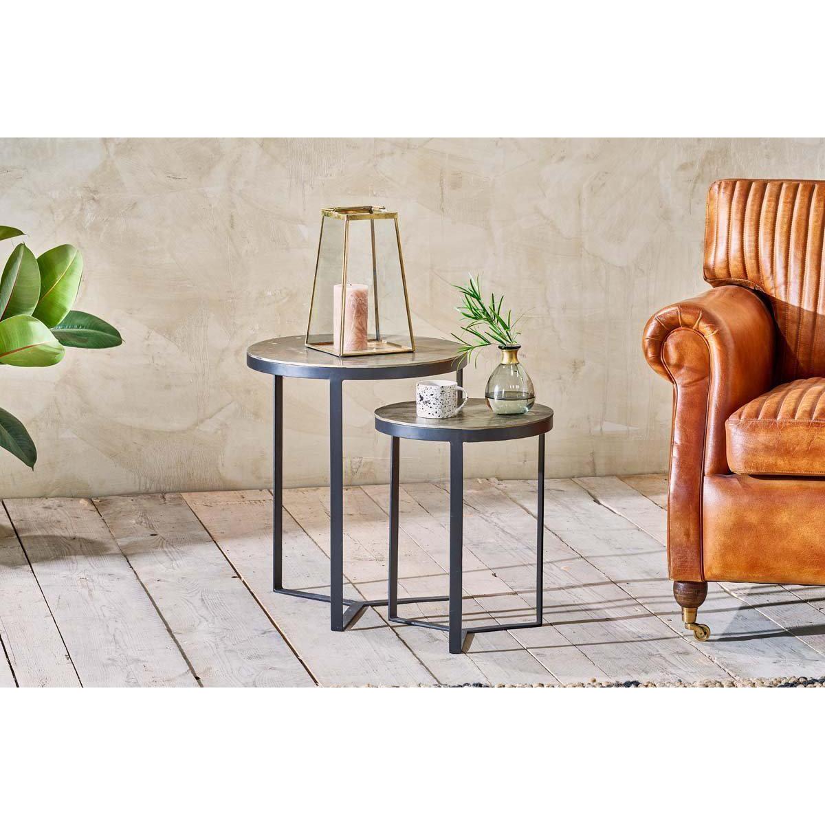 The rich patina of our Maba tabletops gives this collection an appealing quality. The angular leg design provides definition and interest. Ideal for finishing off a living room either with a coffee table taking centre stage, or as a supporting act, as end of sofa tables, neatly nested together. | nkuku Maba Nesting Side Tables Set Of 2 | Tables | Antique Brass | Small 45 x 36 cm (Diameter)/Large 54 x 46 cm (Diameter)