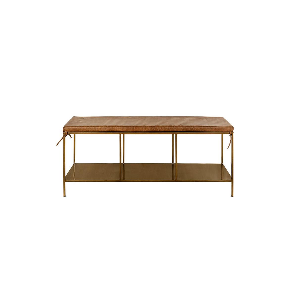 Our Mahi bench combines form with function. Its rich tanned leather and warm brass frame add a classic, opulent note to your home. The simple design is both versatile and practical, with a lower shelf that’s ideal for storing shoes or larger household items. Well designed and robust, this bench looks particularly stylish in a boot room or hallway. The soft leather has a striking depth of colour which gives the bench a luxurious feel, making this a timeless and sophisticated product. | nkuku Mahi Iron & Leather Bench | Seating | Brass