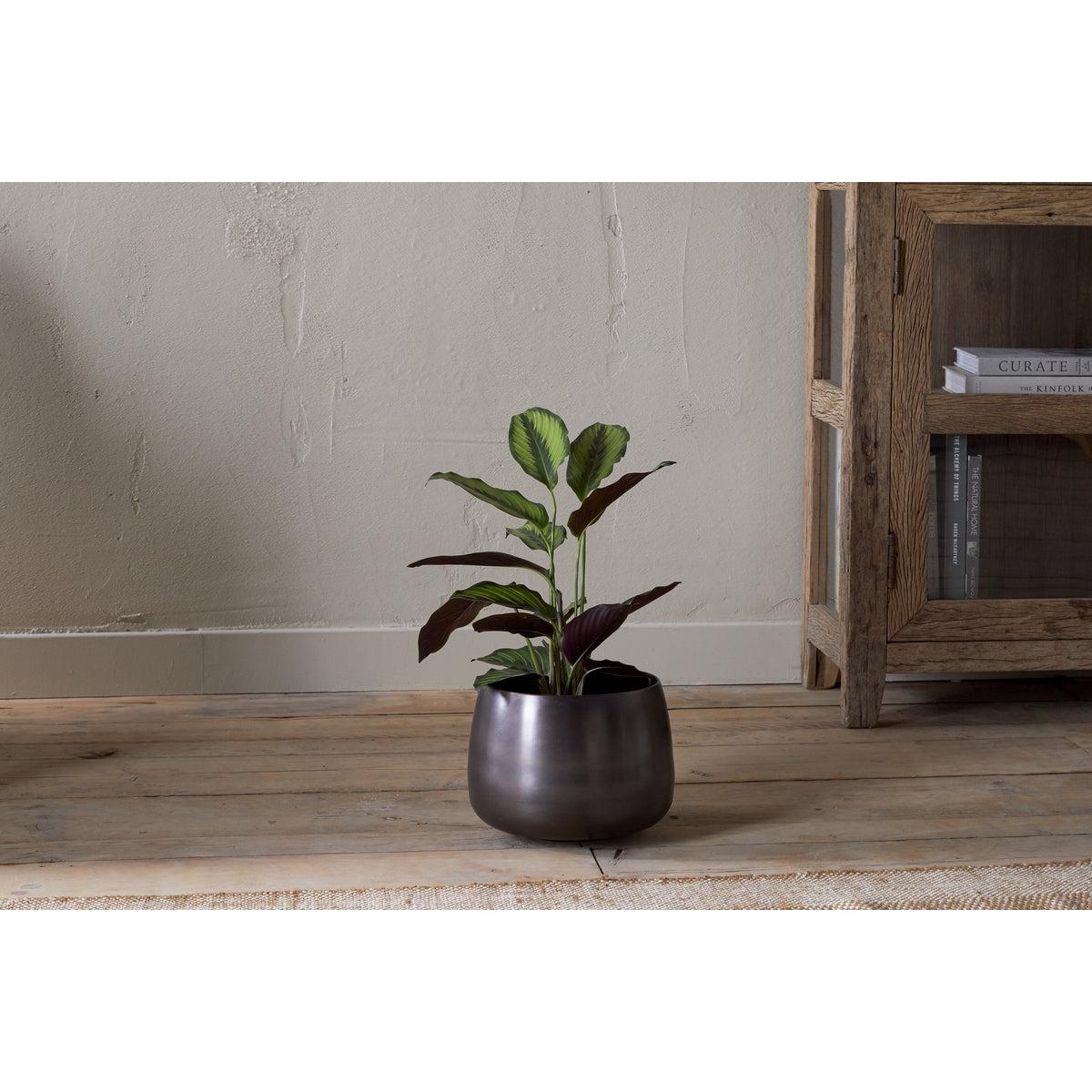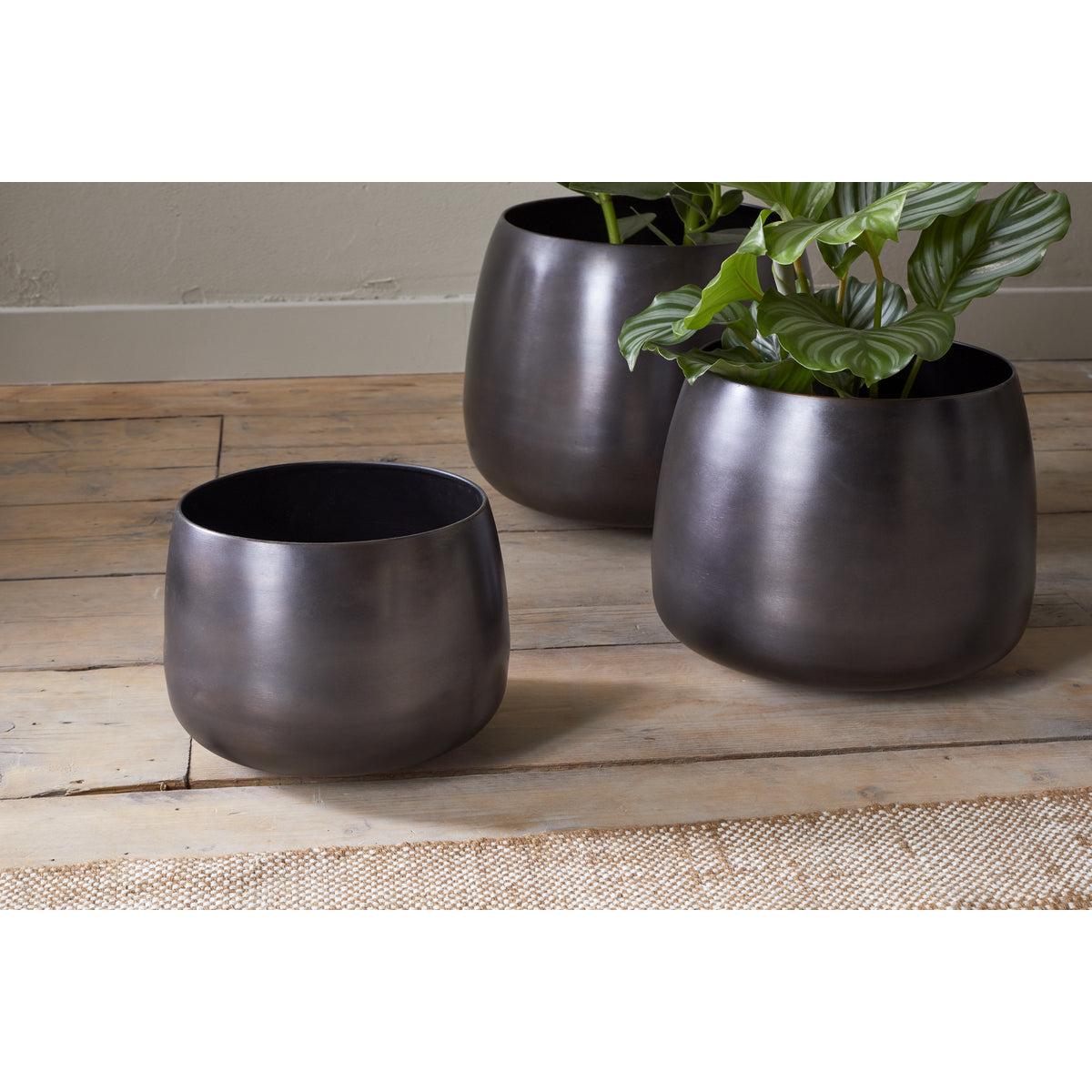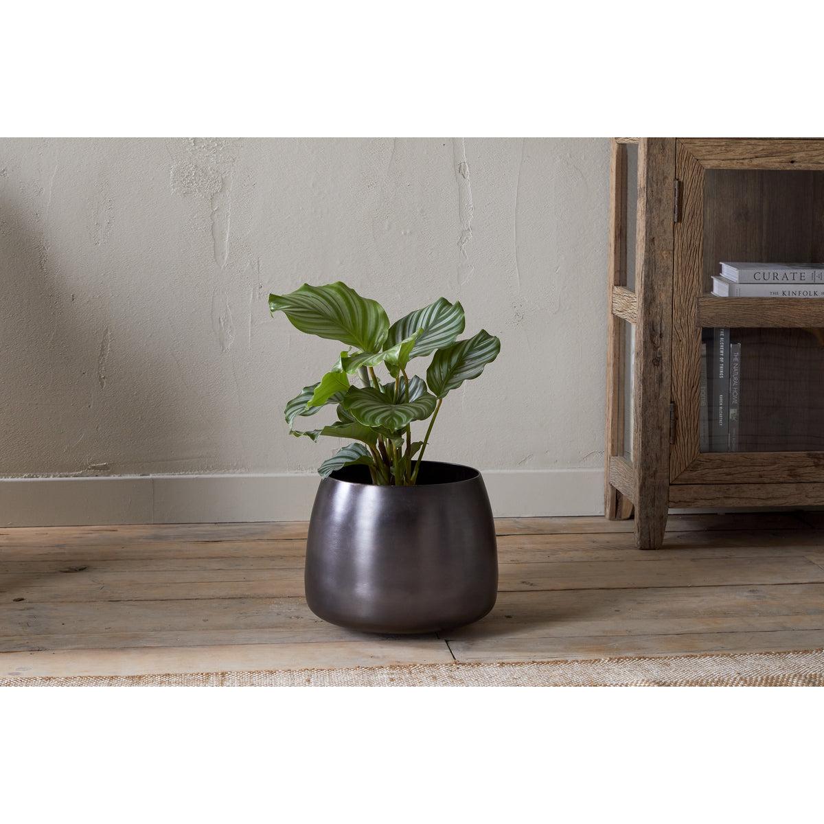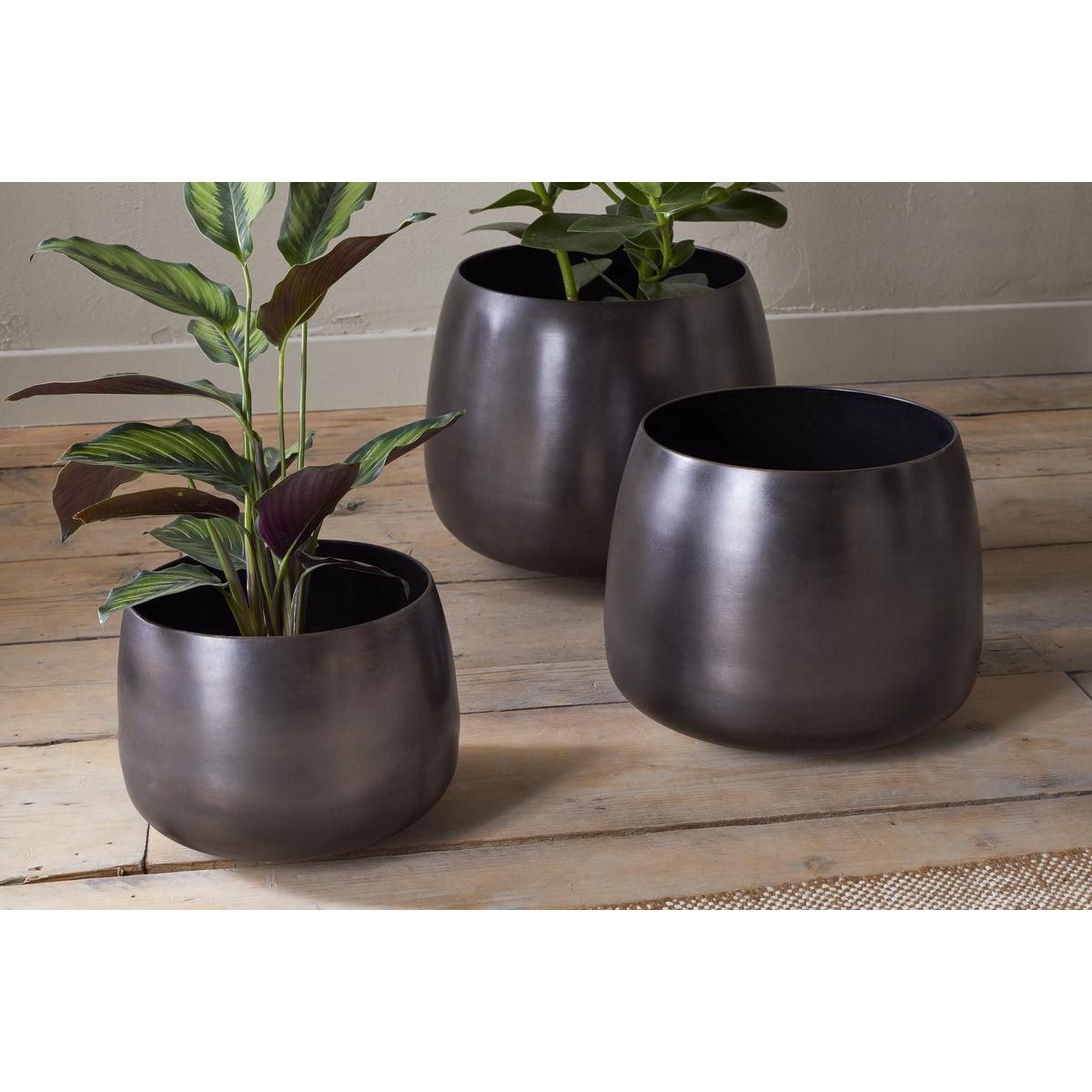 With its contemporary design and aged bronze finish, this indoor plant pot provides the perfect backdrop to enhance the rich greens of houseplants. The warm, subtly weathered surface adds depth and character, making it easy to style in a variety of interiors. Available in three sizes, it can be displayed solo or grouped in twos or threes for greater visual impact.