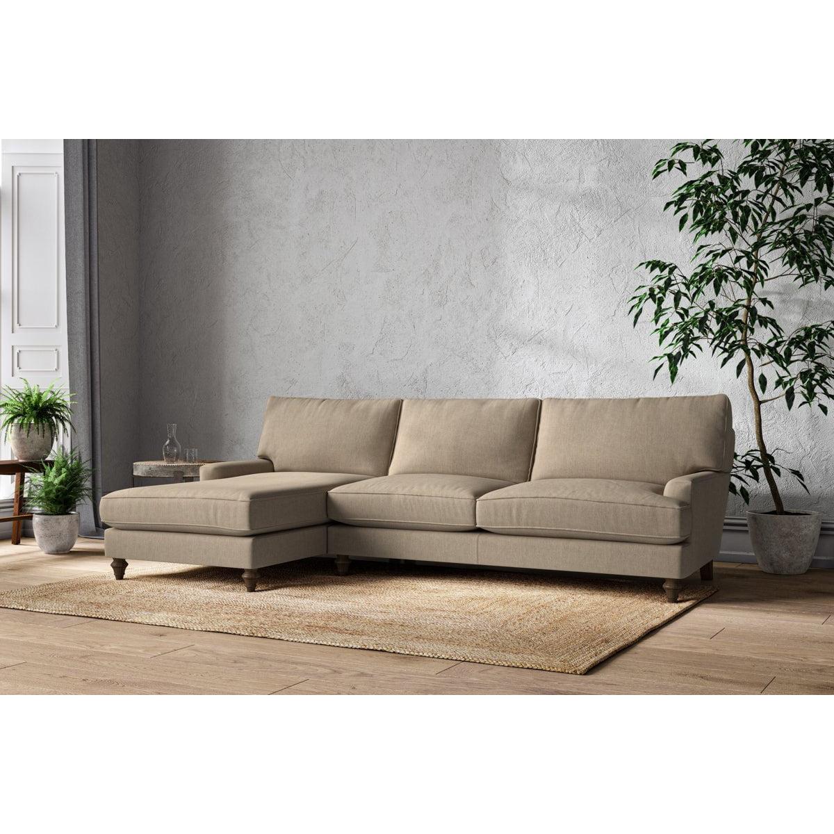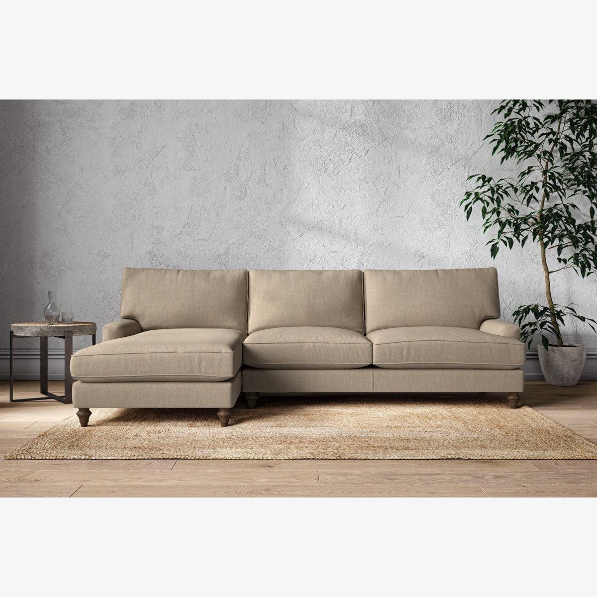 The classic design of our Marri grand left hand chaise sofa has a timeless appeal that suits almost any interior. Each piece is handcrafted by our specialist team in our Nottinghamshire workshop combining traditional techniques with exceptional craftmanship. Well-considered details ensure lasting quality, including piped edging, separate back cushions, and hand-turned hardwood feet. The hardwood frame and high-grade steel serpentine springs are selected for enduring quality, and the cushions are made from foam with a fibre wrap for added comfort. The fabric is hand cut to size, playing close attention to the characteristics of the material, and the sculpted hardwood feet provides the finishing detail. Our upholstery fabrics are sourced from Italy’s finest mills and are chosen for their style and quality. We have selected a beautiful heavyweight, soft washed linen with an outstanding texture. Our linen is perfectly suited to upholstery, with an appealing natural, and tactile feel. It is also heavy and durable. The linen is FR treated for domestic upholstery ensuring peace of mind as well as meeting specialist UK furniture requirements. Please note, our white background cut-out photography is shown in Natural for shape and style reference. Fabric Swatch Ordering We recommend ordering fabric swatches before placing your order, giving you the chance to feel the fabric and see your colour choices within your own home. You can order up to 6 free fabric swatches by clicking here. Before placing your order, it's important to take the time to measure the space you intend to place your made-to-order furniture to ensure it fits properly. You can read more in our Sofa Buying Guide.