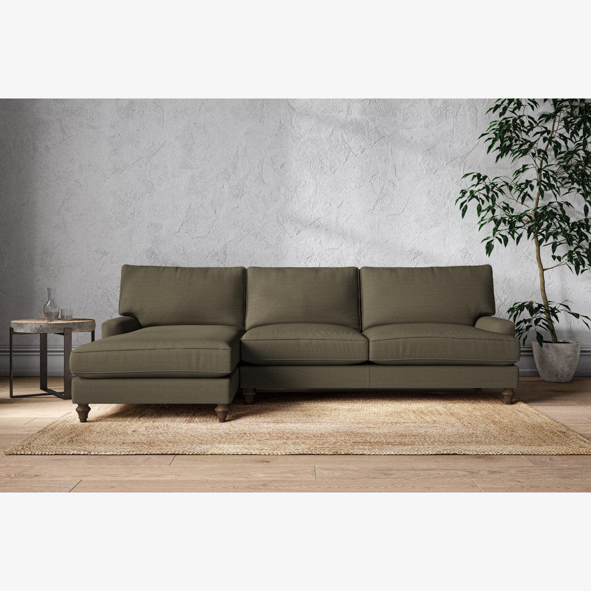 The classic design of our Marri grand left hand chaise sofa has a timeless appeal that suits almost any interior. Each piece is handcrafted by our specialist team in our Nottinghamshire workshop combining traditional techniques with exceptional craftmanship. Well-considered details ensure lasting quality, including piped edging, separate back cushions, and hand-turned hardwood feet. The hardwood frame and high-grade steel serpentine springs are selected for enduring quality, and the cushions are made from foam with a fibre wrap for added comfort. The fabric is hand cut to size, playing close attention to the characteristics of the material, and the sculpted hardwood feet provides the finishing detail. Our upholstery fabrics are chosen for their style and quality, where all fabrics are FR treated for domestic upholstery ensuring peace of mind as well as meeting specialist UK furniture requirements. Our curated colour palette offers a variety of sophisticated muted shades. Please note, our white background cut-out photography is shown in Natural for shape and style reference. Fabric Swatch Ordering We recommend ordering fabric swatches before placing your order, giving you the chance to feel the fabric and see your colour choices within your own home. You can order up to 6 free fabric swatches by clicking here. Before placing your order, it's important to take the time to measure the space you intend to place your made-to-order furniture to ensure it fits properly. You can read more in our Sofa Buying Guide.