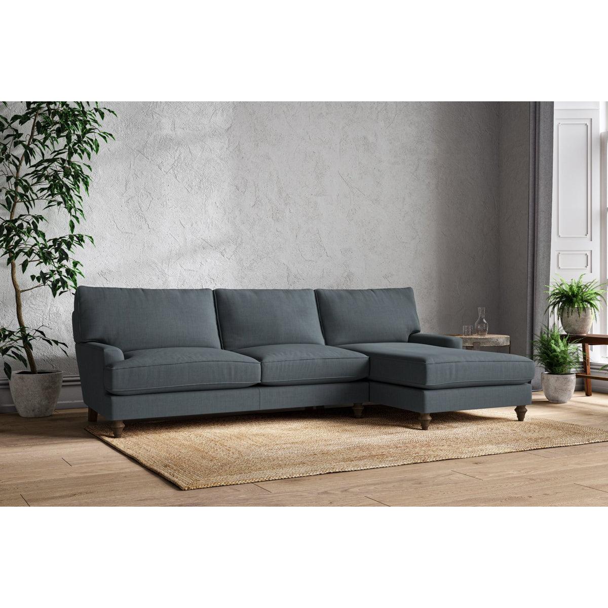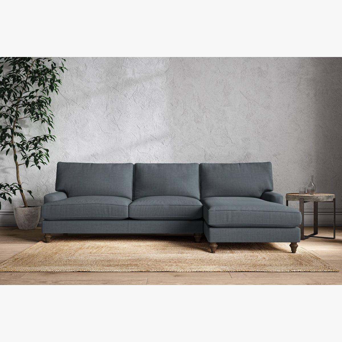 The classic design of our Marri grand right hand chaise sofa has a timeless appeal that suits almost any interior. Each piece is handcrafted by our specialist team in our Nottinghamshire workshop combining traditional techniques with exceptional craftmanship. Well-considered details ensure lasting quality, including piped edging, separate back cushions, and hand-turned hardwood feet. The hardwood frame and high-grade steel serpentine springs are selected for enduring quality, and the cushions are made from foam with a fibre wrap for added comfort. The fabric is hand cut to size, playing close attention to the characteristics of the material, and the sculpted hardwood feet provides the finishing detail. Our upholstery fabrics are sourced from Italy’s finest mills and are chosen for their style and quality. We have selected a beautiful heavyweight, soft washed linen with an outstanding texture. Our linen is perfectly suited to upholstery, with an appealing natural, and tactile feel. It is also heavy and durable. The linen is FR treated for domestic upholstery ensuring peace of mind as well as meeting specialist UK furniture requirements. Please note, our white background cut-out photography is shown in Natural for shape and style reference. Fabric Swatch Ordering We recommend ordering fabric swatches before placing your order, giving you the chance to feel the fabric and see your colour choices within your own home. You can order up to 6 free fabric swatches by clicking here. Before placing your order, it's important to take the time to measure the space you intend to place your made-to-order furniture to ensure it fits properly. You can read more in our Sofa Buying Guide.