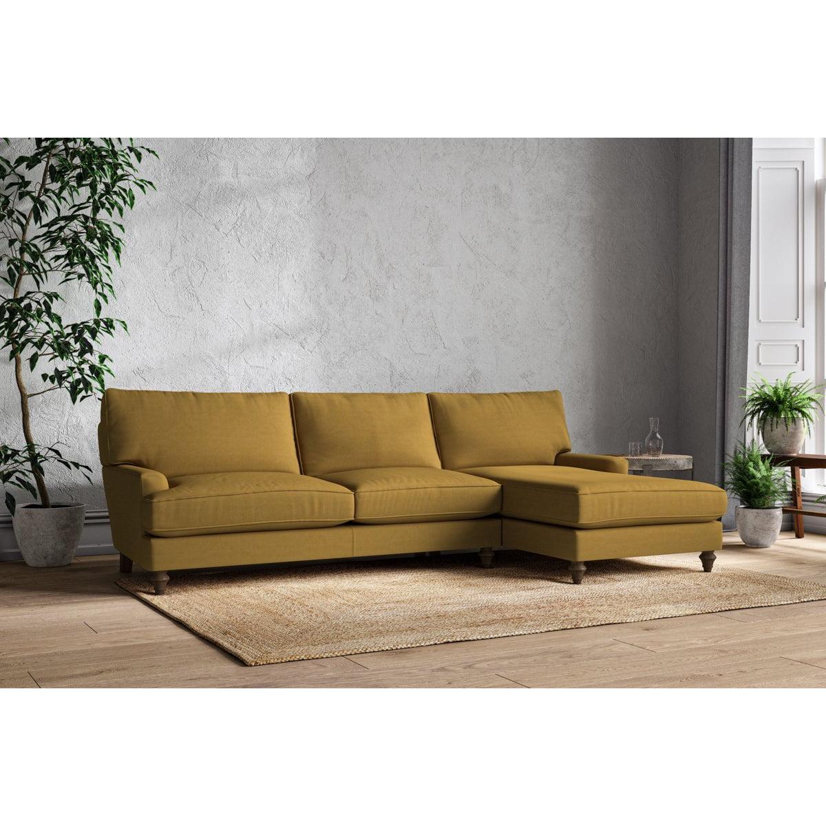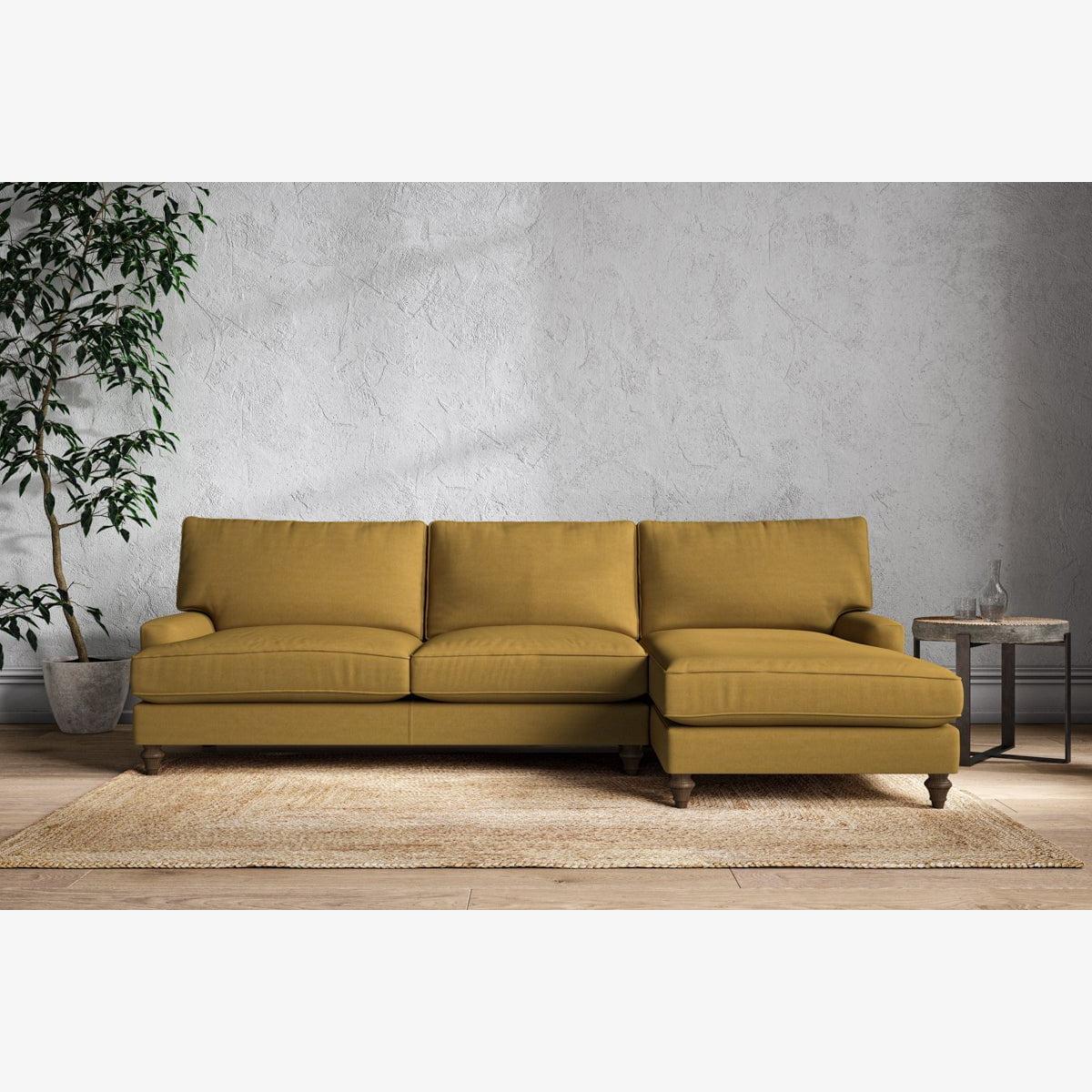 The classic design of our Marri grand right hand chaise sofa has a timeless appeal that suits almost any interior. Each piece is handcrafted by our specialist team in our Nottinghamshire workshop combining traditional techniques with exceptional craftmanship. Well-considered details ensure lasting quality, including piped edging, separate back cushions, and hand-turned hardwood feet. The hardwood frame and high-grade steel serpentine springs are selected for enduring quality, and the cushions are made from foam with a fibre wrap for added comfort. The fabric is hand cut to size, playing close attention to the characteristics of the material, and the sculpted hardwood feet provides the finishing detail. Our upholstery fabrics are chosen for their style and quality, where all fabrics are FR treated for domestic upholstery ensuring peace of mind as well as meeting specialist UK furniture requirements. Our curated colour palette offers a variety of sophisticated muted shades. Please note, our white background cut-out photography is shown in Natural for shape and style reference. Fabric Swatch Ordering We recommend ordering fabric swatches before placing your order, giving you the chance to feel the fabric and see your colour choices within your own home. You can order up to 6 free fabric swatches by clicking here. Before placing your order, it's important to take the time to measure the space you intend to place your made-to-order furniture to ensure it fits properly. You can read more in our Sofa Buying Guide.