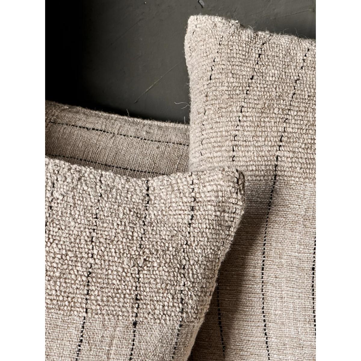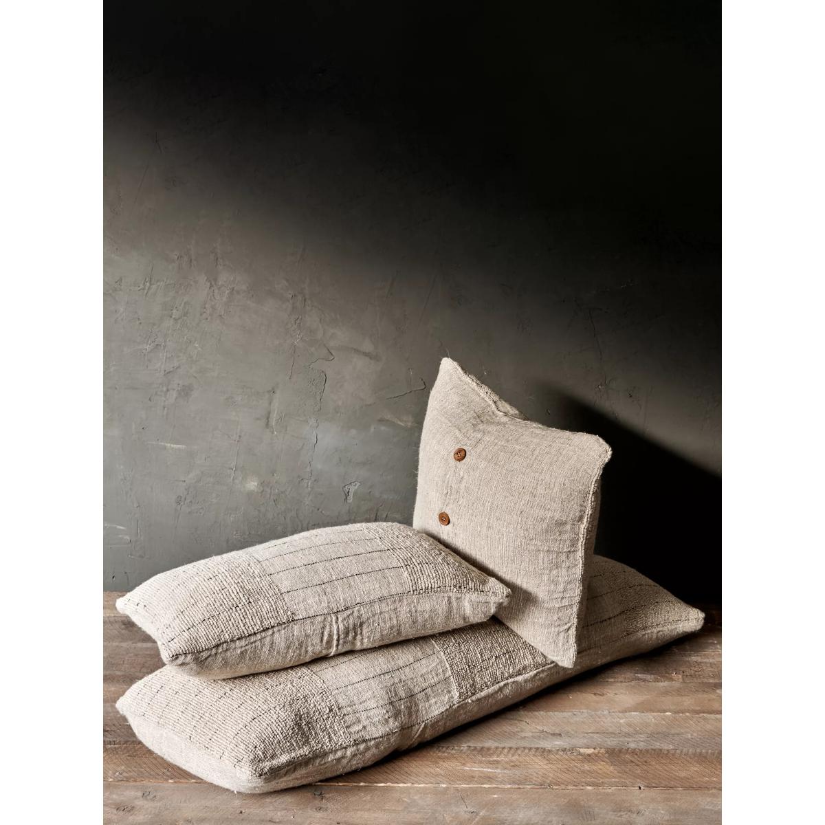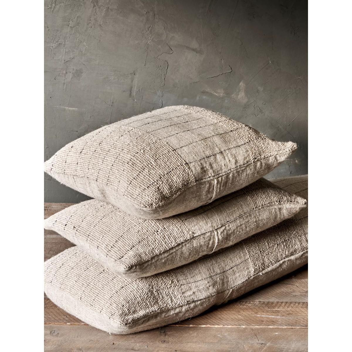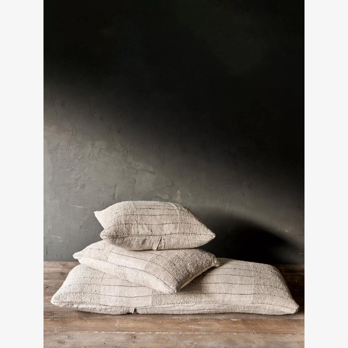 Mayla cushion covers have a rustic, textured look. Made from a blend of linen and cotton, the neutral tones create a calm aesthetic and are enhanced by black lines, hand stitched by skilled artisans in India. Each cushion cover is handwoven, using age-old methods and traditional hand looms. Cushion pad not included.