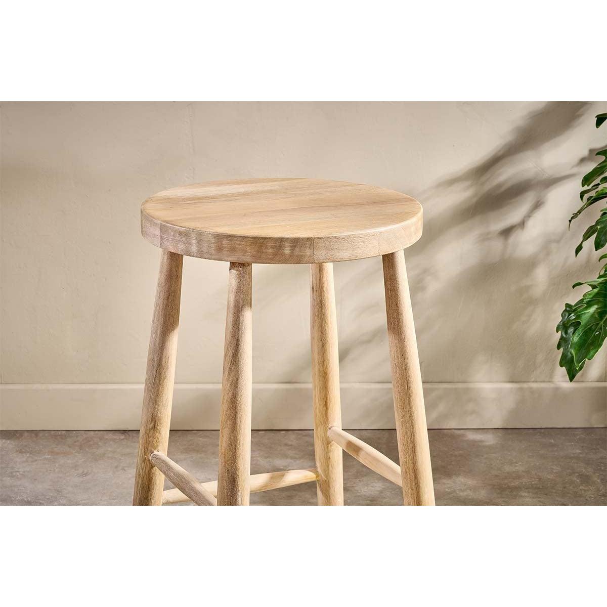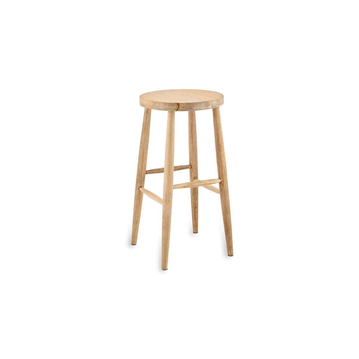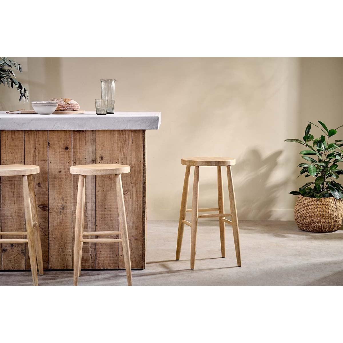 The Mengwi round bar stool marries sustainable mango wood with traditional carpentry in a simple and understated design. The natural grain creates a tactile and appealing texture that enhances the stool’s rustic look. It has four tapered legs and a practical wooden footrest. The Mengwi is the perfect place to perch or display a vase or planter. | nkuku Mengwi Mango Wood Round Bar Stool | Seating | Natural