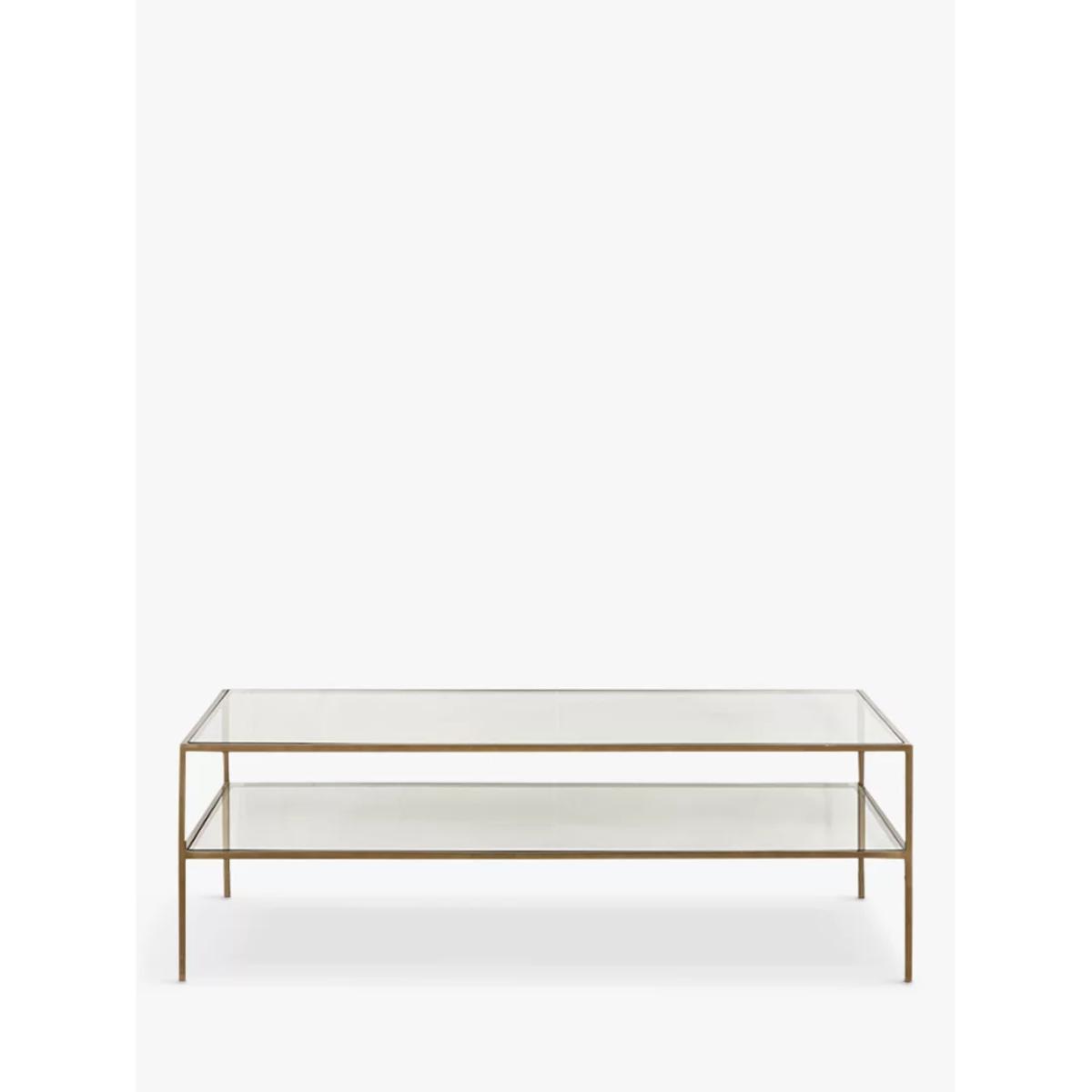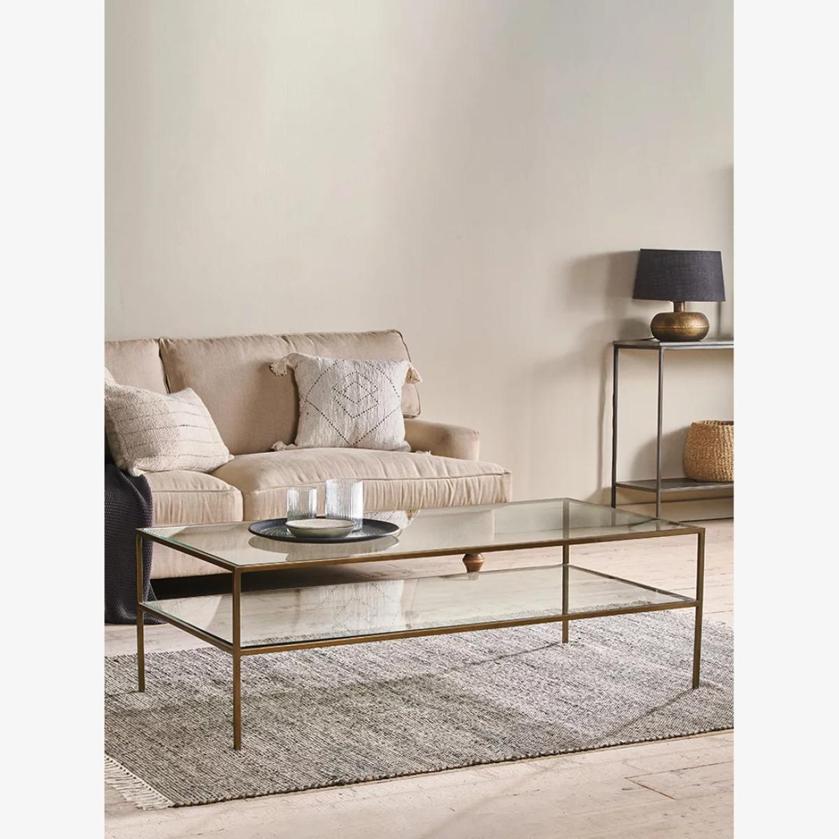 The Nkuku Nakuru coffee table is as practical as it is stylish. Its generous size makes it ideal for arranging in front of a sofa, while the practical glass shelf is perfect for storing books or decorative items, leaving the top clear for drinks or flowers. The brass finish makes this table stand out, while the glass tabletop and shelf offer an understated, classic feel. The frame is made from sturdy iron and welded into a beautifully elegant shape. Handmade by skilled artisans in India using traditional techniques. To care for the glass, use a glass cleaner or wash in warm soapy water. Metal surfaces can be cleaned using a damp cloth. Do not use anything abrasive, or use harsh chemicals. Dry and polish with a soft, non-abrasive cloth.