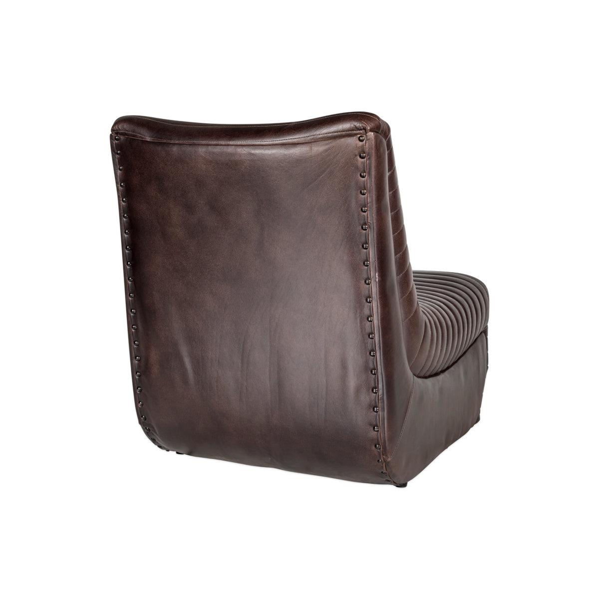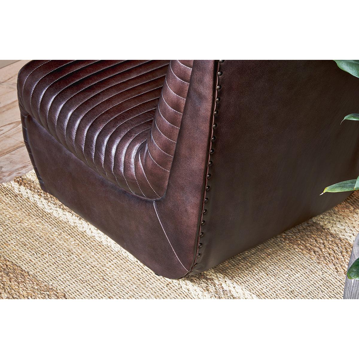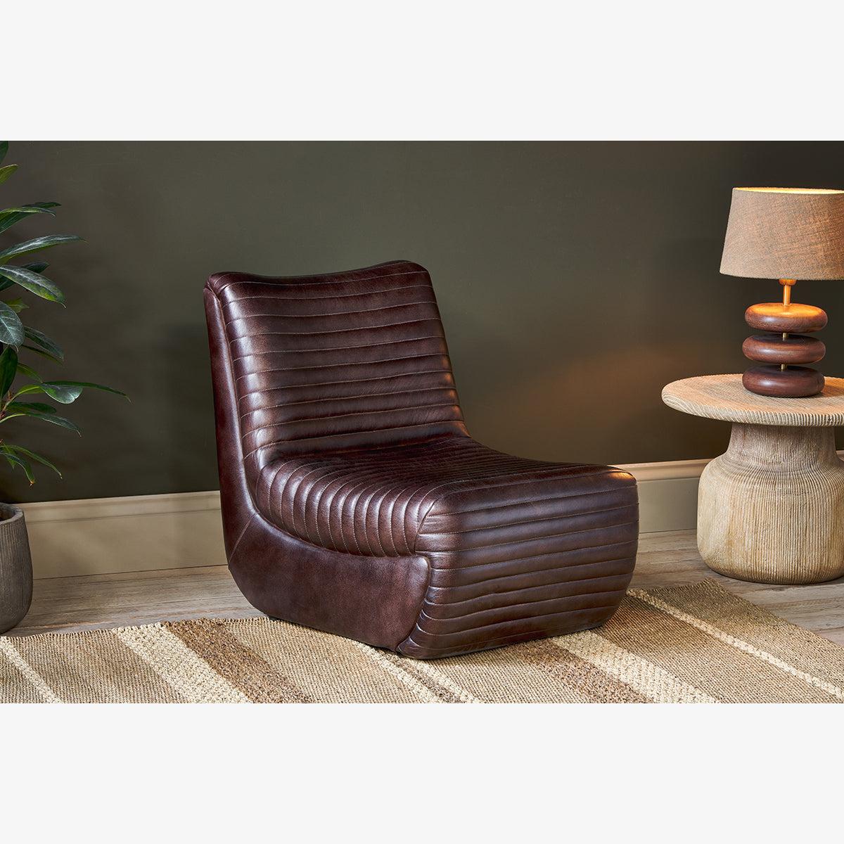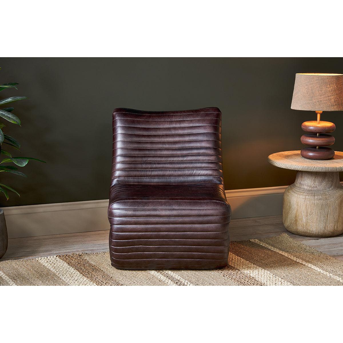 Our Navya Leather chair is upholstered in a rich, dark brown buffalo leather, and stitched to give a striking horizontal ribbed finish. This striking piece offers low, relaxed seating that makes a beautiful statement piece in any home, bringing effortless style and comfort to a contemporary room or traditional living space. The buffalo leather upholstery is a by-product and is dyed using vegetable extract and tree bark which means the leather colour will enrich further with time.