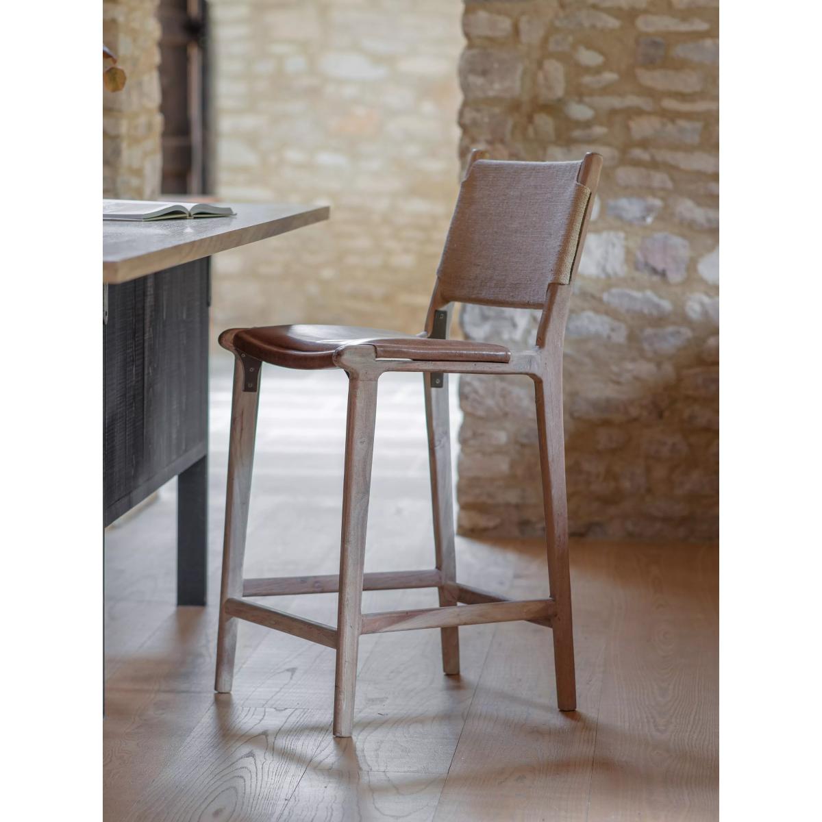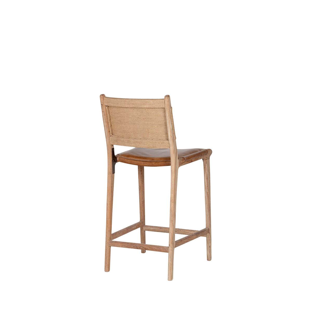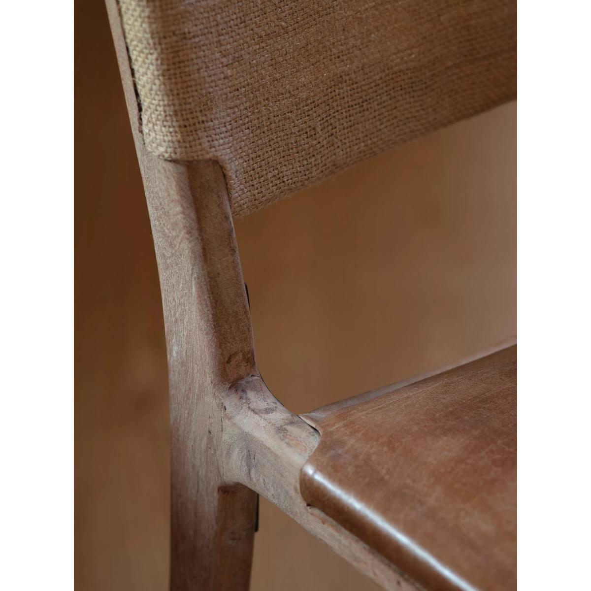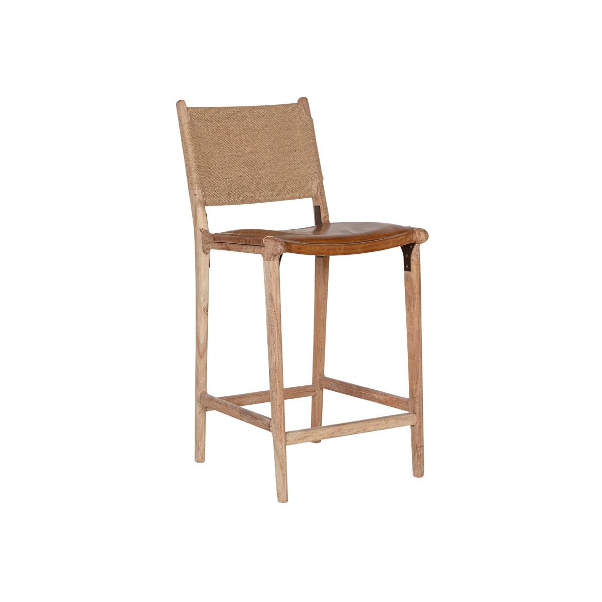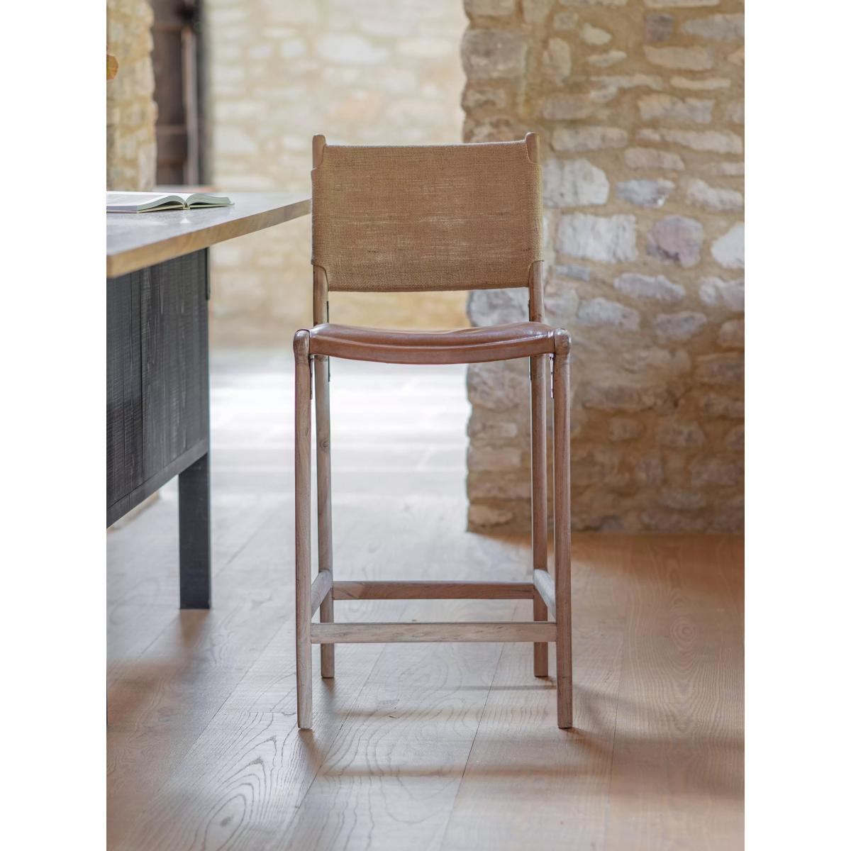 The simplicity of this Nayan leather and jute counter chair allows the craft skills and natural materials to shine through. The mango wood frame is beautifully turned and hand-carved, creating an elegant base for the generously proportioned buffalo leather seat in aged tan. With a subtle lacquered finish, it has been designed to age well over time, gaining a patina that becomes even more beautiful as it ages. Padded and comfortable, the seat is finished with antique brass rivets for added detail, while the understated back support is made from woven jute, creating a chair that sits just as happily at a kitchen counter as it does at a bar.
