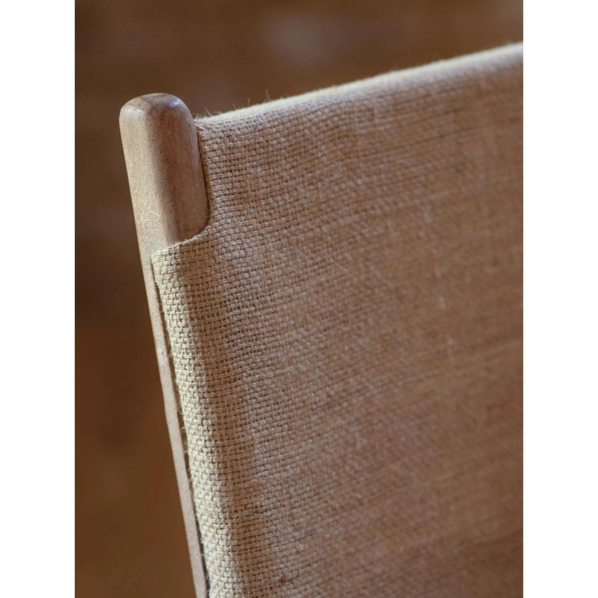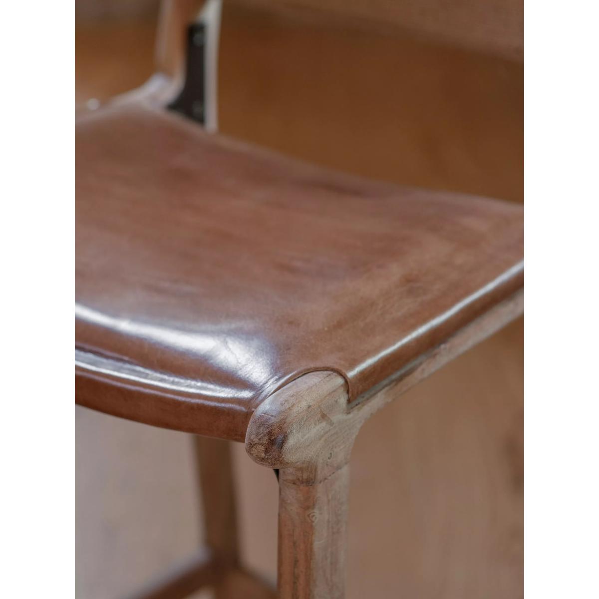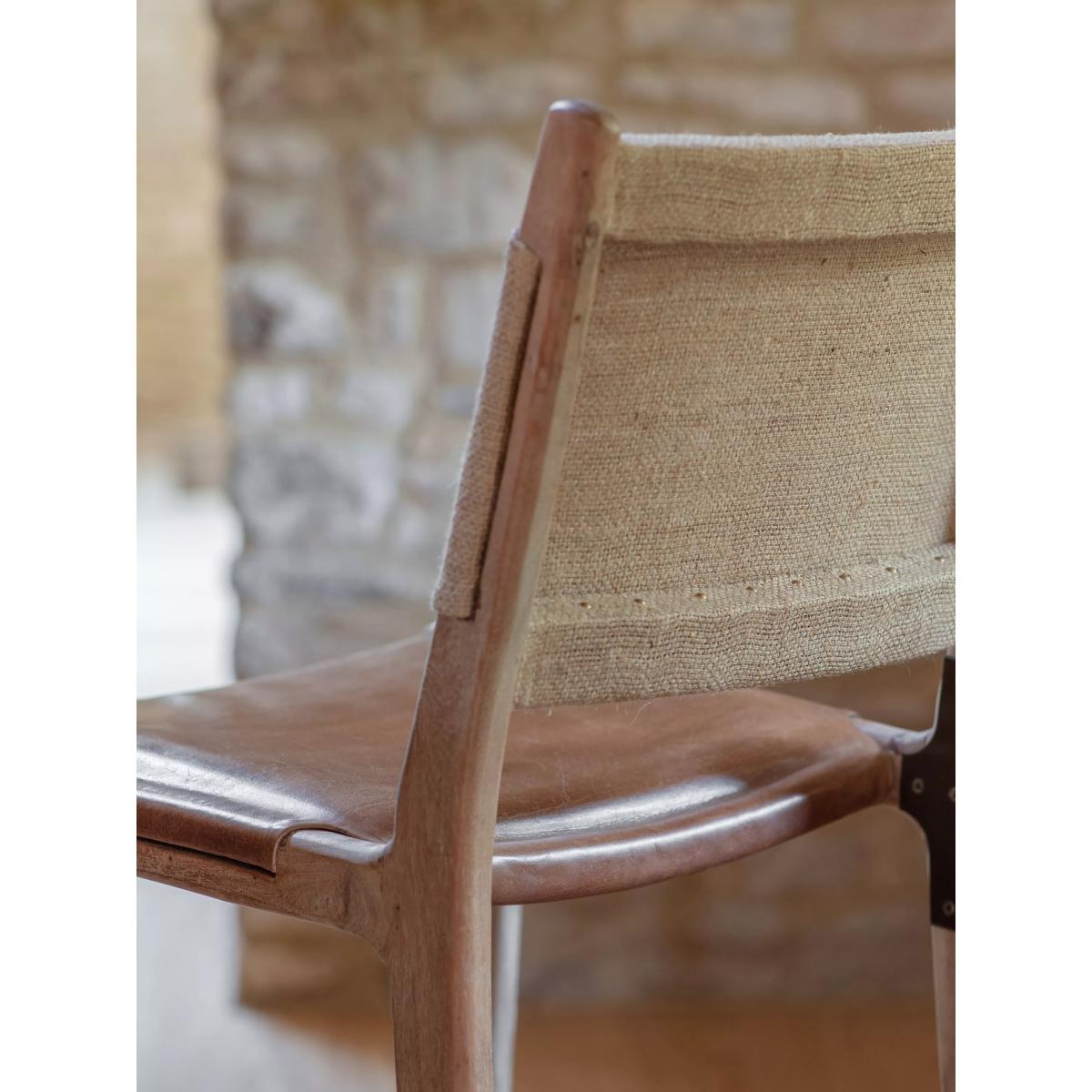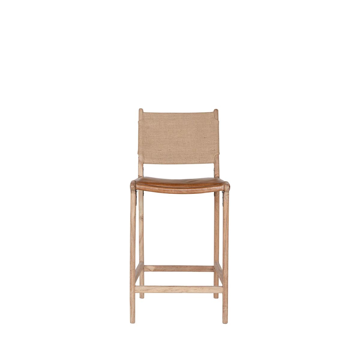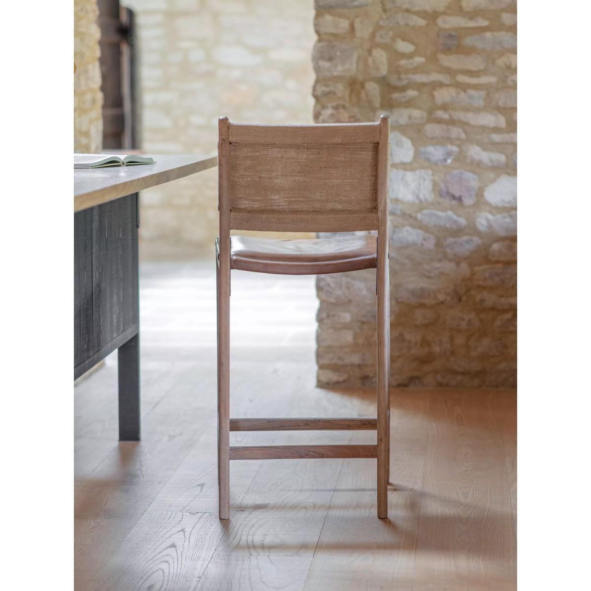 The simplicity of this Nayan leather and jute counter chair allows the craft skills and natural materials to shine through. The mango wood frame is beautifully turned and hand-carved, creating an elegant base for the generously proportioned buffalo leather seat in aged tan. With a subtle lacquered finish, it has been designed to age well over time, gaining a patina that becomes even more beautiful as it ages. Padded and comfortable, the seat is finished with antique brass rivets for added detail, while the understated back support is made from woven jute, creating a chair that sits just as happily at a kitchen counter as it does at a bar.