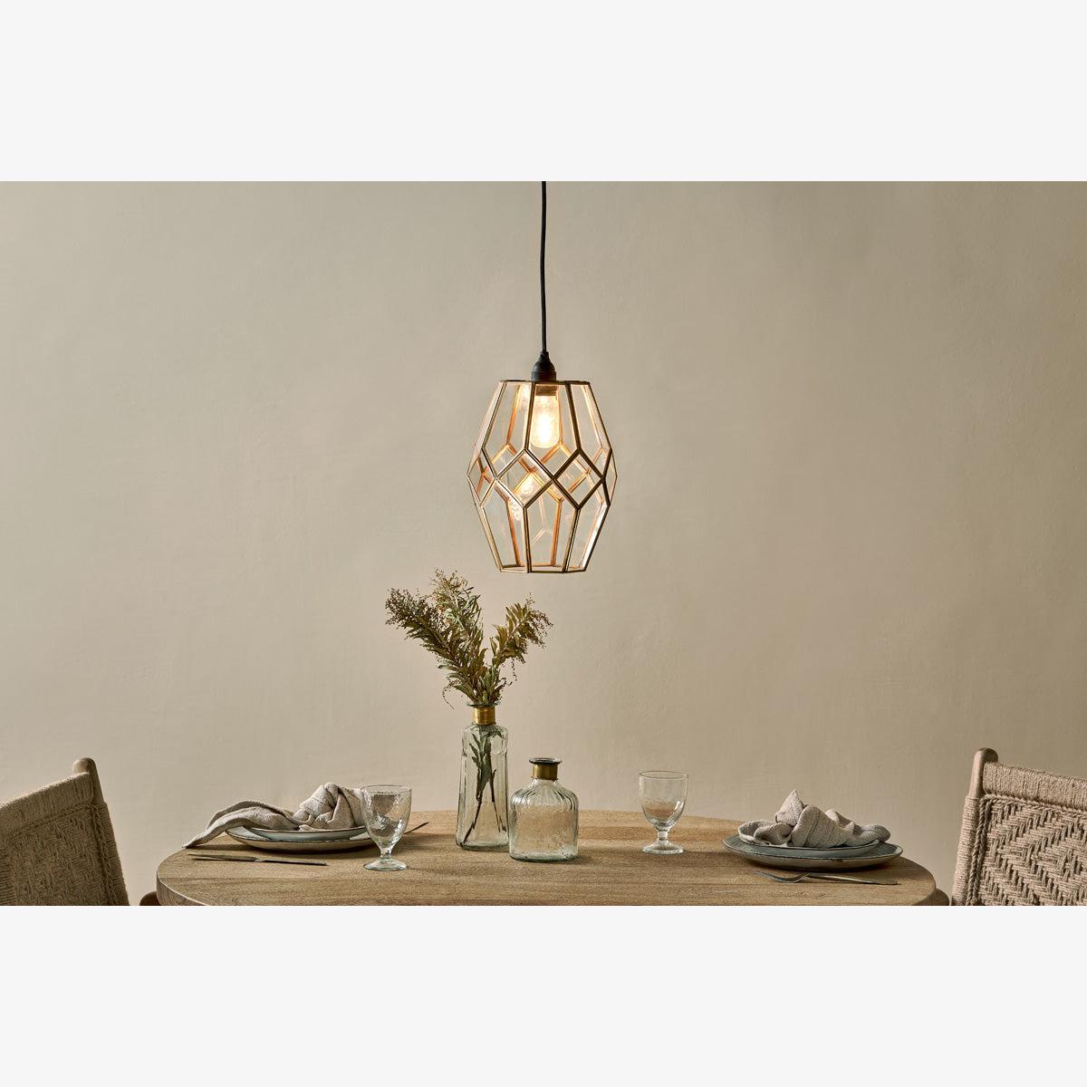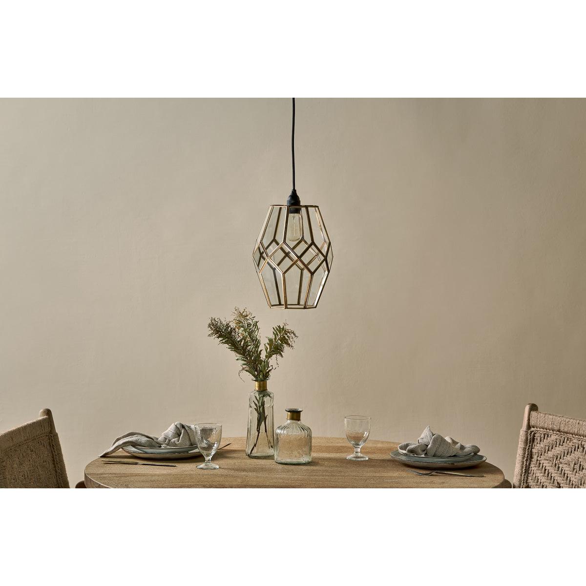 I love this nkuku Nazat panelled glass shade for its clean, modern look paired with an elegant vintage touch thanks to the antique brass finish. It’s versatile enough to work well in both contemporary and eclectic interiors, especially when you want to create a warm, inviting atmosphere. For styling, consider hanging it over a dining table or kitchen island to add a subtle statement, or combine multiple in a cluster for a more dramatic impact. Its glass panels lend themselves to a soft diffuse of light, making it a practical choice for spaces that need elegant illumination without overwhelming brightness. Pair it with warm-toned filament bulbs to enhance its vintage vibe and add extra warmth to your space.