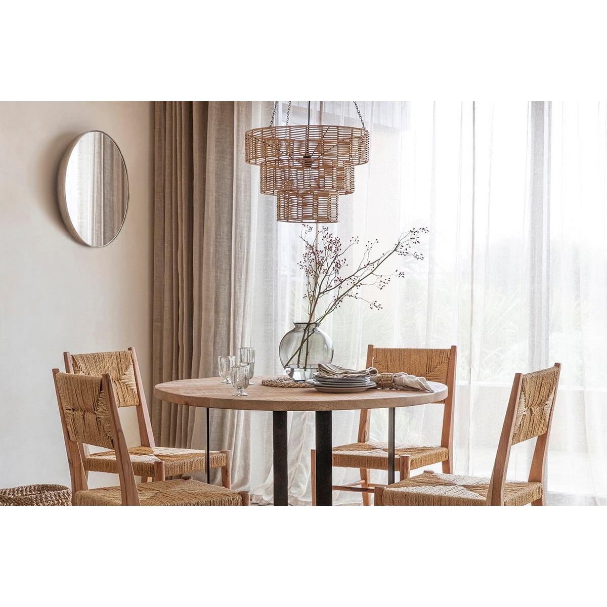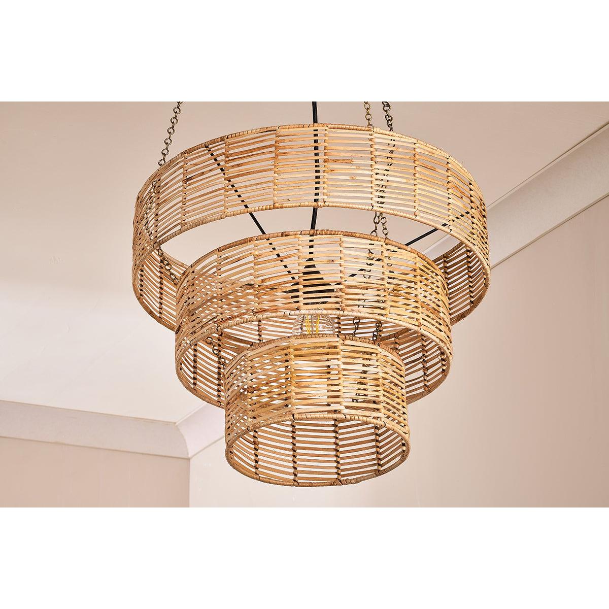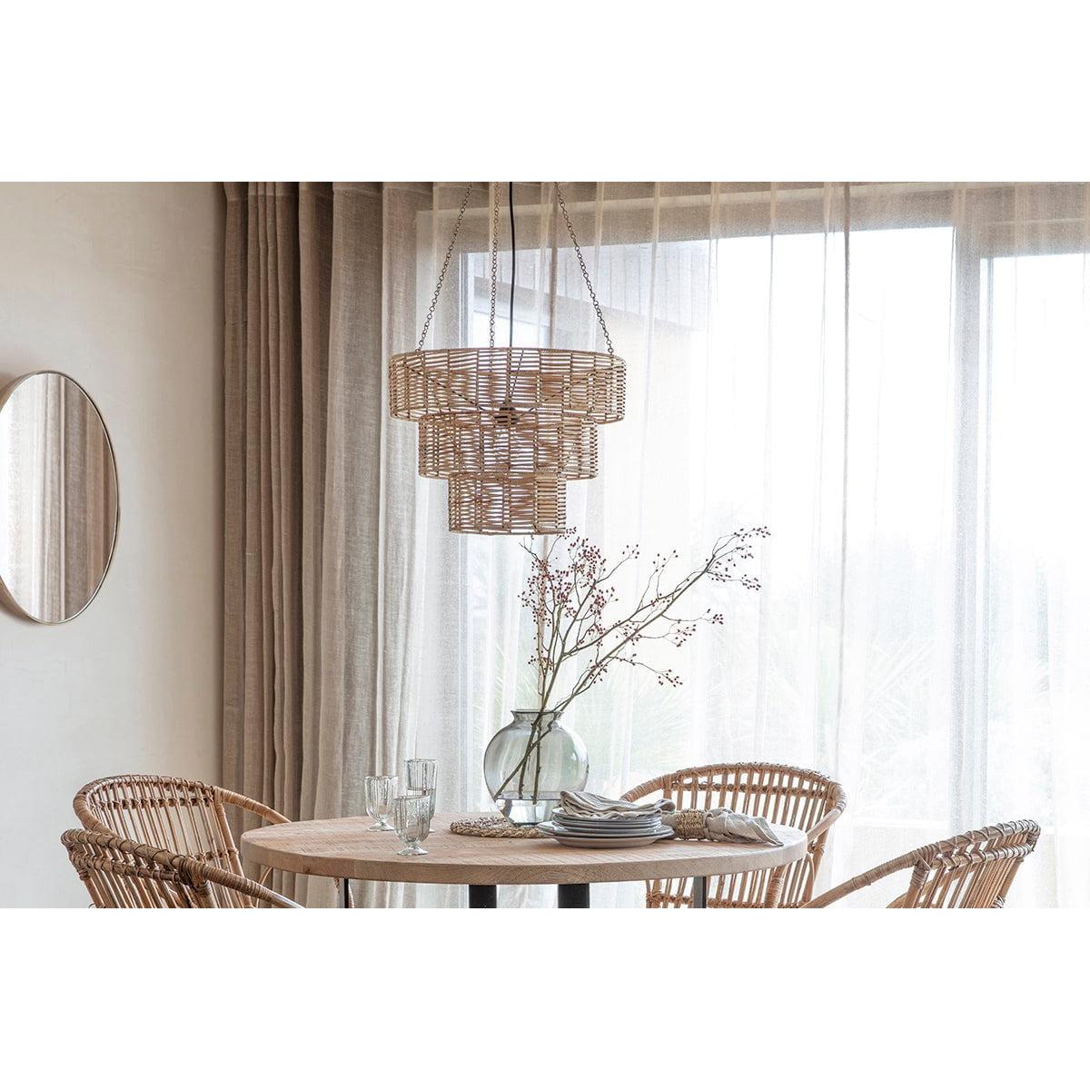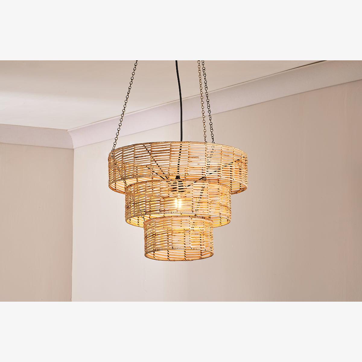 The Noko rattan chandelier is the perfect antidote to traditional elaborate chandeliers but is no less standout. Warm wicker has been skilfully woven into three attractive tiers to create a room-defining, statement light that retains a relaxed and natural feel. The varied and mellow hues of the chandelier marry beautifully with other neutral tones, making it a versatile piece. The intricate wicker work acts as an elegant filter for the light within casting pretty shadows and adding to a harmonious mood.