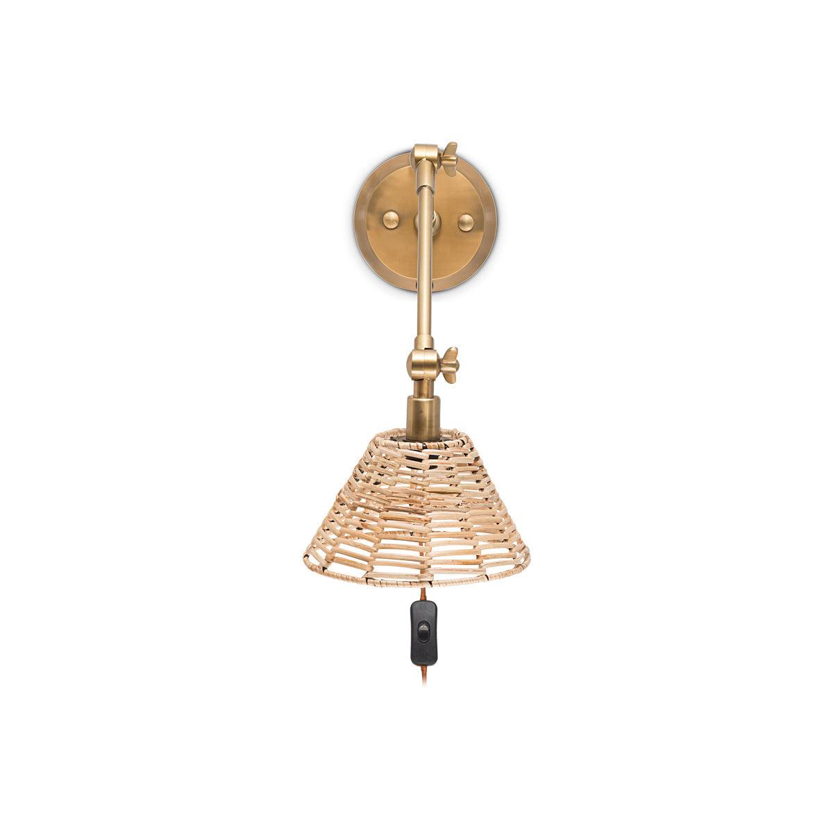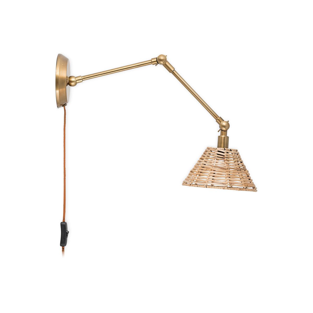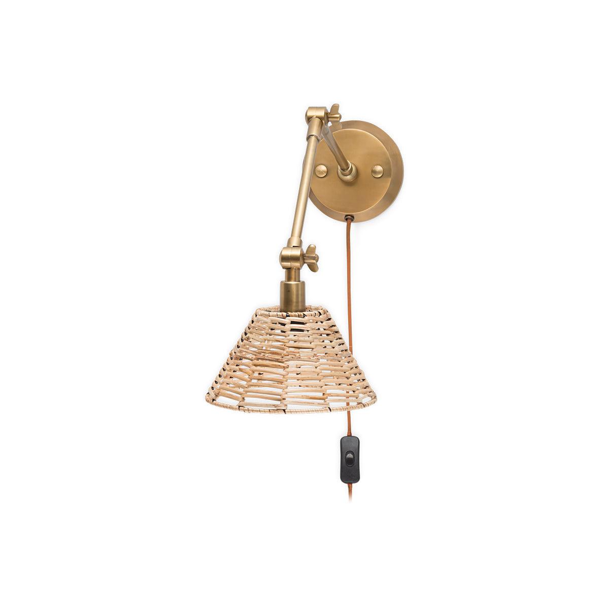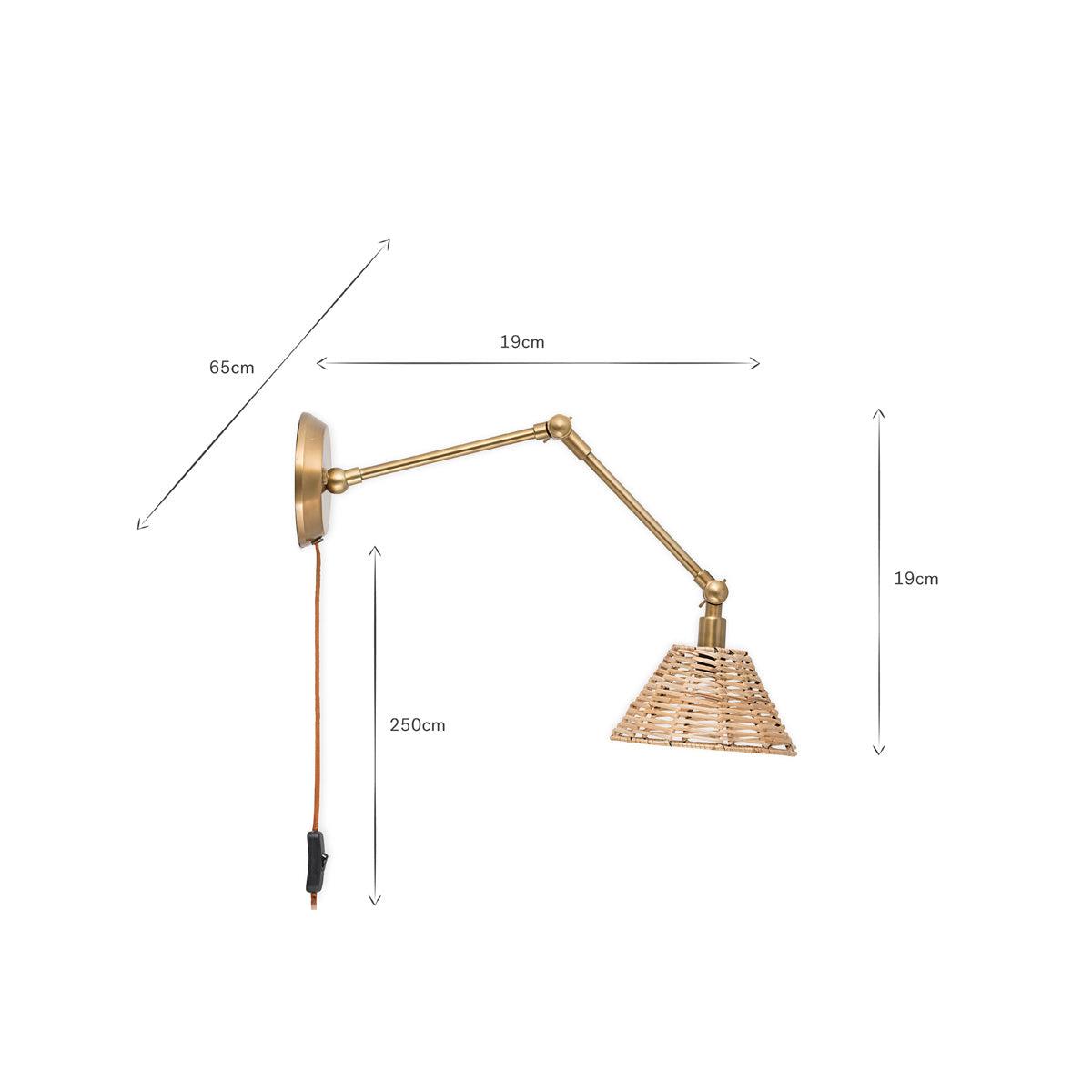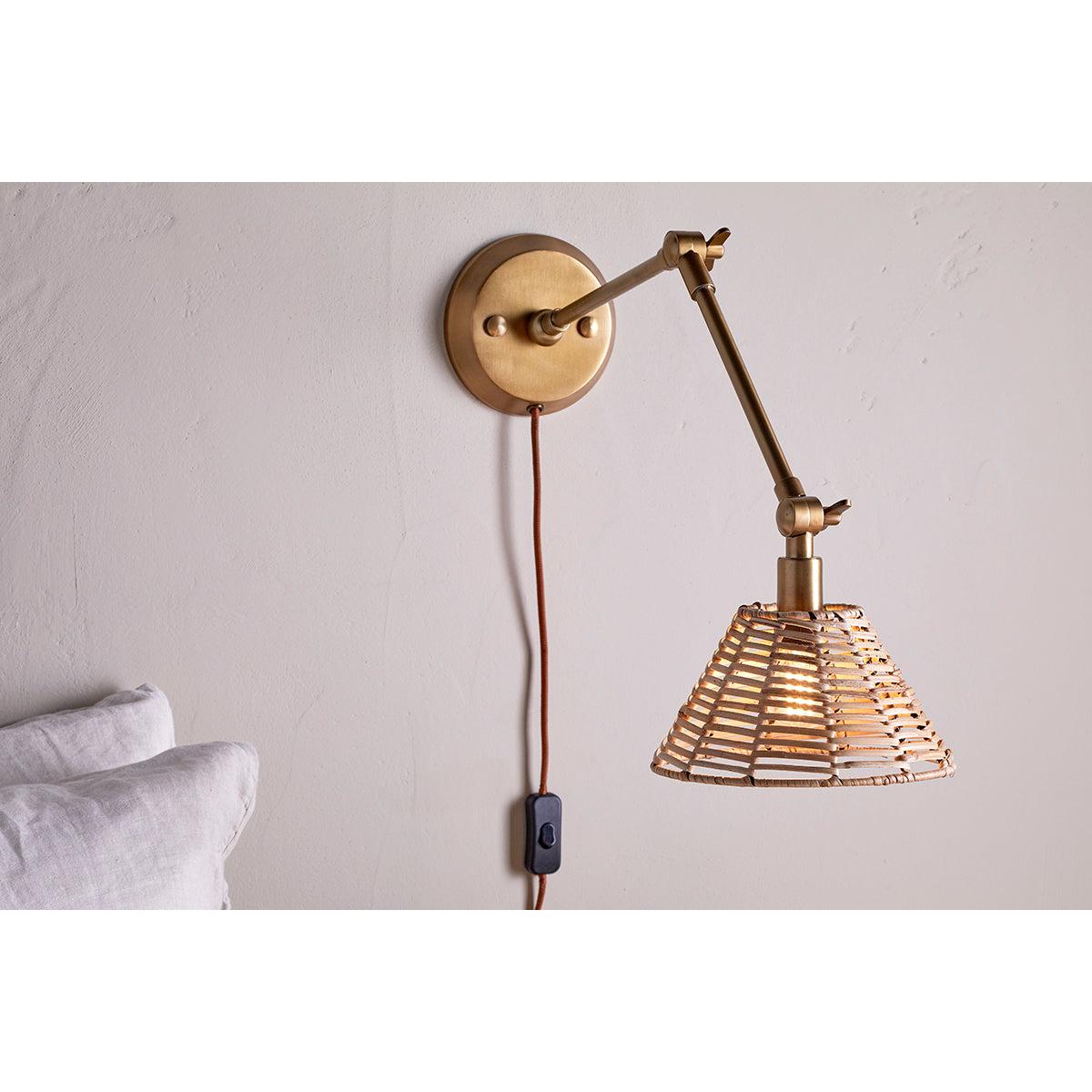 Skilfully handwoven using age-old techniques, the rattan shade has an organic aesthetic which is rich in character and texture. This design also lets the light shine through the gaps in the weave, creating a warm ambient glow. The natural tones of the rattan are complemented by the antique brass finish of the arm. This lamp can be plugged in eliminating the need for an electrician. Position as a pair on either side of a for an eye-catching display.