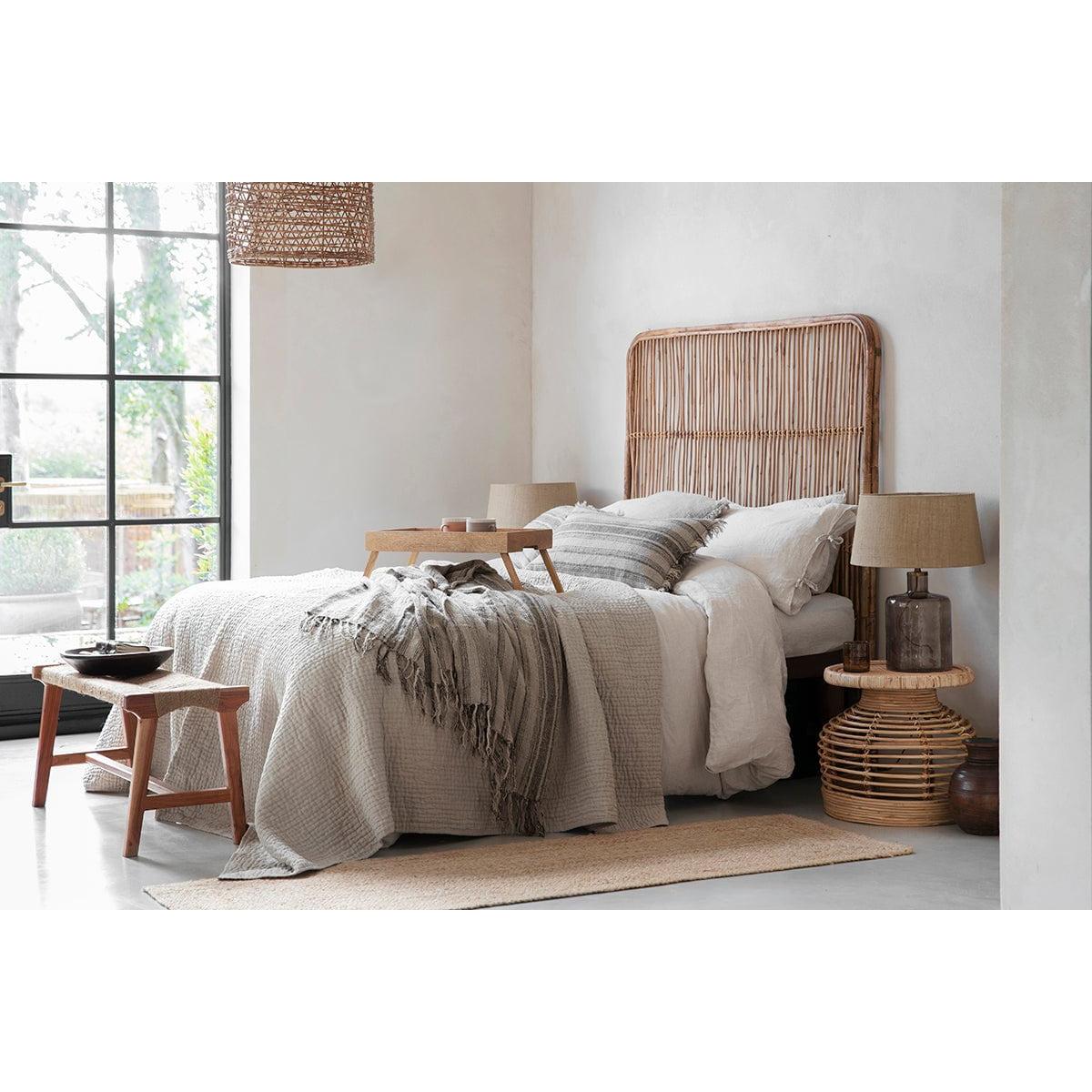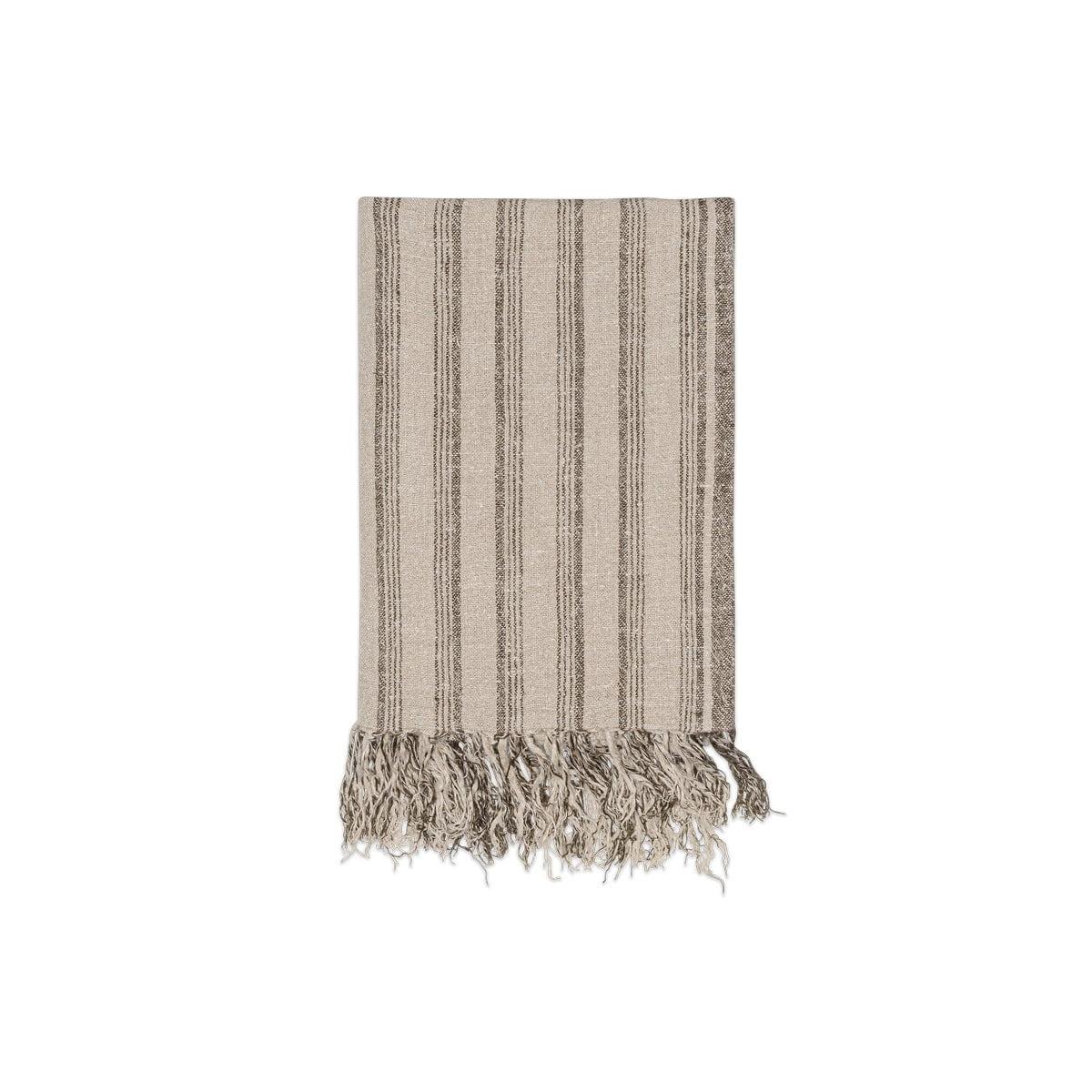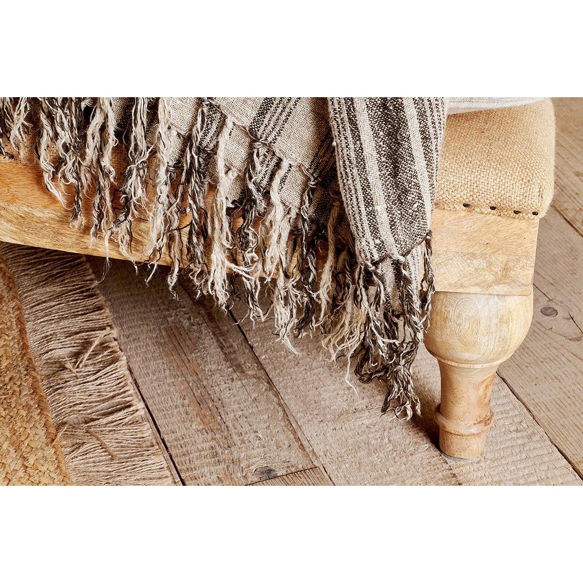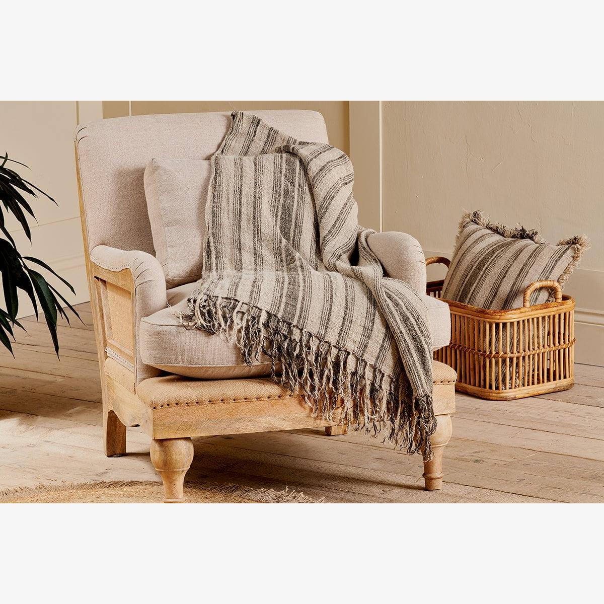 The Odisha throw blends natural and charcoal in an organic stripe. The colours work effortlessly together, forming a pared - back and timeless aesthetic. The Odisha throw is handwoven, and this is evident in the tactility of its weave. The linen has a 'slubby' feel that is complementented with the appealing stripe design. The neutrality of the charcoal and natural make it versatile, styled over a sofa, as a bed throw or out in the garden in an alfresco setting.