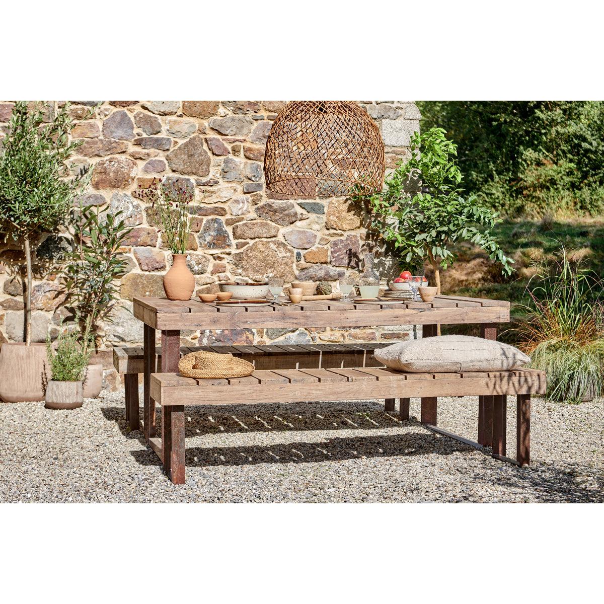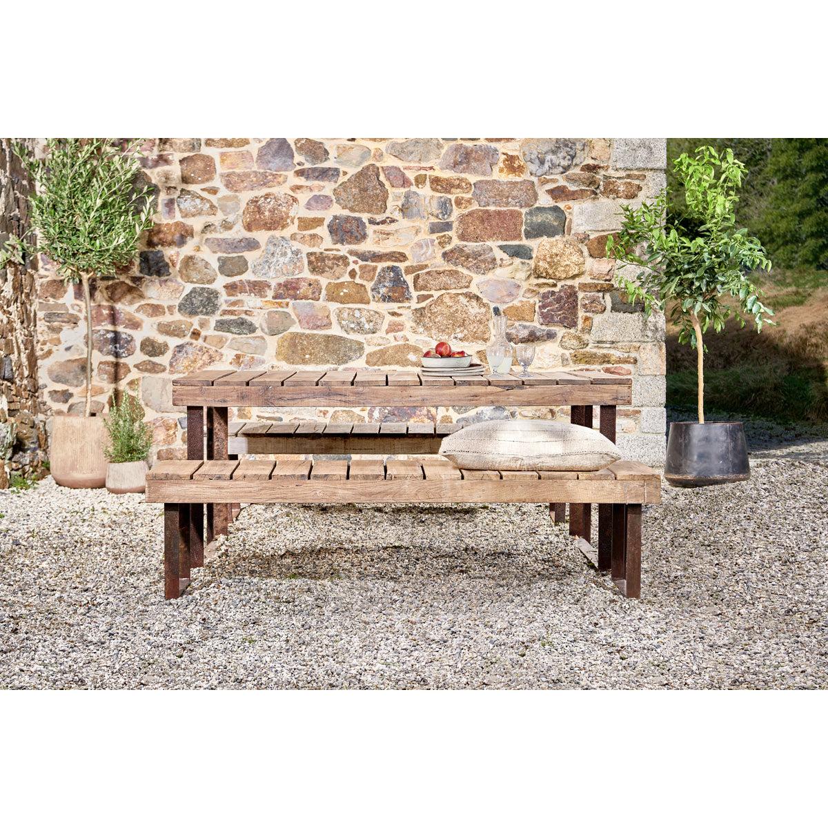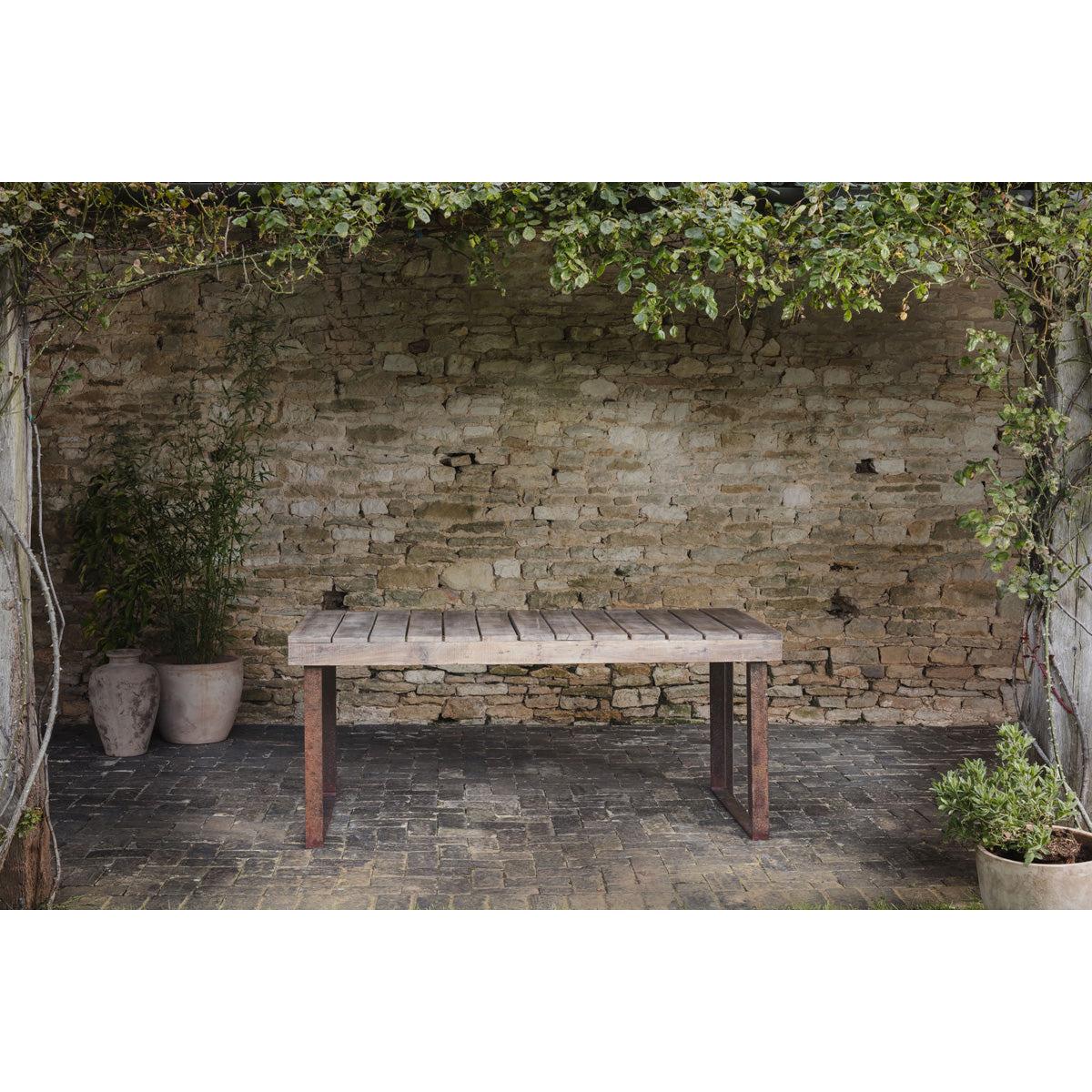 This Oso dining table is made from reclaimed wood that is rich with character and texture. The angular legs are constructed from sturdy iron, providing an eye-catching design twist that sharpens the reclaimed look of the piece. Dress an outside space, conservatory or terrace and pair with our Oso bench. As this item is made from reclaimed teak, there are imperfections in the wood. These include some cracks and marks on the wood. We believe these characteristics add to the look of piece and provide an attractive aged and weathered appearance. The reclaimed nature of these pieces means there are imperfections and weathered finishes. No two are the same. The legs of our Oso table are powder coated, creating a hard finish that is tougher than conventional paint. This makes them suitable for the garden.