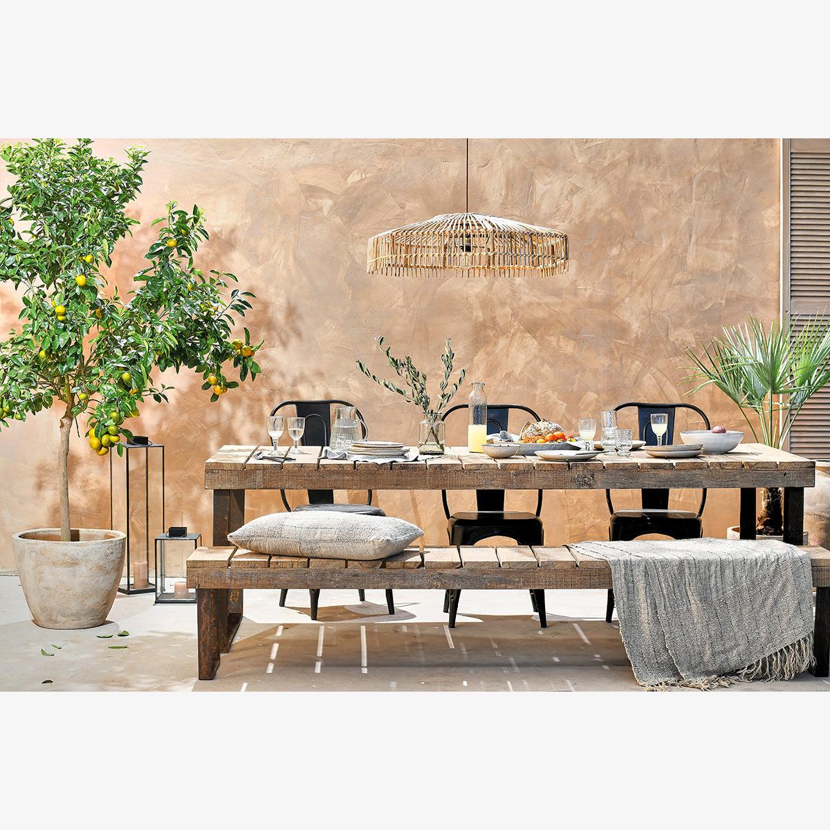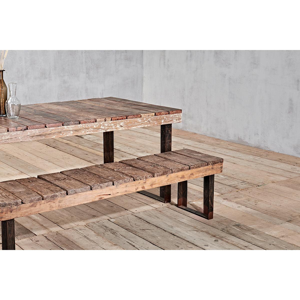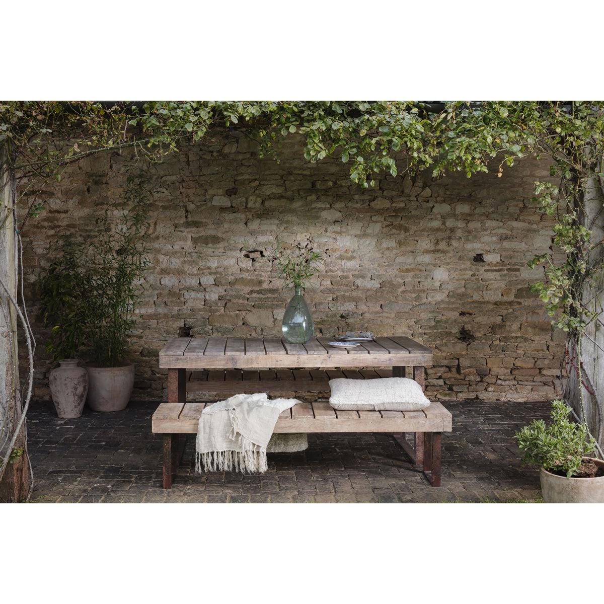 This Oso dining table is made from reclaimed wood that is rich with character and texture. The angular legs are constructed from sturdy iron, providing an eye-catching design twist that sharpens the reclaimed look of the piece. Dress an outside space, conservatory or terrace and pair with our Oso bench. As this item is made from reclaimed teak, there are imperfections in the wood. These include some cracks and marks on the wood. We believe these characteristics add to the look of piece and provide an attractive aged and weathered appearance. The reclaimed nature of these pieces means there are imperfections and weathered finishes. No two are the same. The legs of our Oso table are powder coated, creating a hard finish that is tougher than conventional paint. This makes them suitable for the garden.
