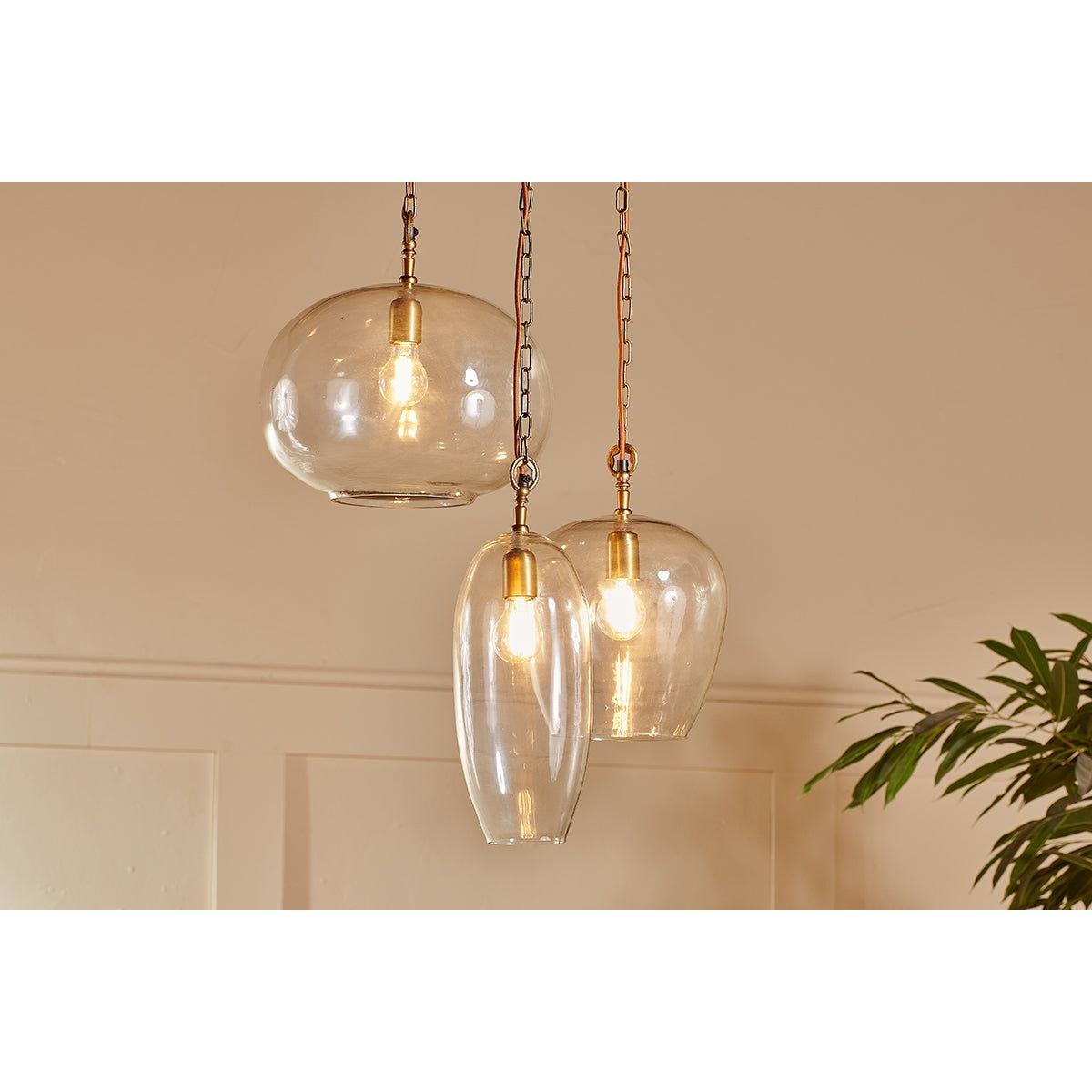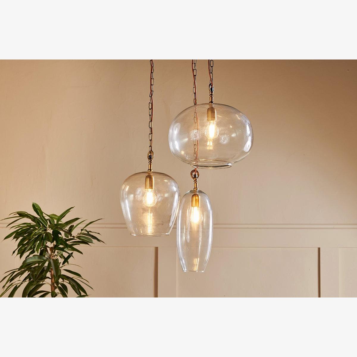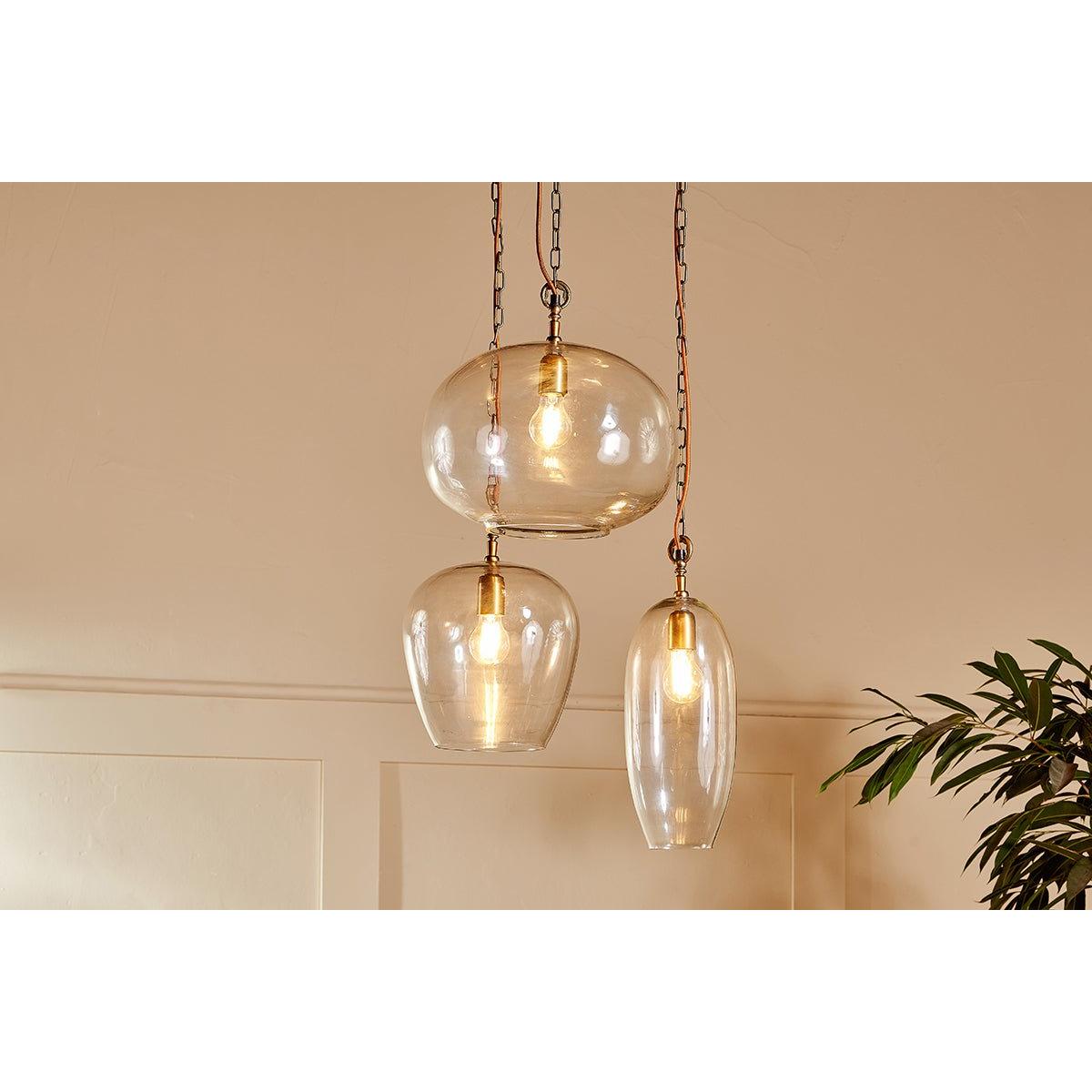 The Otoro statement pendant light is a truly standout piece. The different organic shapes of the Otoro recycled glass shades work beautifully together. The generous proportions of each light combine to create an exceptional pendant feature light that will elevate a space. This is a large statement piece that is well suited to a high ceilinged room or stair well. The Otoro glass lights are made from recycled glass. The simple black coloured fabric cable sits neatly in a brass ceiling rose. Each light is supported with a simple brass chain