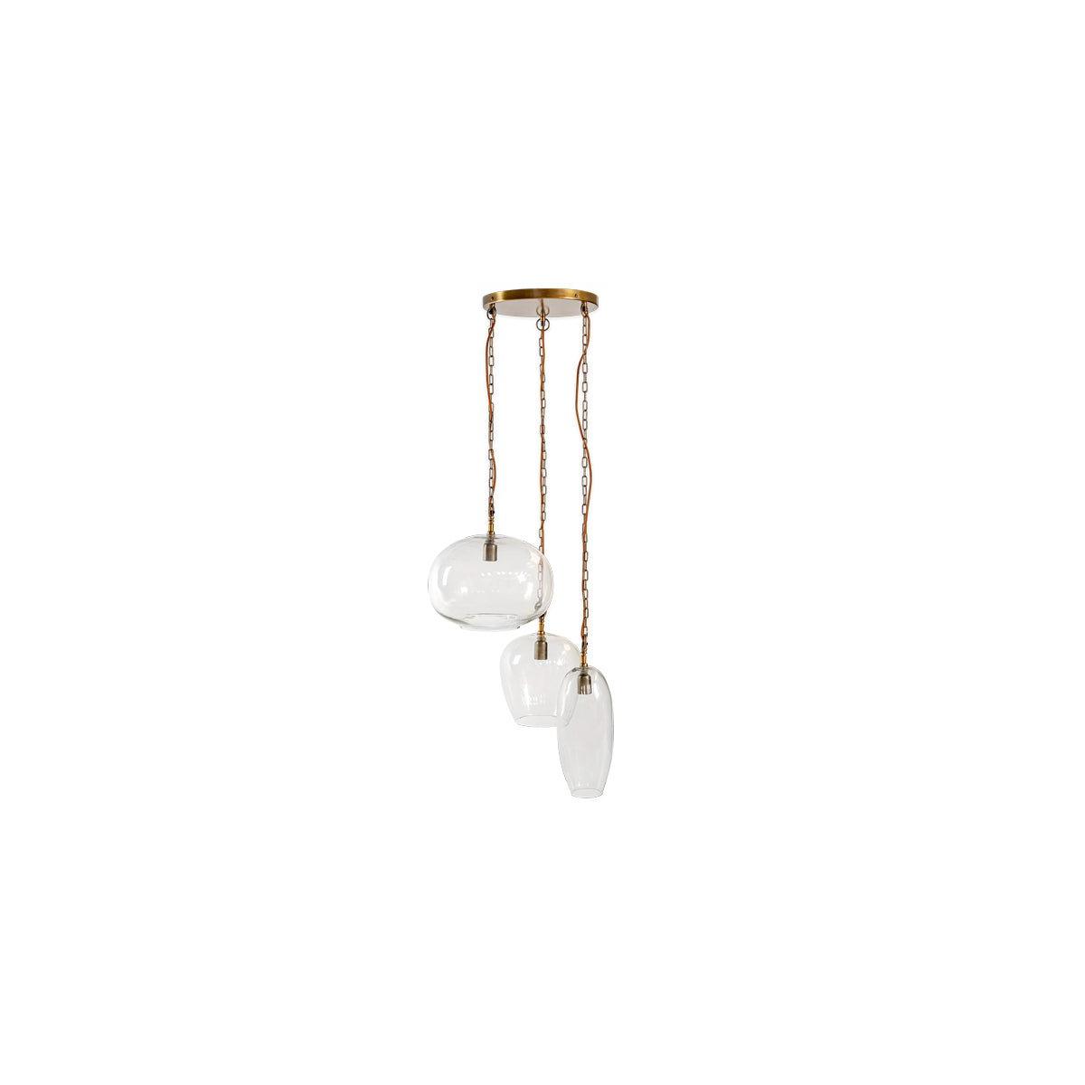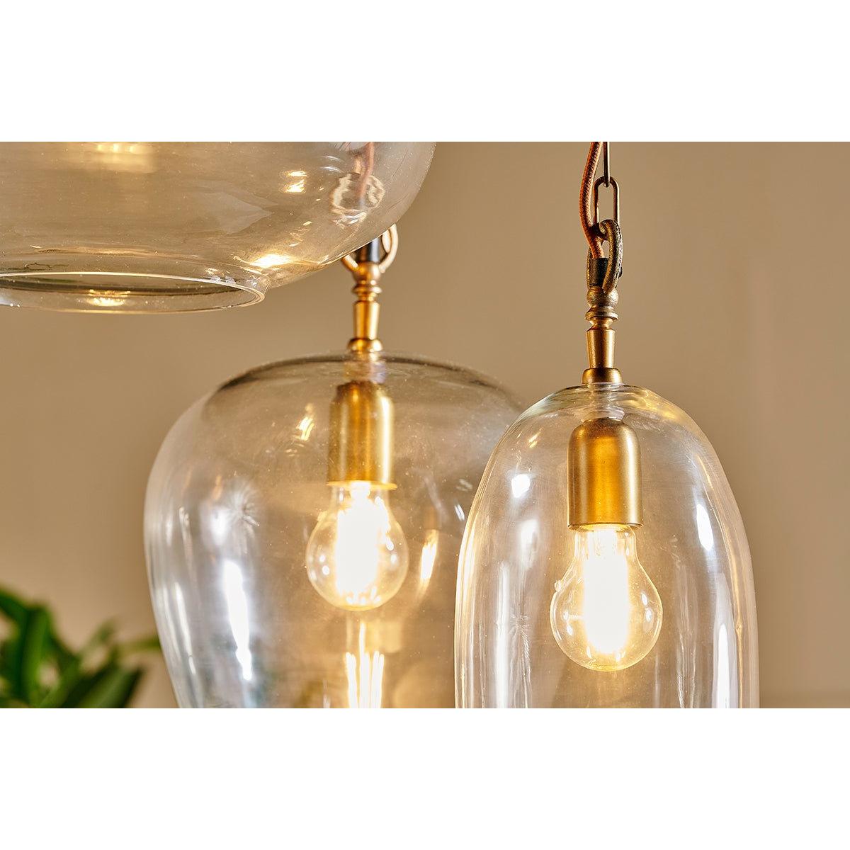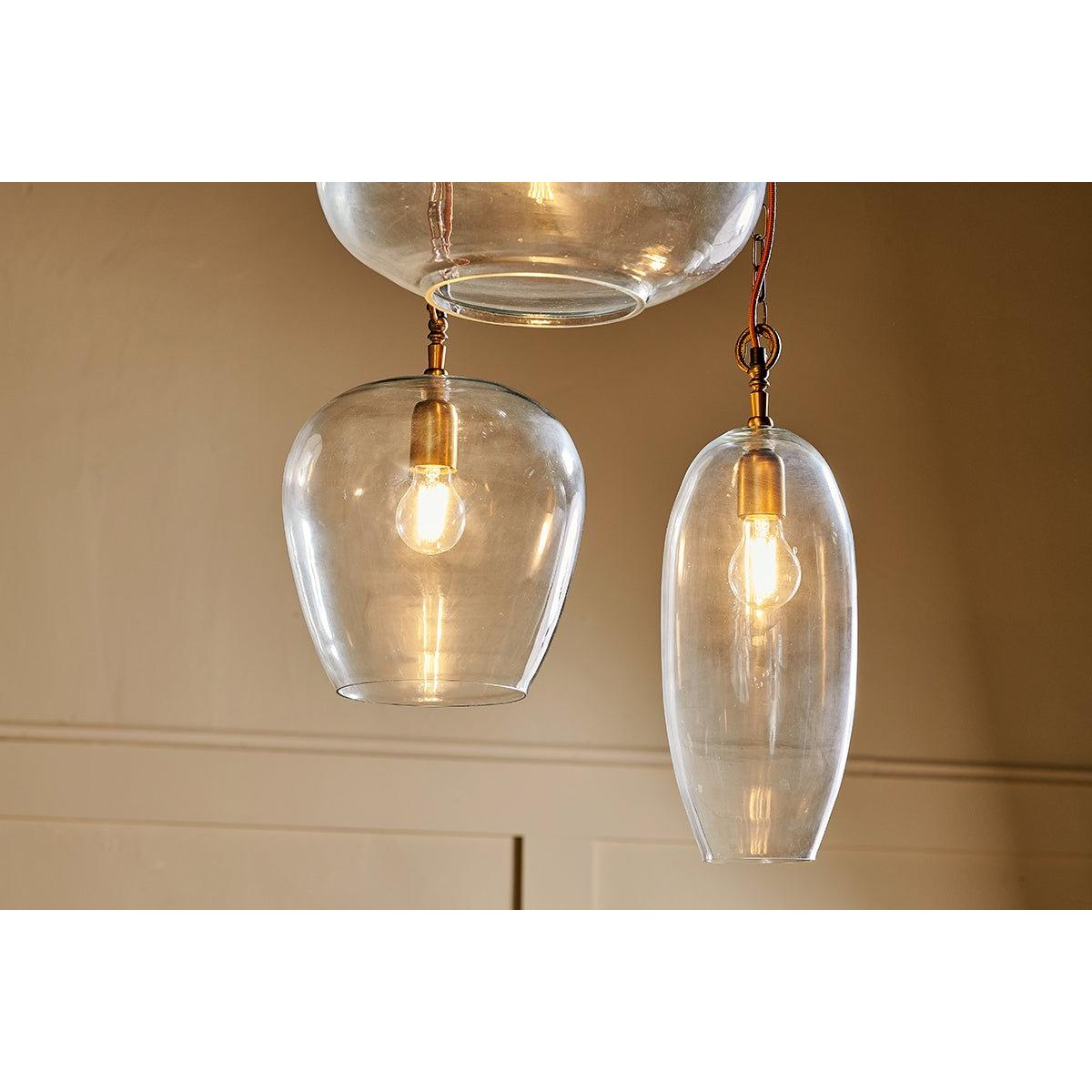 The Otoro statement pendant light is a truly standout piece. The different organic shapes of the Otoro recycled glass shades work beautifully together. The generous proportions of each light combine to create an exceptional pendant feature light that will elevate a space. This is a large statement piece that is well suited to a high ceilinged room or stair well. The Otoro glass lights are made from recycled glass. The simple black coloured fabric cable sits neatly in a brass ceiling rose. Each light is supported with a simple brass chain