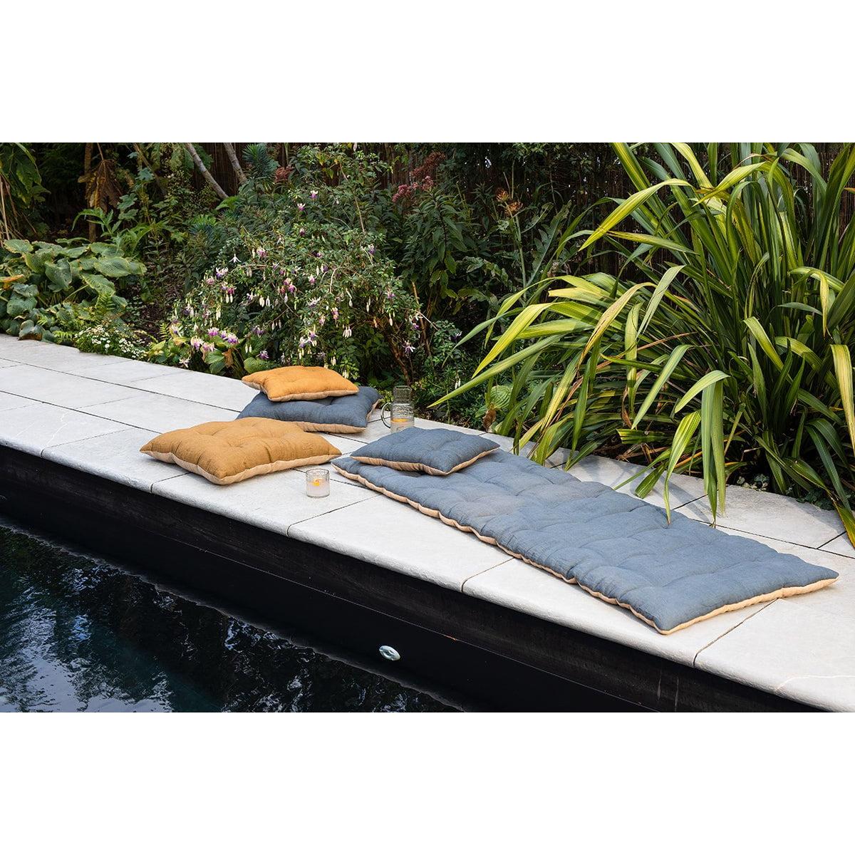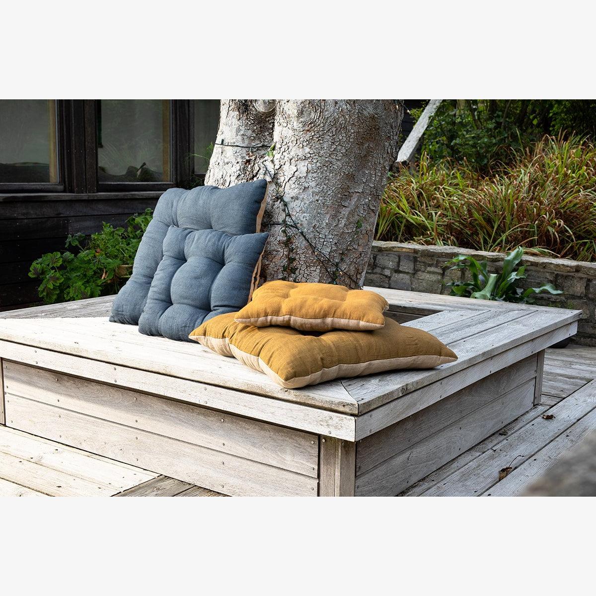 The earthy Mediterranean tones of the Panglao linen cushions feel subtle and sophisticated. These comfortable well padded cushions have an attractive button tuck detail that gives them form. The two tone design, slate on the top, and natural linen on the base, works beautifully together. Scatter them on a rug in the garden and create an informal seating space or use them inside as impromptu seating for extra guests. Generously proportioned the Panglao is the ideal floor lounging cushion. Style with the Panglao mattress for indulgent informal seating. The Panglao styles perfectly with our Nesari Rattan furniture collection.