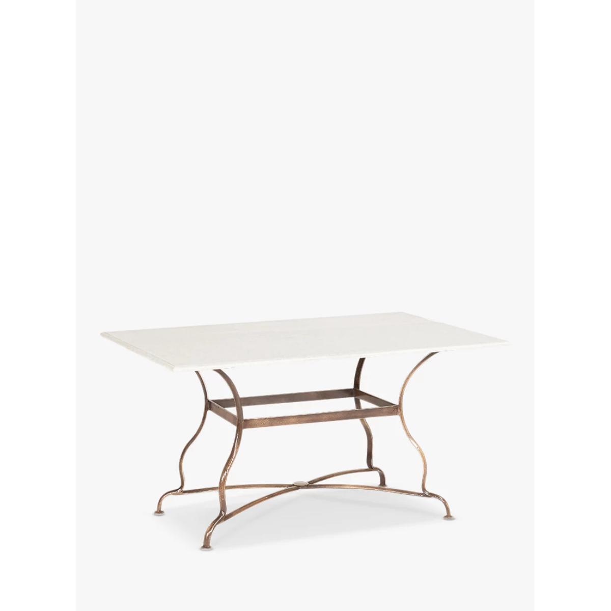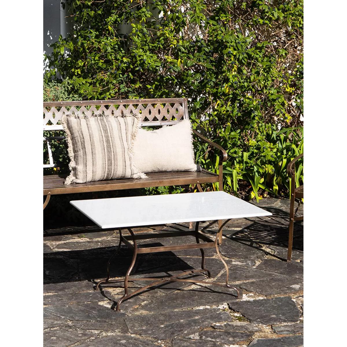 The Parwaha marble coffee table makes an elegant addition to any garden setting. The appealing off-white tones feel summery and light, blending effortlessly into an outdoor landscape. The smooth surface of the marble makes it a pleasure to use while the elegant iron legs offer an interesting design detail as well as providing sturdy and enduring support. Parwaha has a timeless look that is at home on a townhouse balcony as it is a country garden.