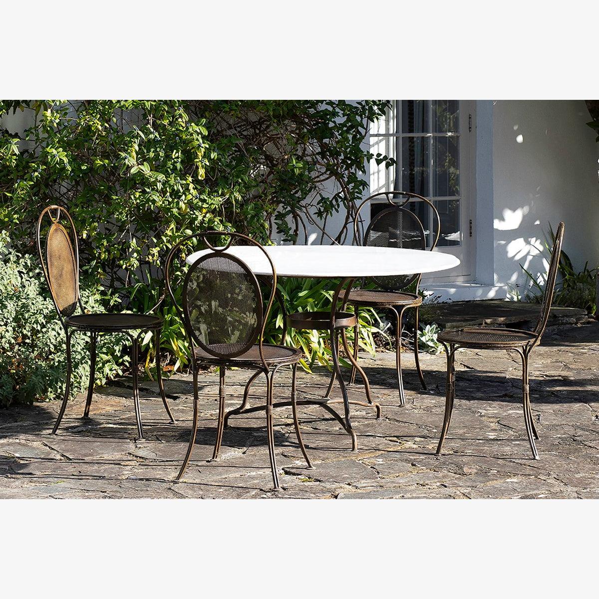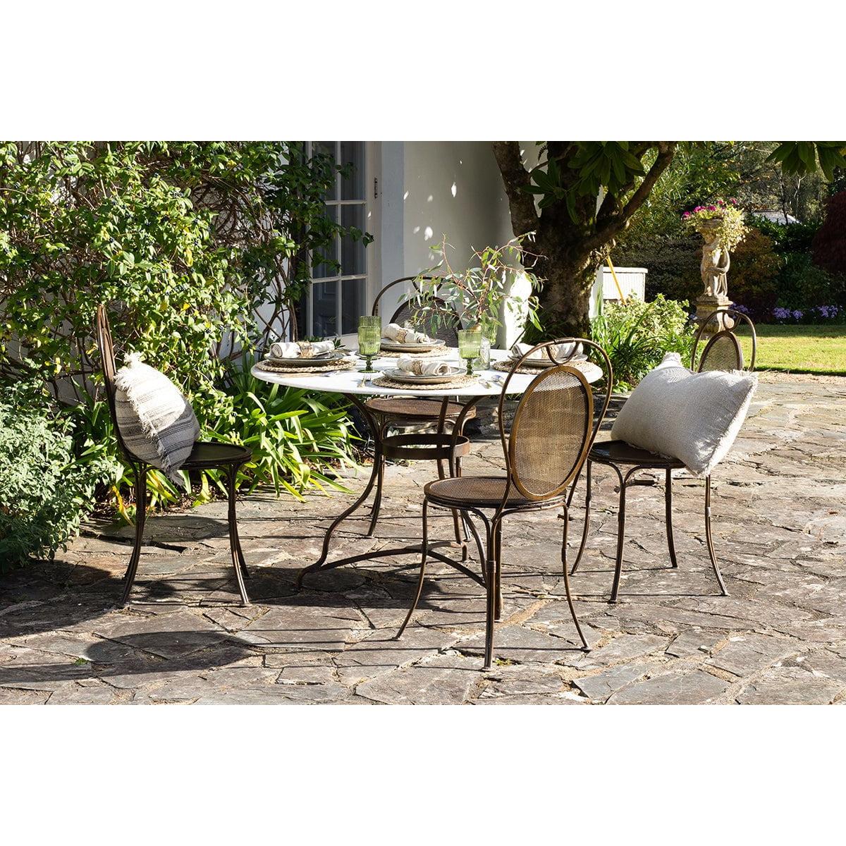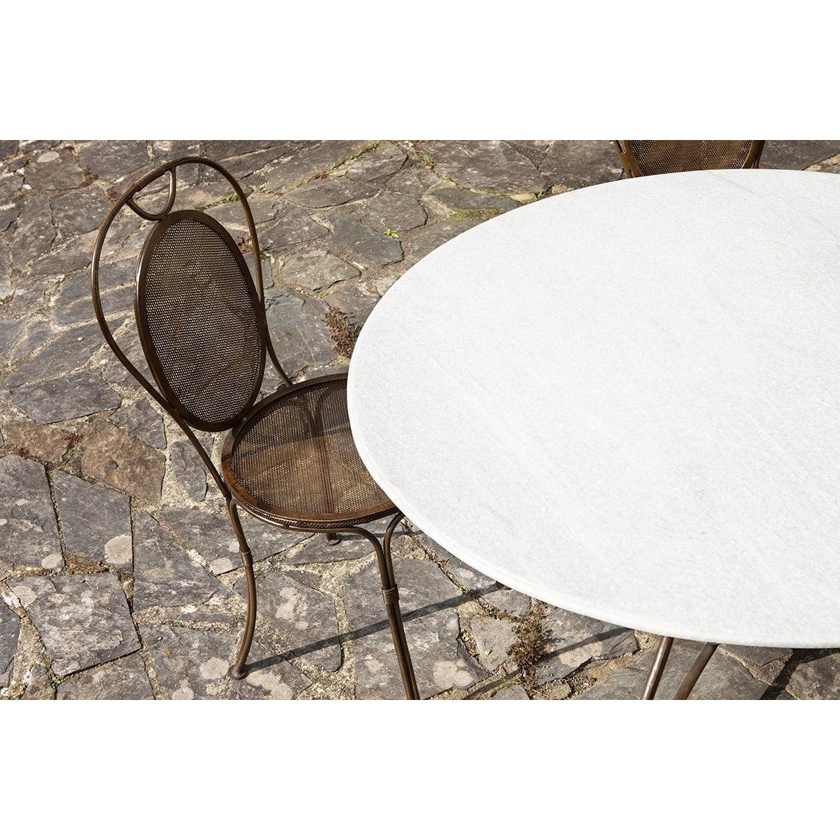 There is nothing quite as elegant as an outdoor marble dining table. The Parwaha marble dining table is the perfect blend of elegant iron work and clean off-white tones. The smooth marble top has a tactility that is hard to replace. The elegant curved iron legs add a sense of timeless grace and elevate the piece. Whether a city scape or country garden, the Parwaha dining table promises to be an enduring staple.