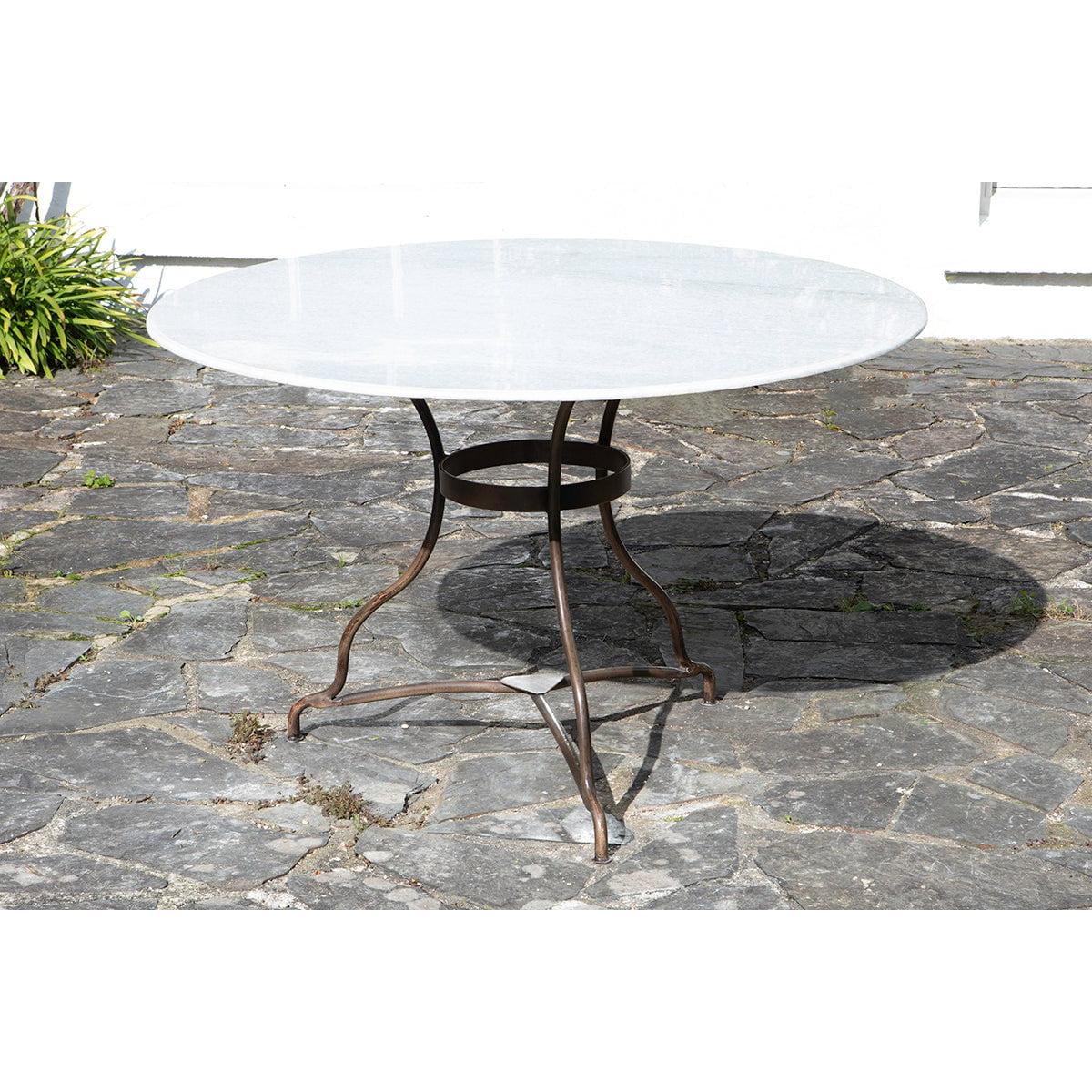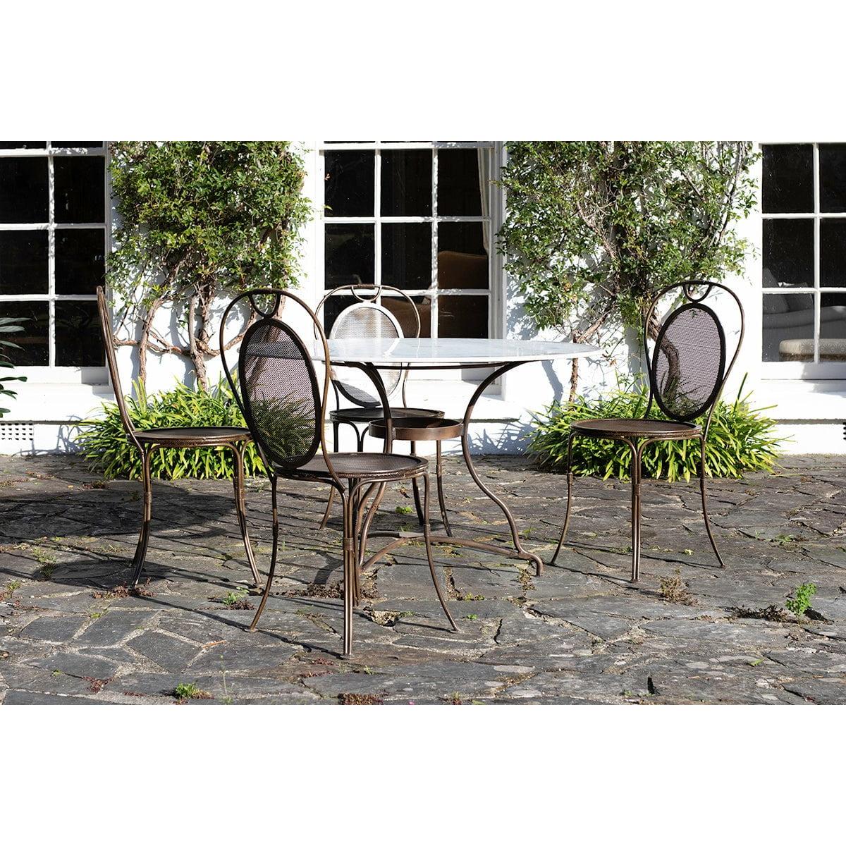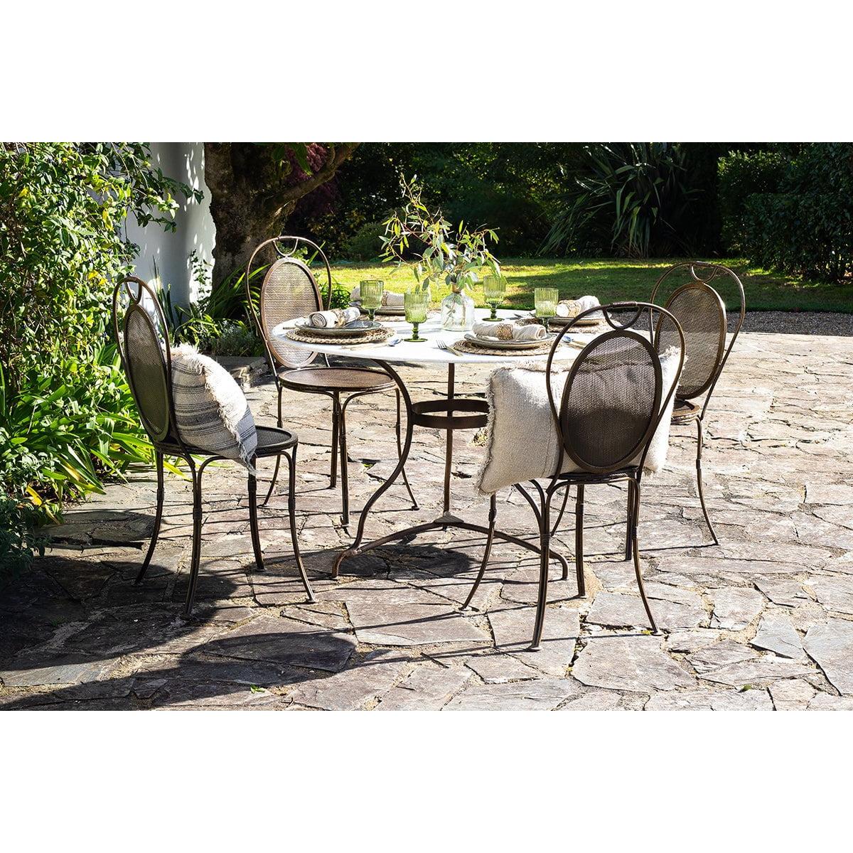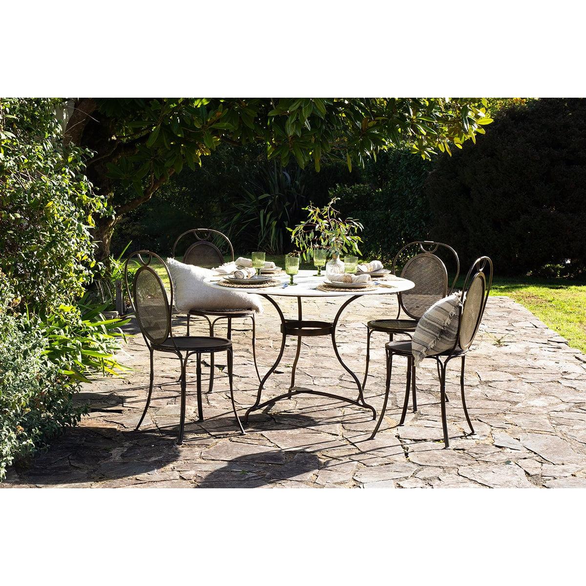 There is nothing quite as elegant as an outdoor marble dining table. The Parwaha marble dining table is the perfect blend of elegant iron work and clean off-white tones. The smooth marble top has a tactility that is hard to replace. The elegant curved iron legs add a sense of timeless grace and elevate the piece. Whether a city scape or country garden, the Parwaha dining table promises to be an enduring staple.