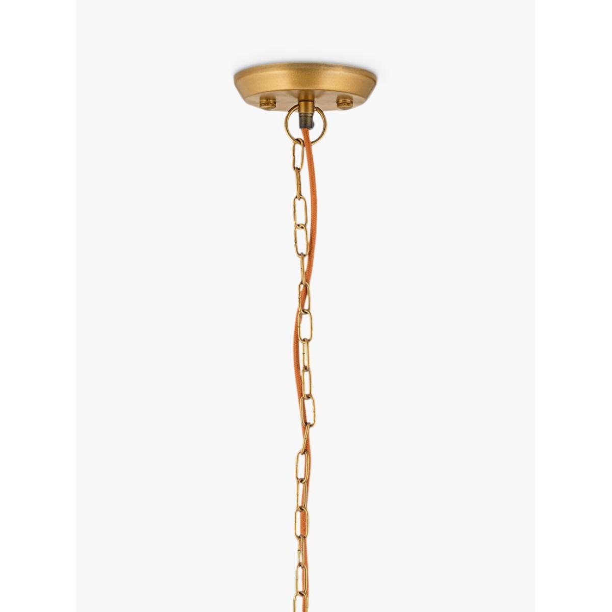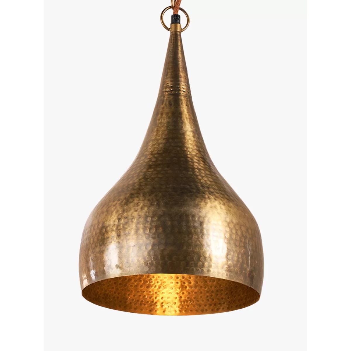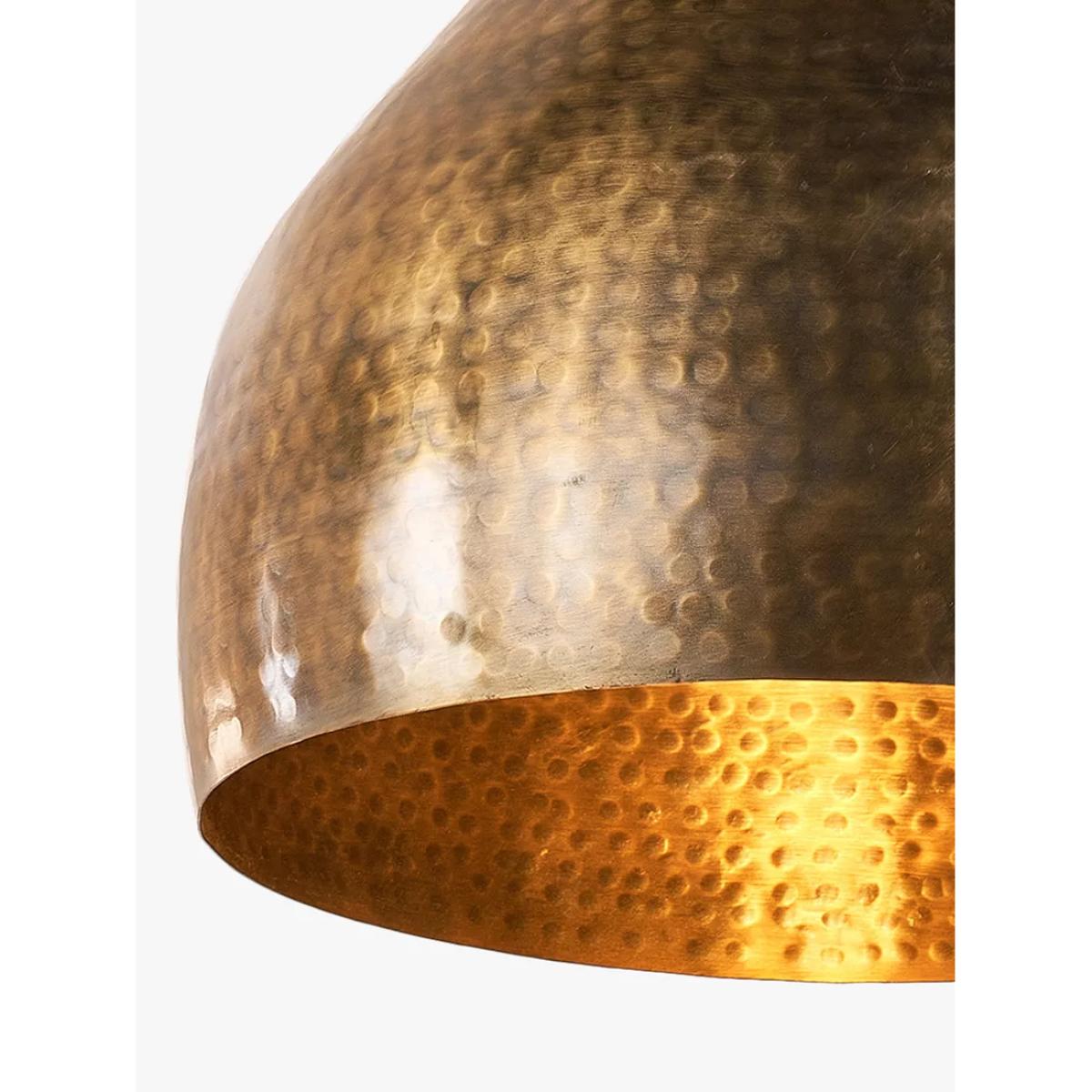 The curvaceous shape of the Nkuku Quinn ceiling light is complimented by its antique brass finish. The metal is skillfully hammered, using hand tools, creating an interesting texture and giving the Quinn pendant an antique feel. The wide base releases a generous flow of light which reflects splendidly on the textured surface, showcasing the best handmade touches. This statement light sits beautifully above a dining table or kitchen island, making an impressive showpiece. Each pendant comes with a fabric cable and an antique brass finished ceiling rose.