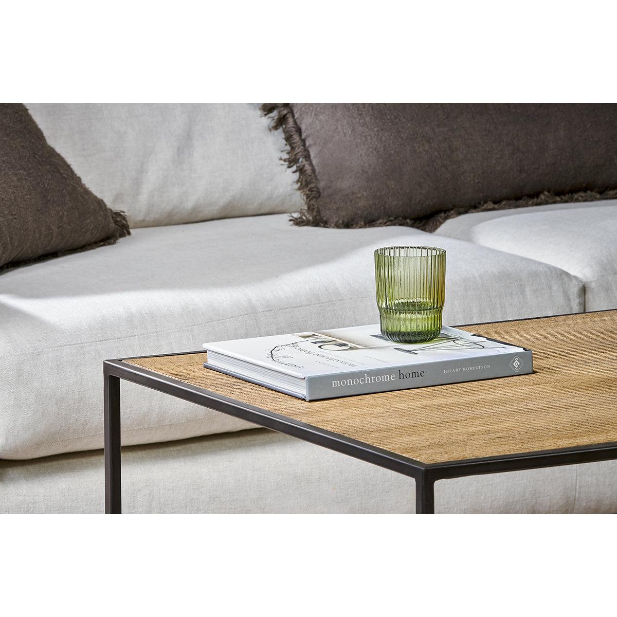 Contemporary, clean lines define our rectangular Rishin Coffee Table, with its sturdy iron frame in gun-metal grey and a mango-wood top in a dark walnut finish. The surface has been hand-grooved for an interesting reeded effect that adds texture to the piece. Practical and versatile, its a simple design and shape that pairs easily with a sofa in any living space. There is a matching side table in the collection.