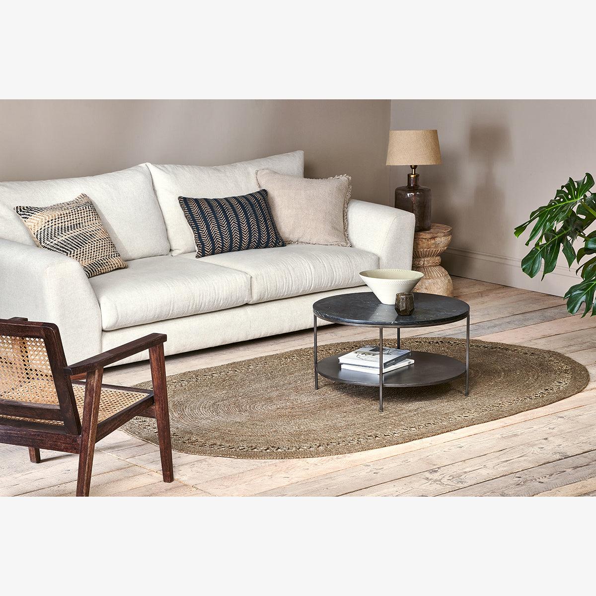 The Rupikia rug is hand-stitched and hand-braided from tactile hemp and would perfectly finish a room, enhancing a neutral colour palette and adding a warm welcome and relaxed aesthetic. The durable natural braids are coiled and stitched in place to make their distinctive patterning for a beautiful centrepiece that would look attractive in a bedroom, hallway, or in a kitchen under a dining table. The oval, organic shape lends itself well to any space, while the earthy tones of eco-friendly hemp add a cosy touch.
