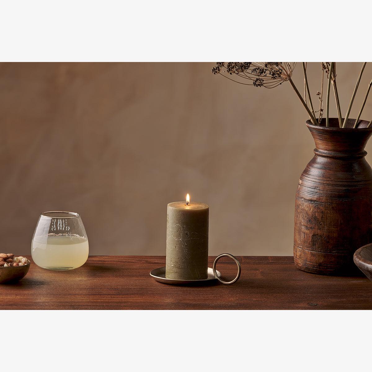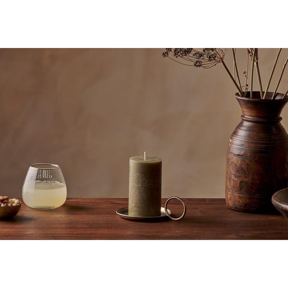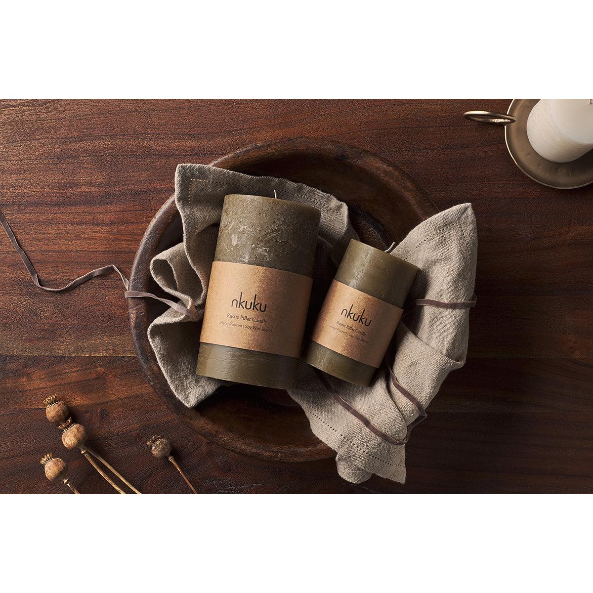 Nkuku Rustic Soy Blend Pillar Candle | Candles Holders & Lanterns | Olive Green | Small 15 x 8 cm