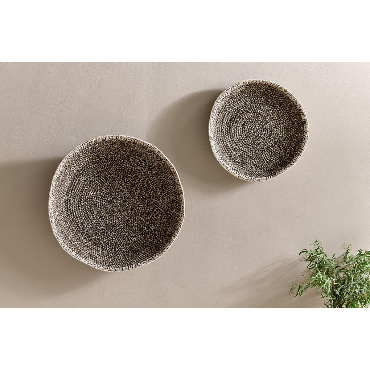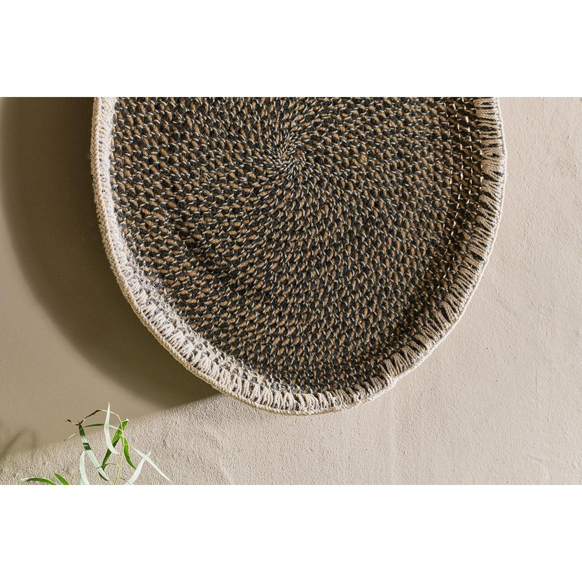 This interesting Sadie basket wall art intertwines a blend of black and natural tones and represents the unique craftwork of a special group of women from rural India. The Sadie wall art originates in southern India and is the handiwork of an NGO that was established to support rural women in drought prone areas of southern India. Farming is notoriously hard and harvests can be unpredictable. The NGO helps ensure that these women have an income of their own that can support their families through hardships. The benefits for us is that we can also showcase their amazing talents. Wall art is not just about texture and colour, it's about story telling and meaning. These Sadie baskets provide both. All dyes are natural.