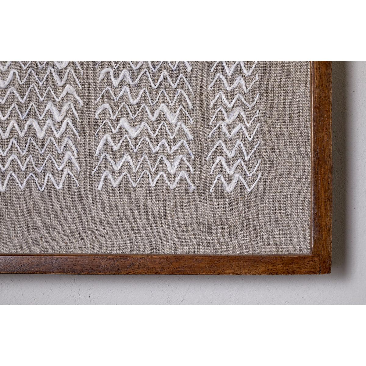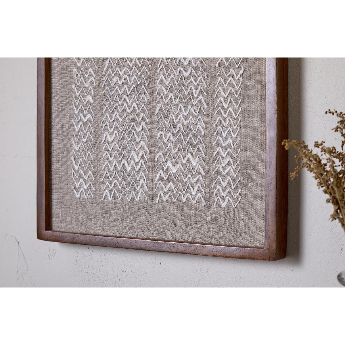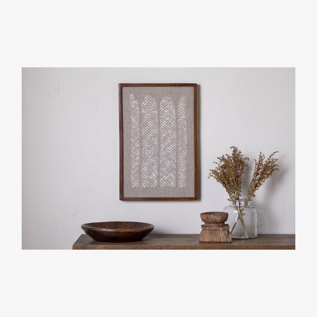 This hand-stitched wall art draws inspiration from traditional Indian Brahmic script, reinterpreted in a creative, textural design. The calming palette of walnut, olive grey, and soft white adds a quiet, grounding presence to any living space. Framed in sustainable mango wood, it balances thoughtful craftsmanship with natural materials. Pairs beautifully with our Birala wall art for a harmonious display.