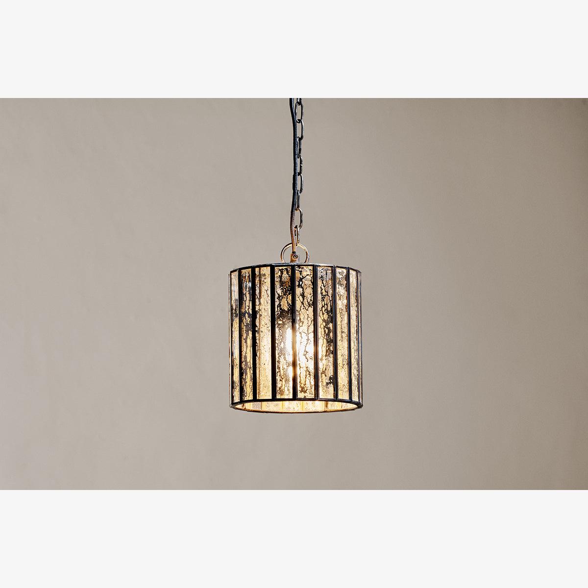 Our Shanaya pendant creates an elegant focal point in any room. Made from antique bronzed metal with panels of mercury-finished glass, it not only looks beautiful unlit, but will diffuse a warm glow in your chosen location. Beautifully stylish hanging alone in a bedroom, hallway or living room, or equally in multiples above a kitchen island or dining table, creating an effect of shimmering aged glass that we've hung from a simply link chain with an understated dark flex to match.