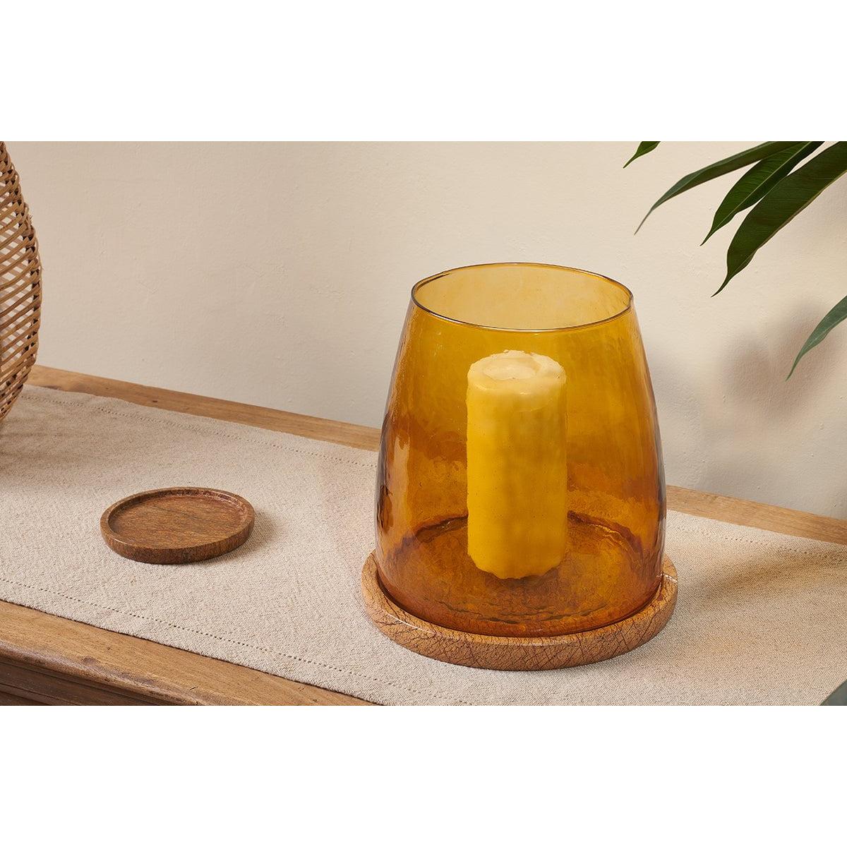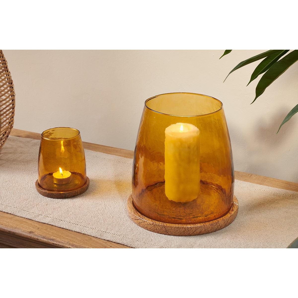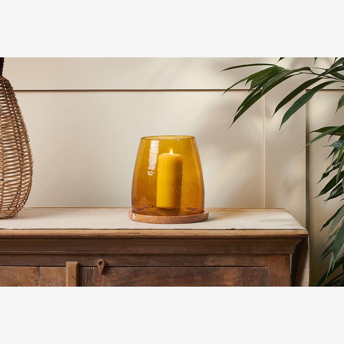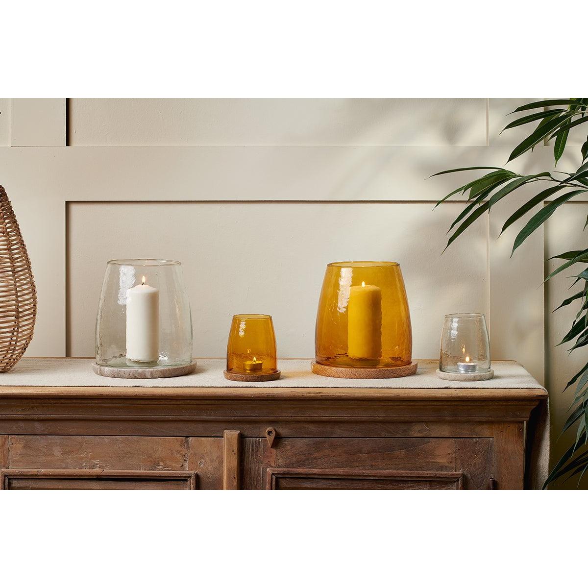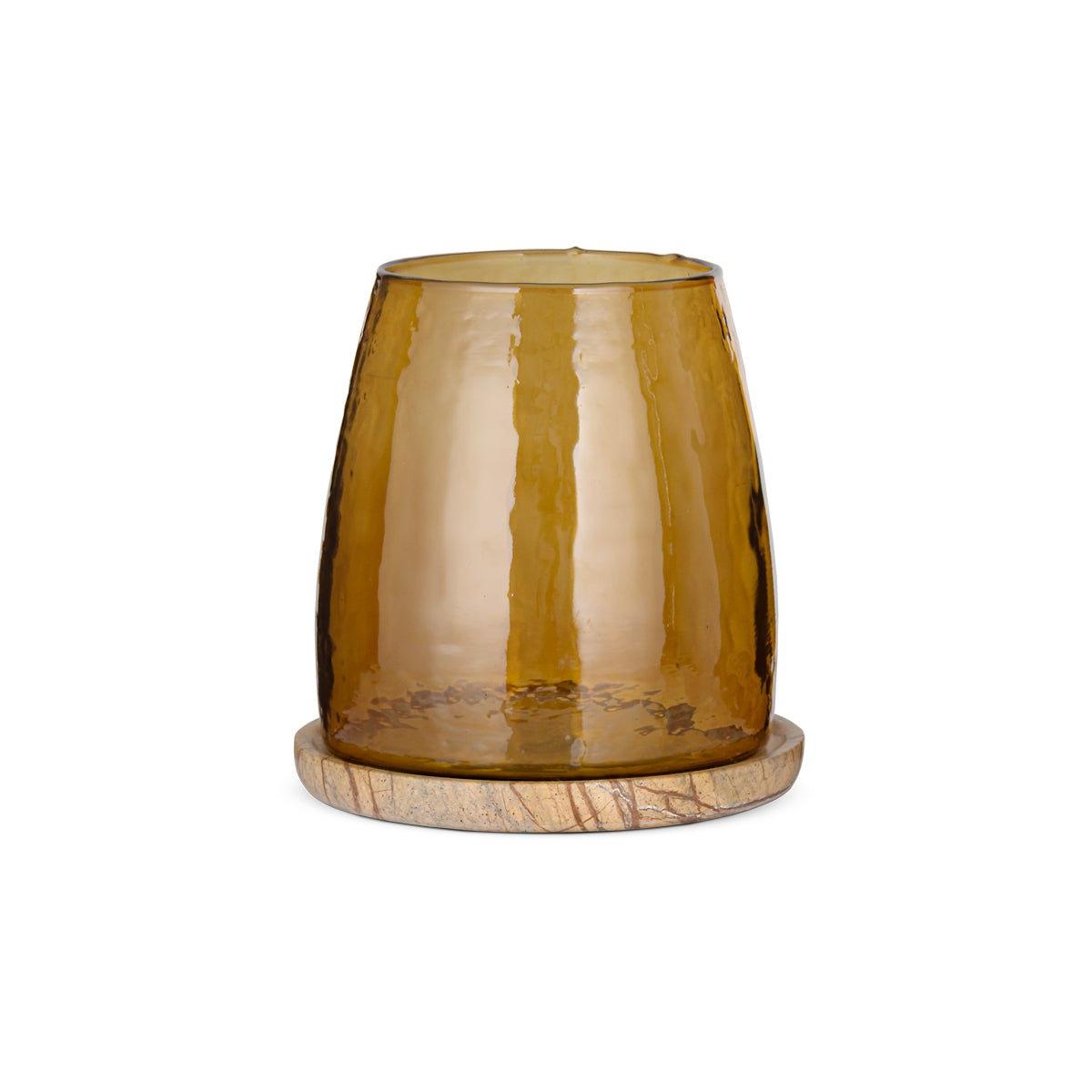 The warm amber tones of the Sikkim glass and marble lantern are perfect for creating a soft and intimate atmosphere. The recycled glass lantern nests within a solid brown marble base. The hammered finish of the glass combines with the amber hues to set an ambient mood and has a soft rolled top edge. The brown marble is rich with variegated natural marble tones. These two timeless materials combine beautifully to create this stylish and practical lantern that can be used both inside and out. Style with a pillar candle to complete the look. The Sikkim lantern is made from recycled glass and the elegant shape is mouth blown. Although we encourage using the lantern outside we do not recommend leaving it outside exposed to the elements.
