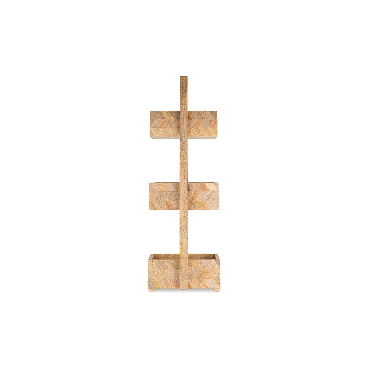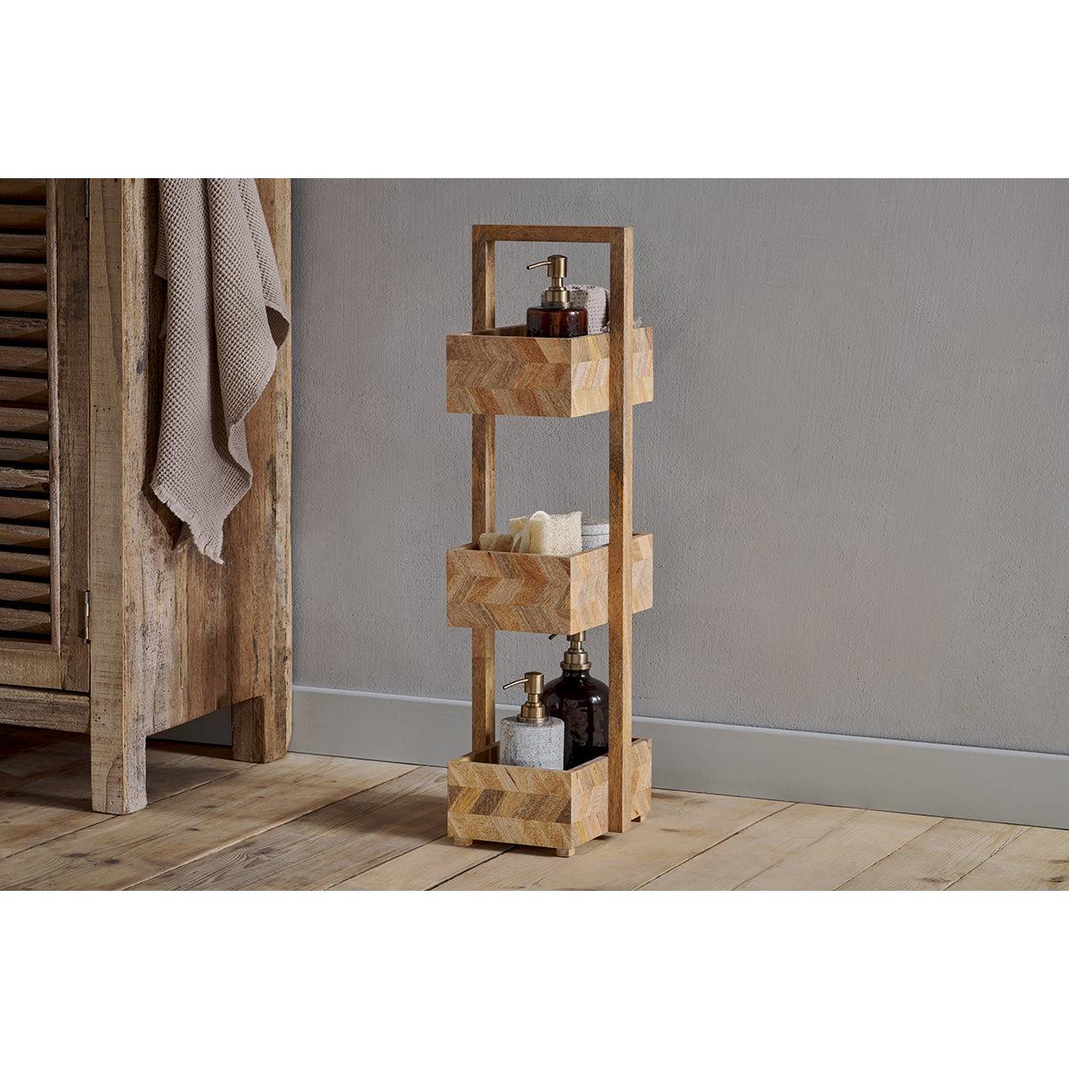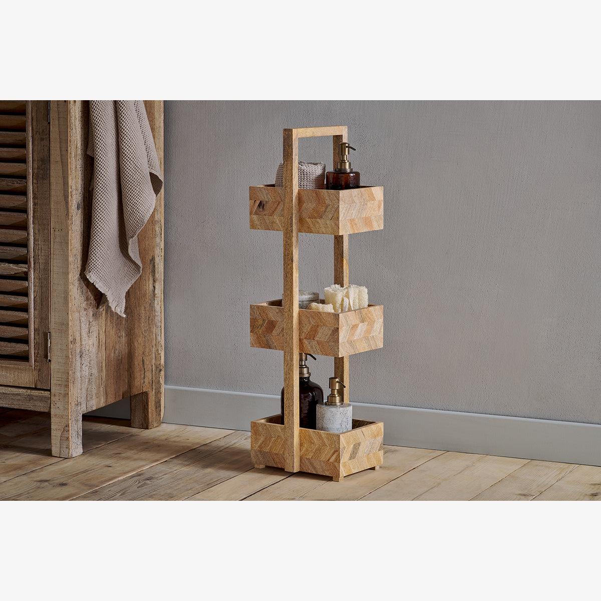 I’m a fan of the Sukha caddy’s simple, tiered design and the warm tones of its mango-wood finish - it slots neatly into narrow gaps, making it ideal for bathrooms, hallways or home offices. In a Scandi or natural-material scheme it brings subtle texture, while in darker, moody rooms it offers a pleasing contrast. For styling, treat each tier as a small vignette: use one shelf for rolled hand towels or linen napkins, another for amber-glass bottles or ceramic pots, and the top for a small plant or decorative object. Keep the overall look uncluttered by sticking to a limited palette of two or three complementary materials, and rotate items seasonally to keep the display fresh.