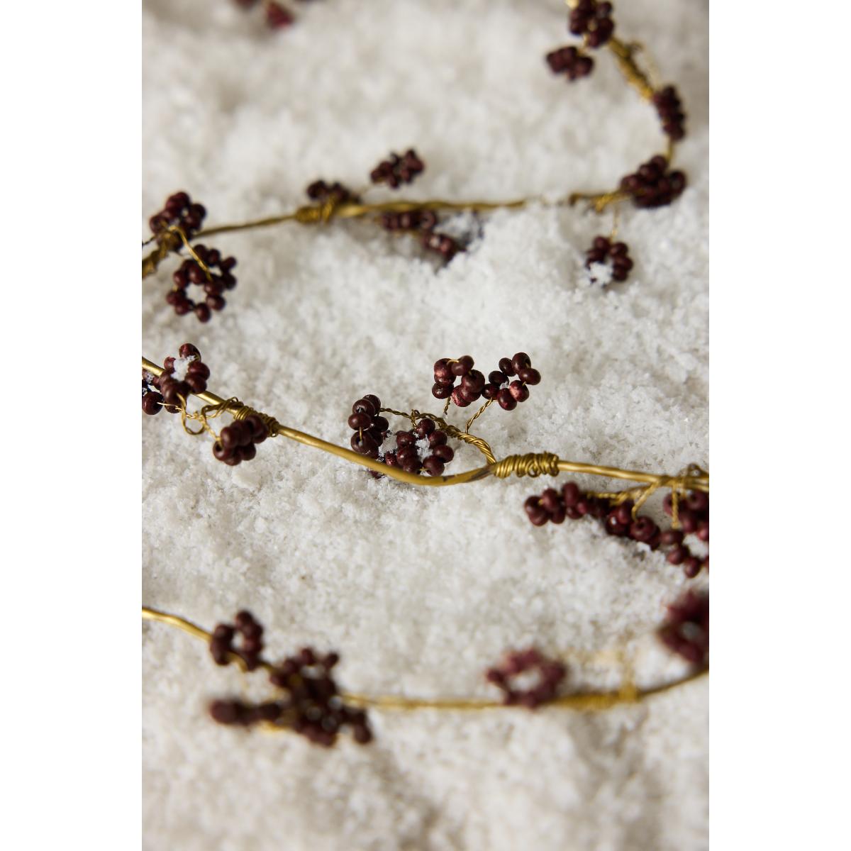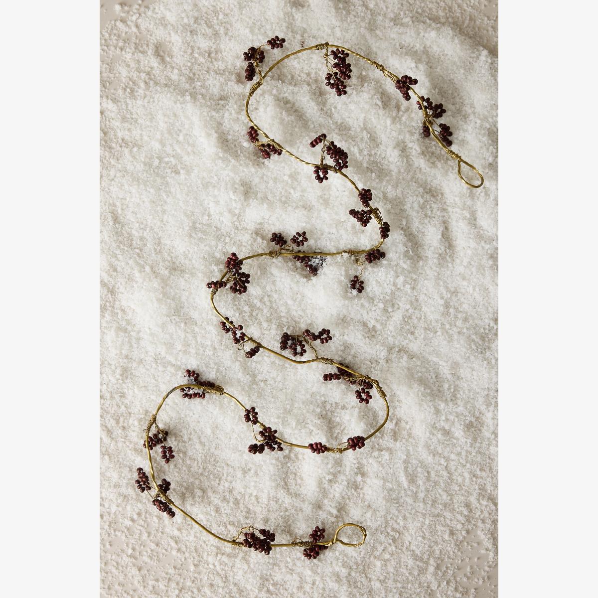 This festive garland brings together mango wood beads and antique brass-coloured wire in a delicate, foliage-inspired design. Its natural texture and warm metallic accents make it a versatile piece for dressing mantels, banisters, or festive tables with understated seasonal charm. * By nkuku * 50% Iron, 50% Mango Wood beads * Wipe with a dry, soft cloth * Indoor use only * Imported