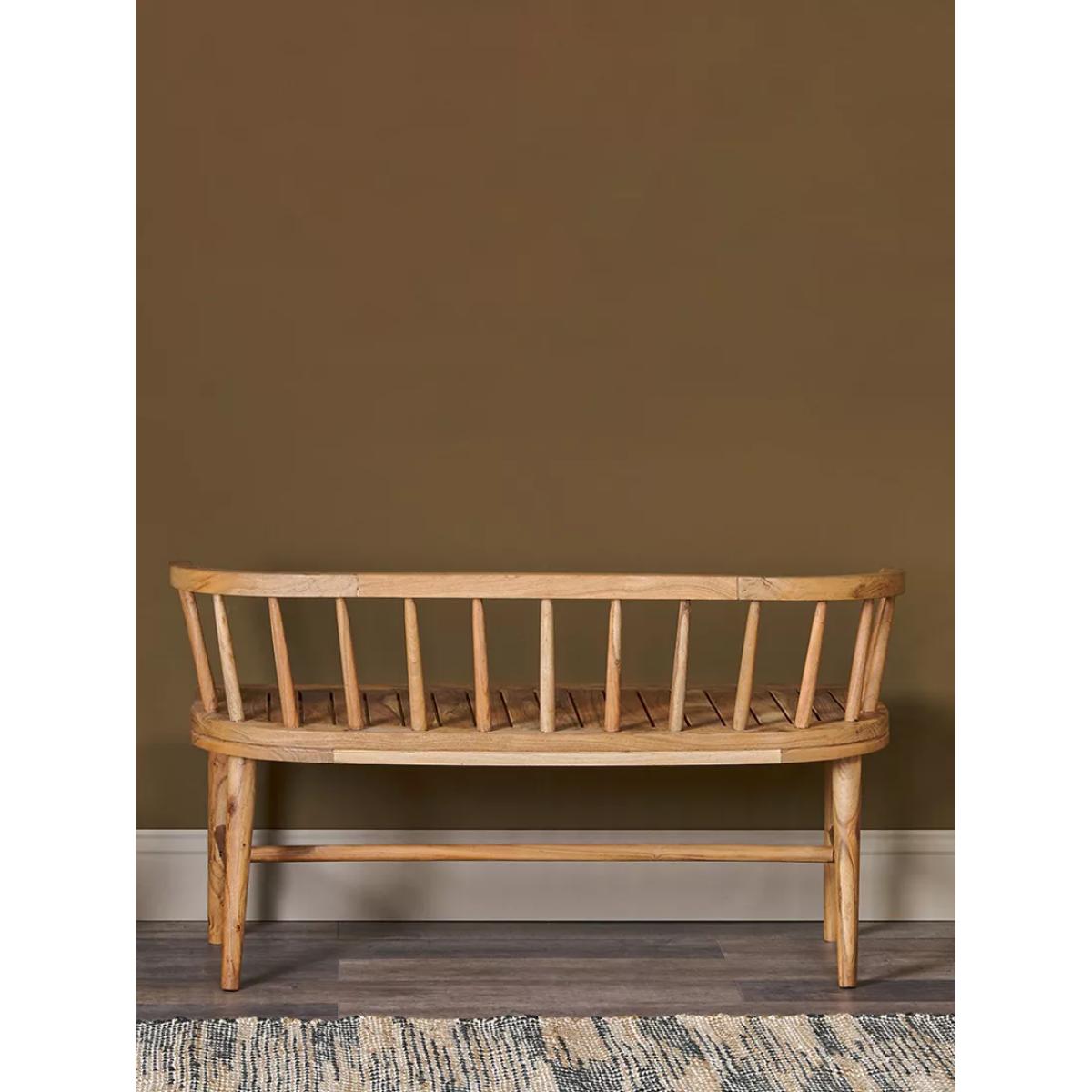 Nkuku's Shaker-style Tipu bench is hand-carved from Acacia wood giving it a warm tone and sand-blasted for a textured look. Functional and stylish, this simple design, with tapered legs and gently curved back support, is ideal for a hallway or kitchen space, offering a timeless and versatile look.