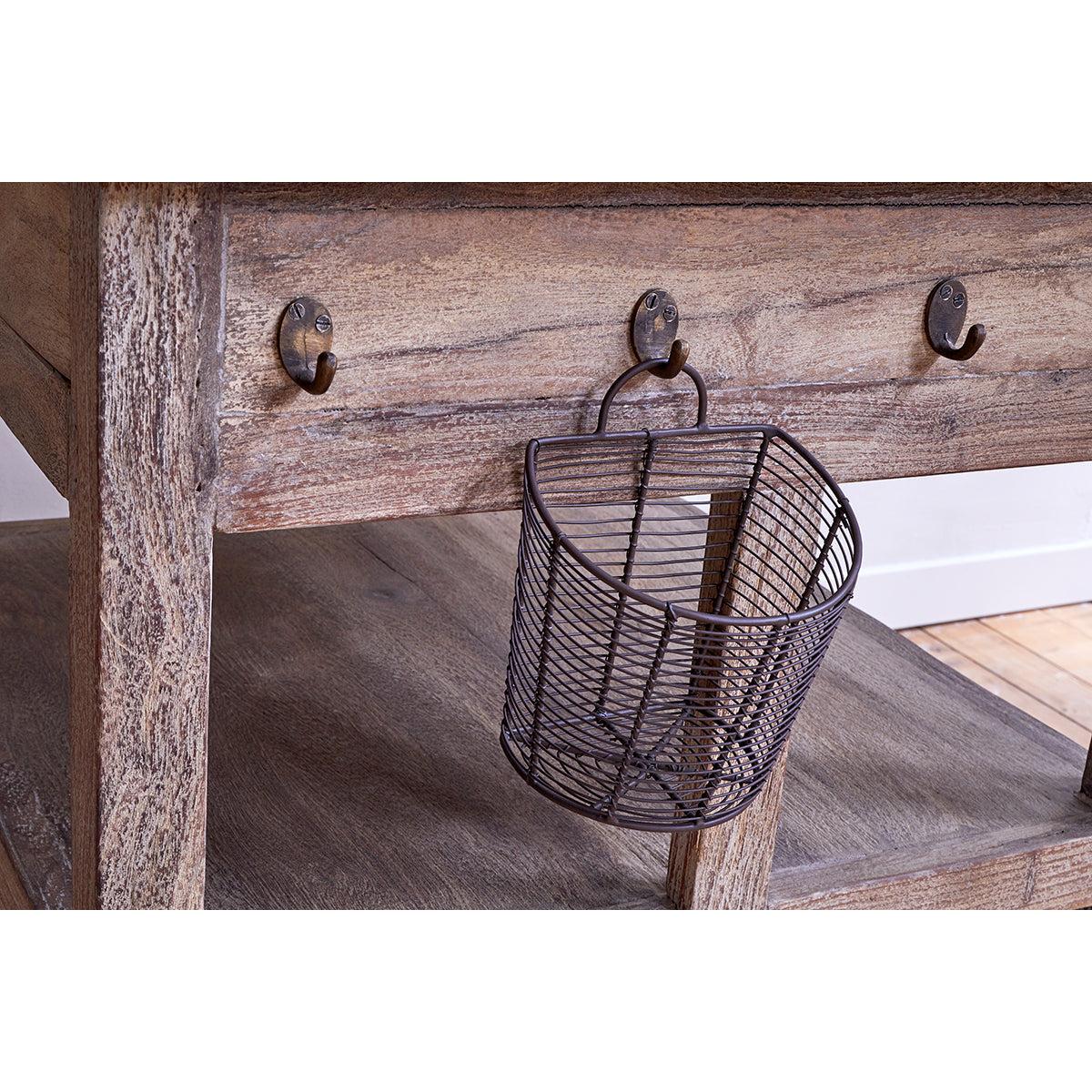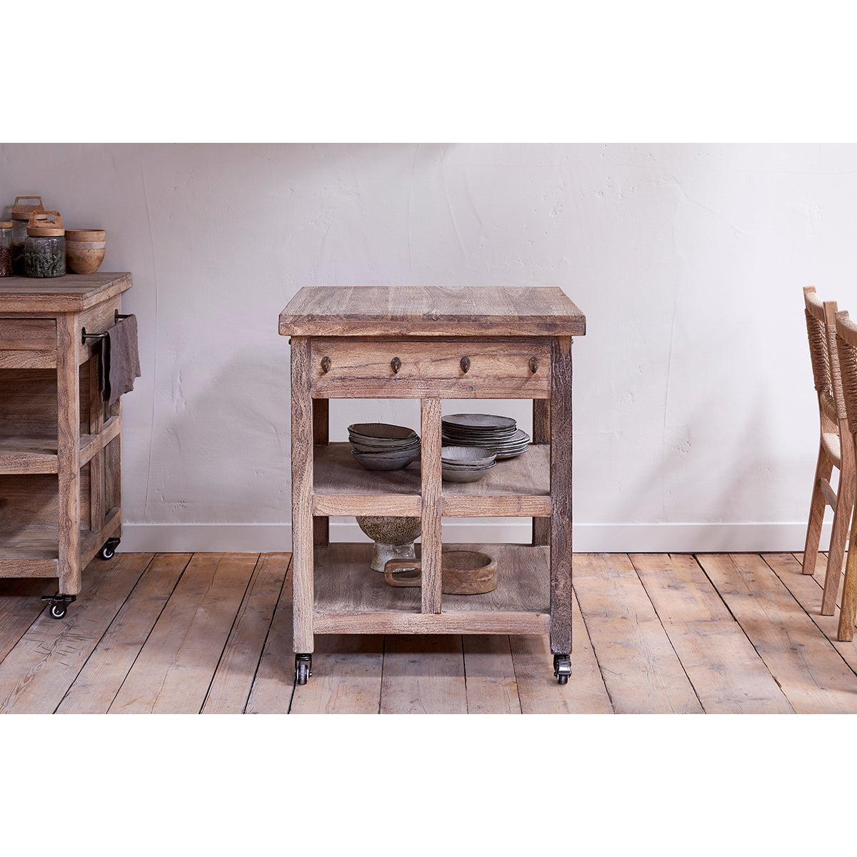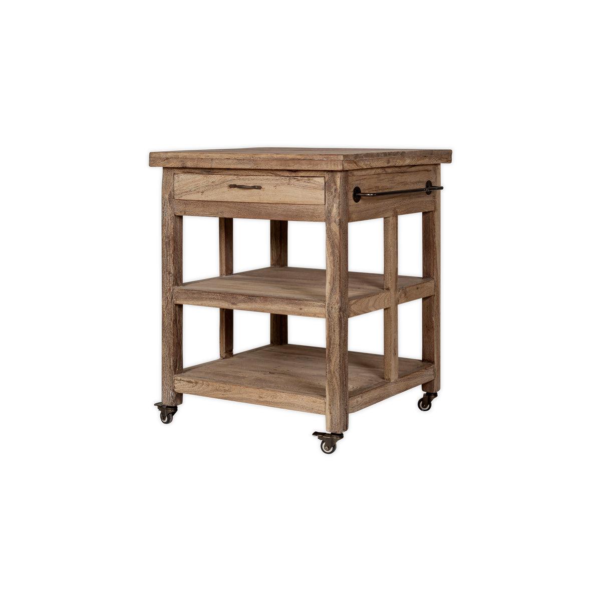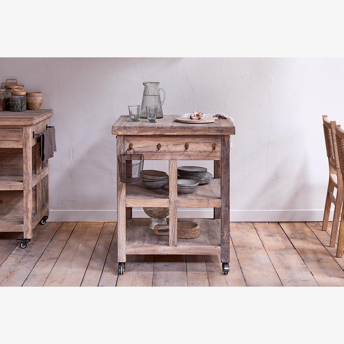 Rustic, sturdy and thoughtfully designed as a versatile and hard-working stand alone kitchen unit, our Tivu butcher’s block uses reclaimed wooden ceiling beams from India where they are repurposed and handcrafted to create this unique and timeless piece. Sanded and lightly finished with a white wash, the mixed woods are harmonised in appearance yet still allow for subtle variations in tone and grain to shine through. Two shelves, two drawers and 4 iron hooks offer multiple storage options to keep a kitchen thoroughly organised, while lending it a laidback farmhouse aesthetic. Castors are included and can be added to the piece by our nkuku fitters on delivery if desired.