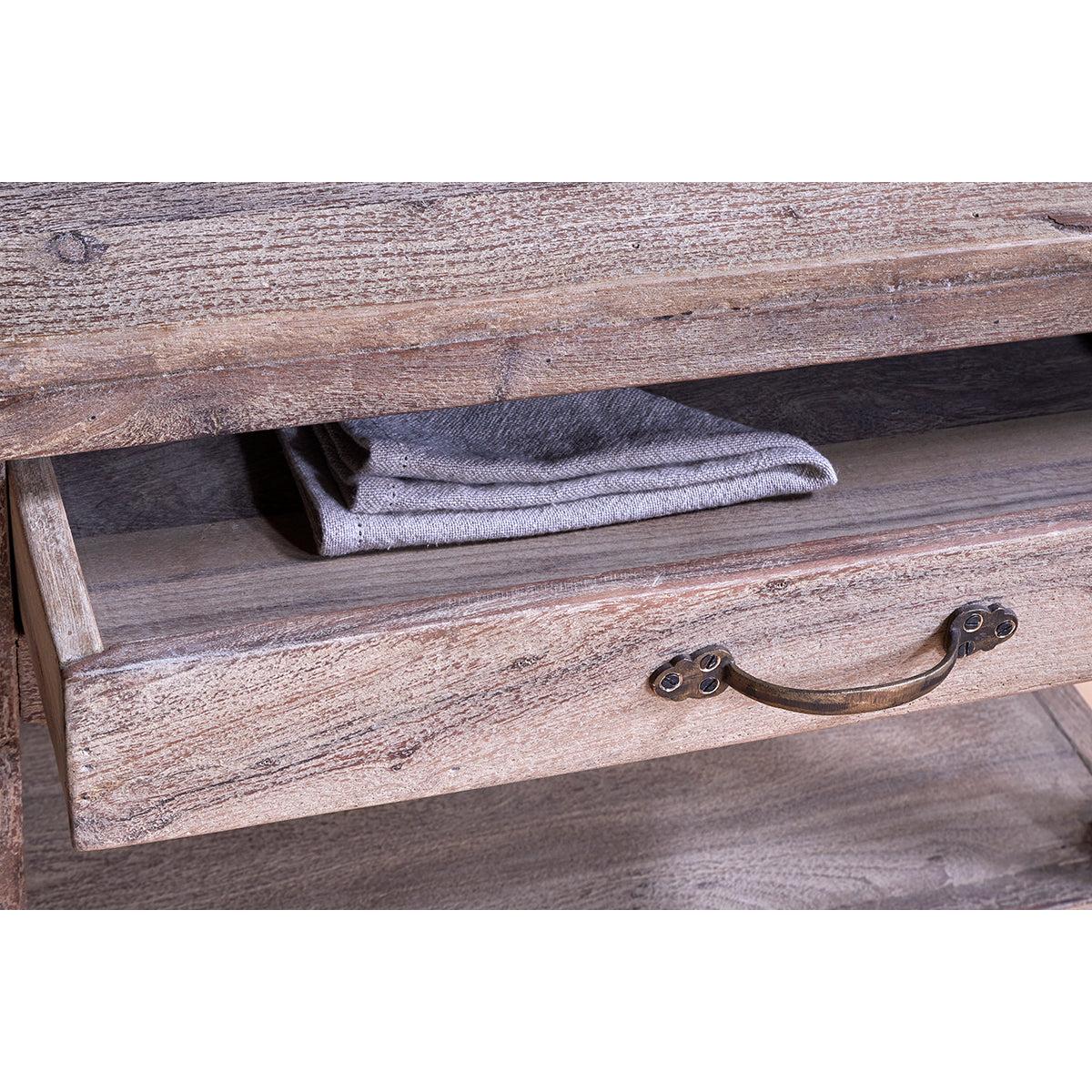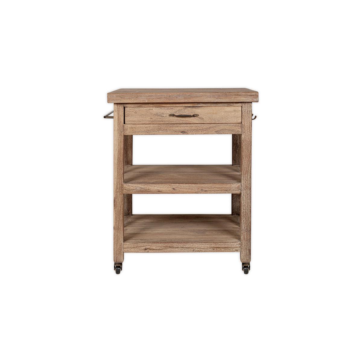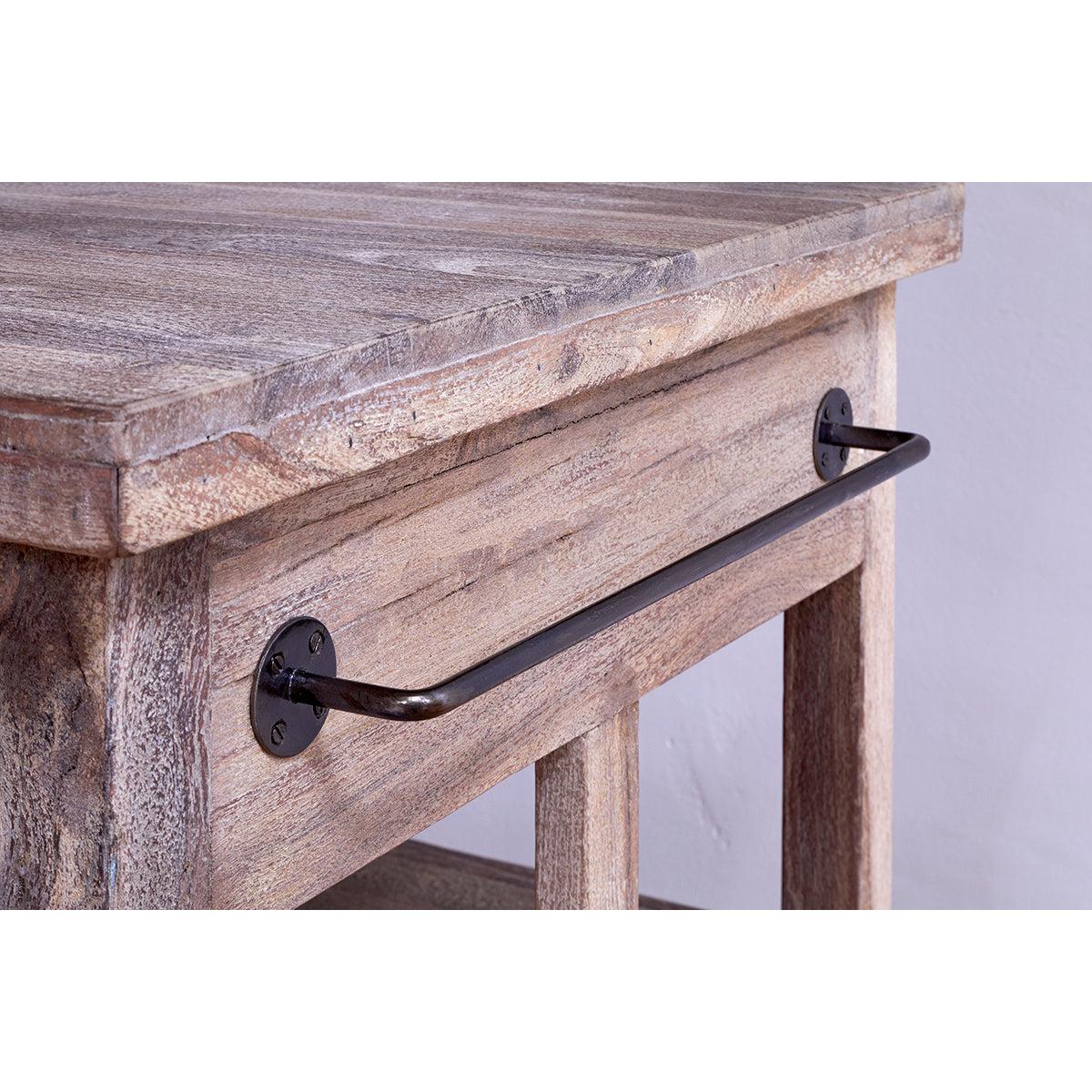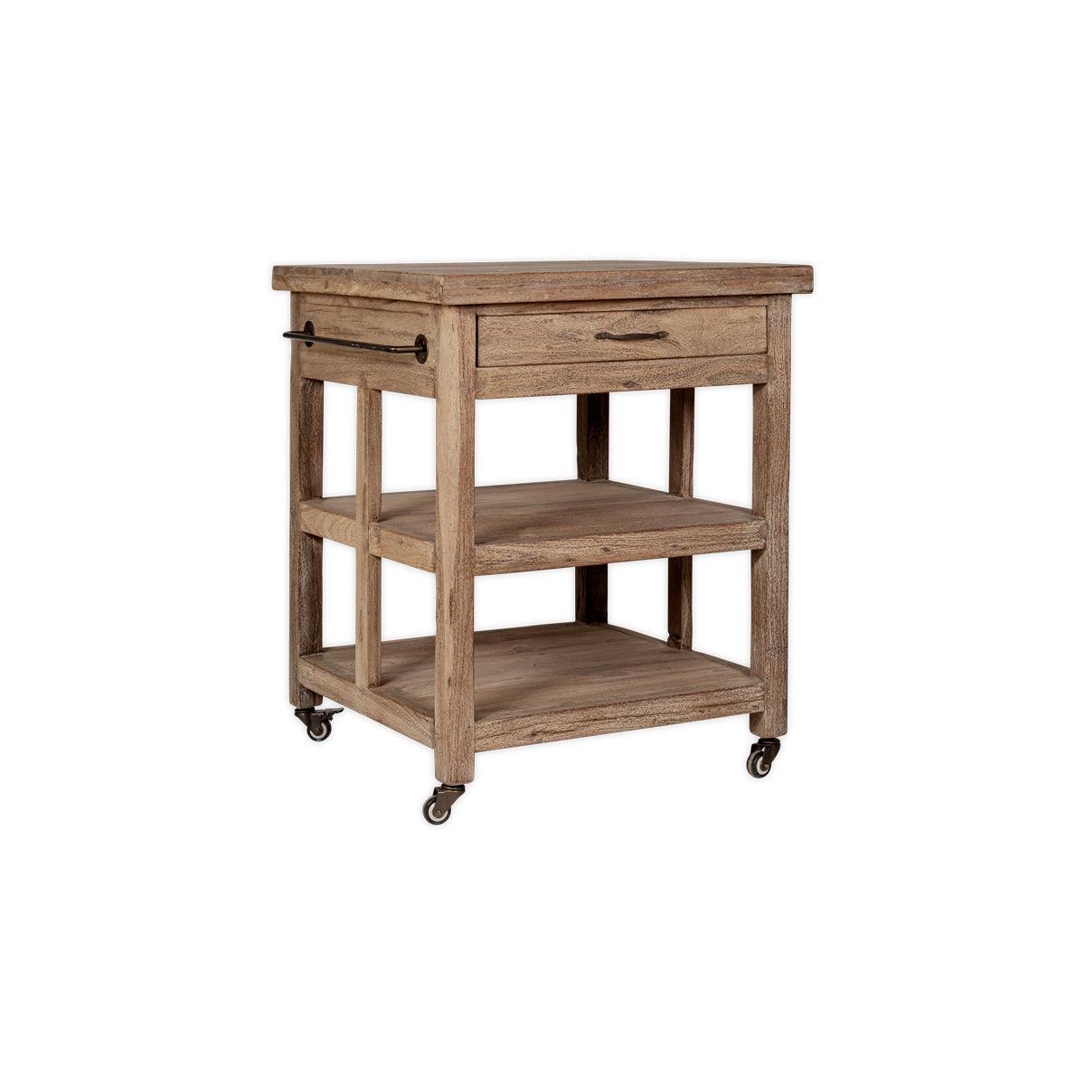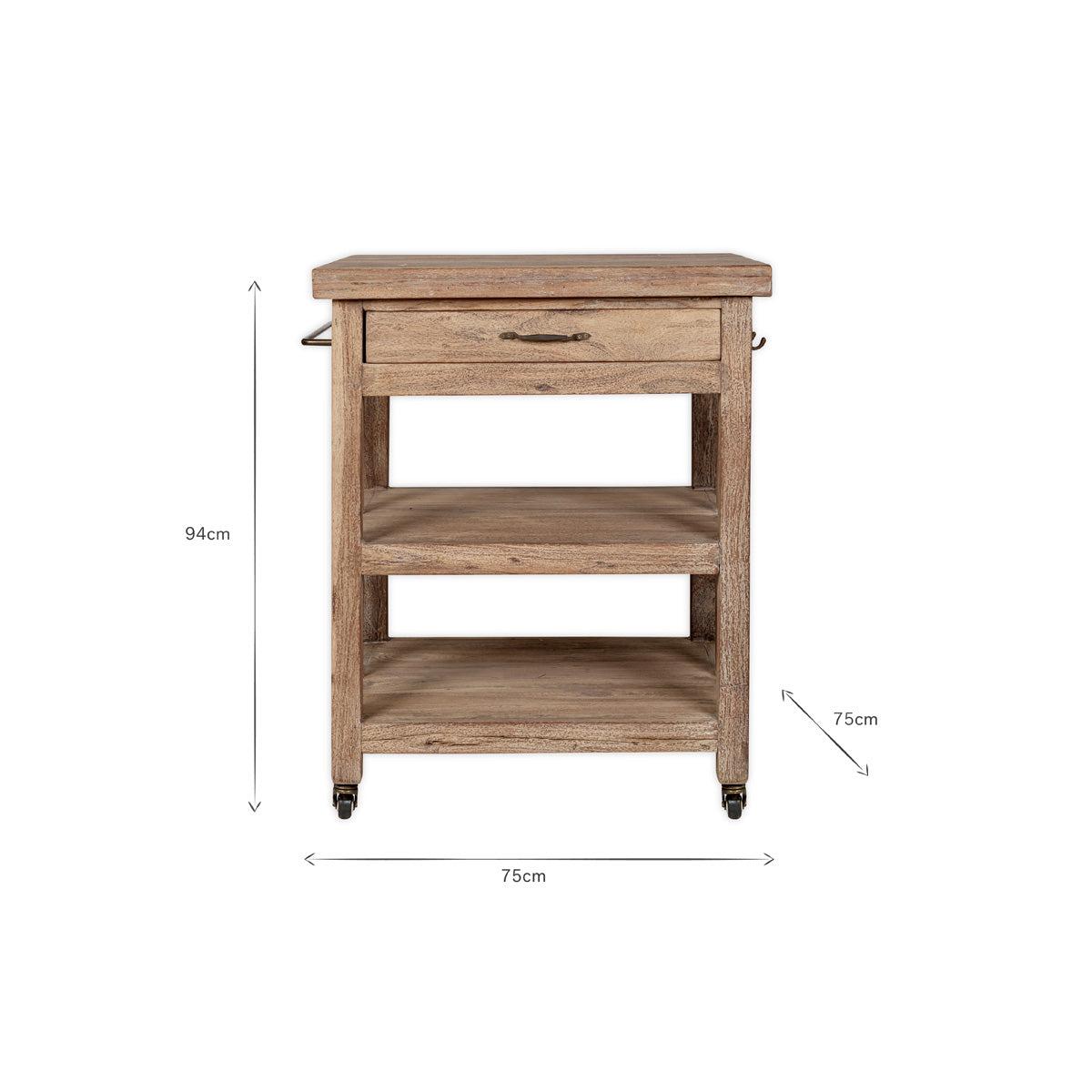 Rustic, sturdy and thoughtfully designed as a versatile and hard-working stand alone kitchen unit, our Tivu butcher’s block uses reclaimed wooden ceiling beams from India where they are repurposed and handcrafted to create this unique and timeless piece. Sanded and lightly finished with a white wash, the mixed woods are harmonised in appearance yet still allow for subtle variations in tone and grain to shine through. Two shelves, two drawers and 4 iron hooks offer multiple storage options to keep a kitchen thoroughly organised, while lending it a laidback farmhouse aesthetic. Castors are included and can be added to the piece by our nkuku fitters on delivery if desired.