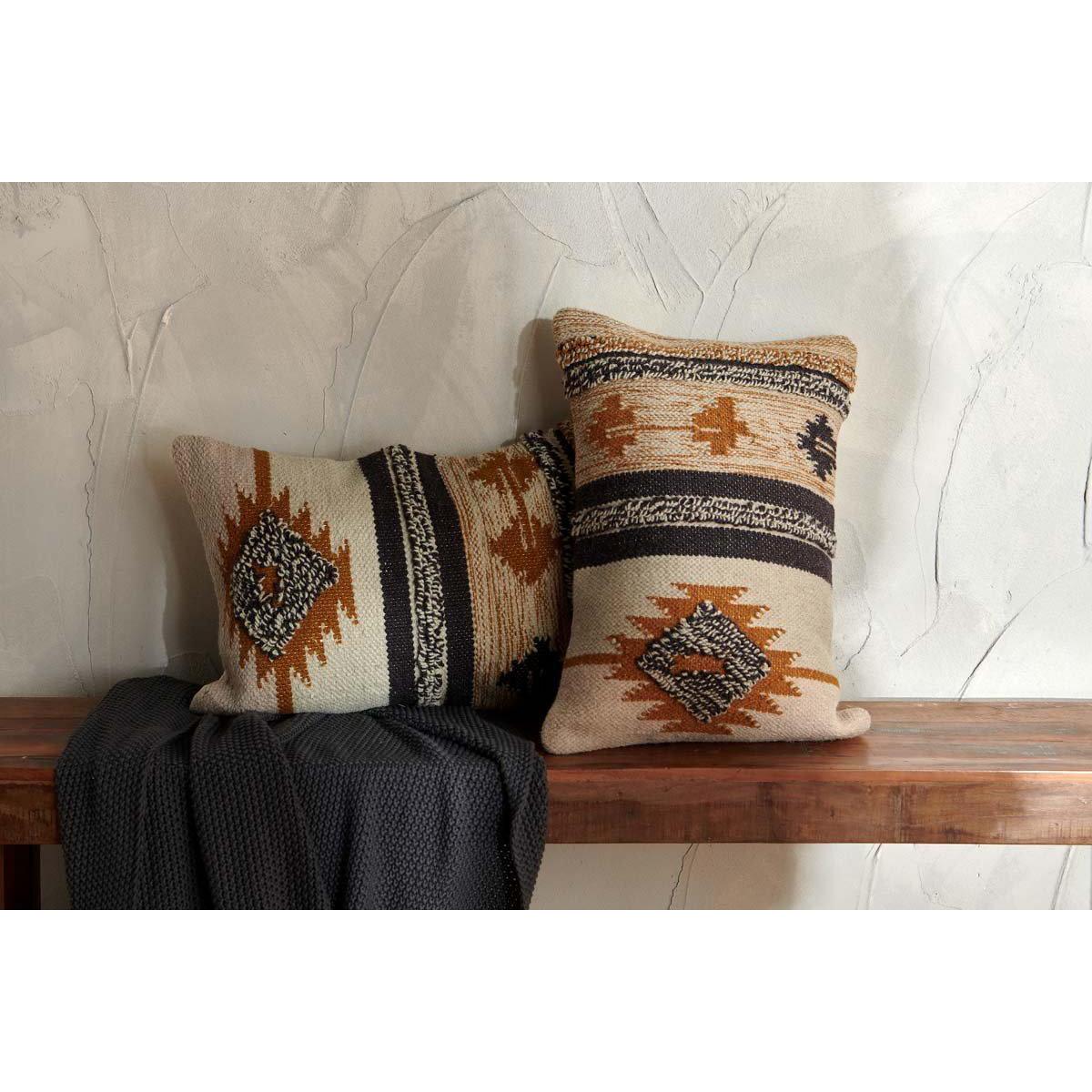 The tactile mix of wool and cotton combine in these eye -catching Tussi Sia cushion covers. The Ikat design is given a warm earthy aesthetic with threads of mustard, natural and black. | nkuku Tussi Sia Cushion Cover | Textiles | Mustard/Grey | 40 x 60 cm