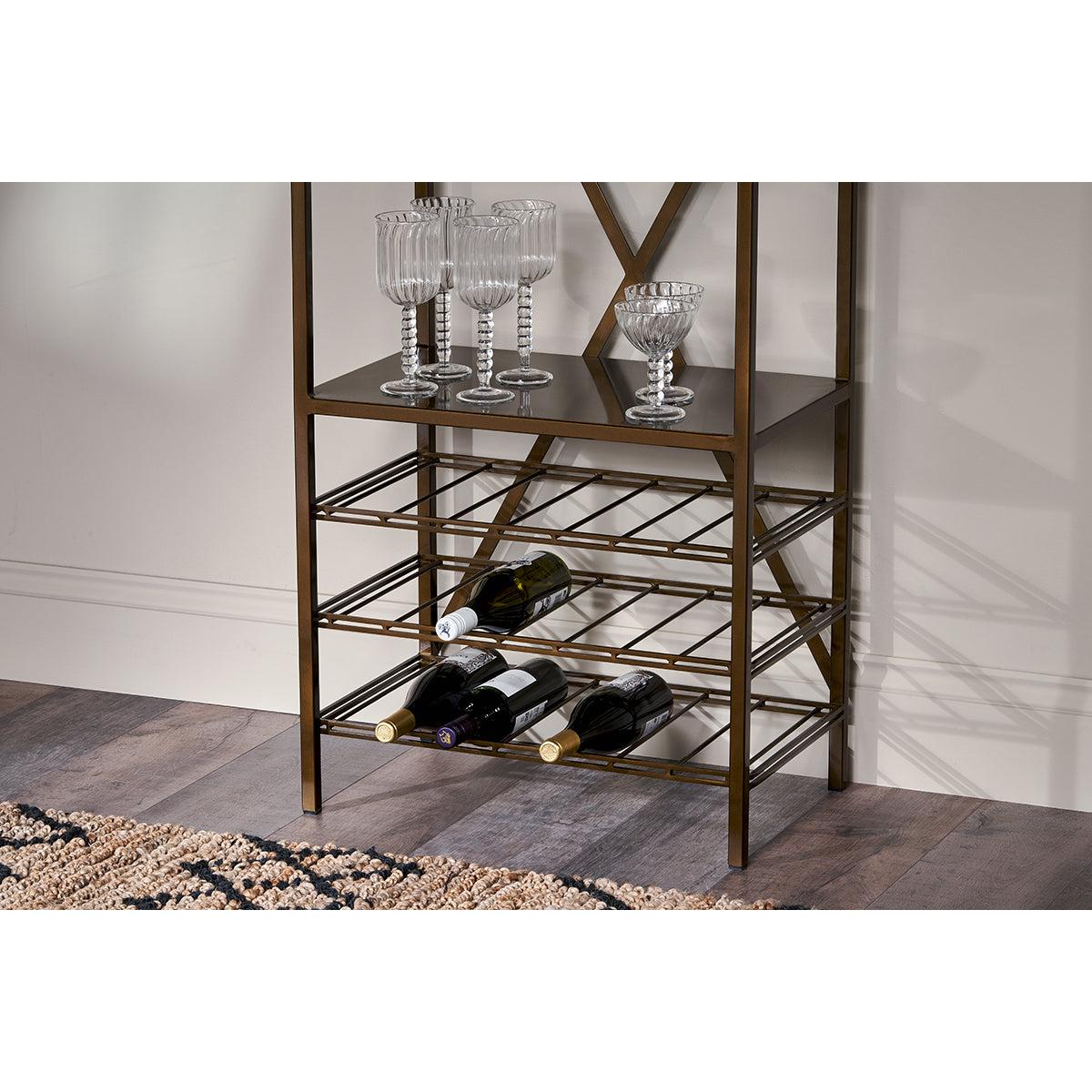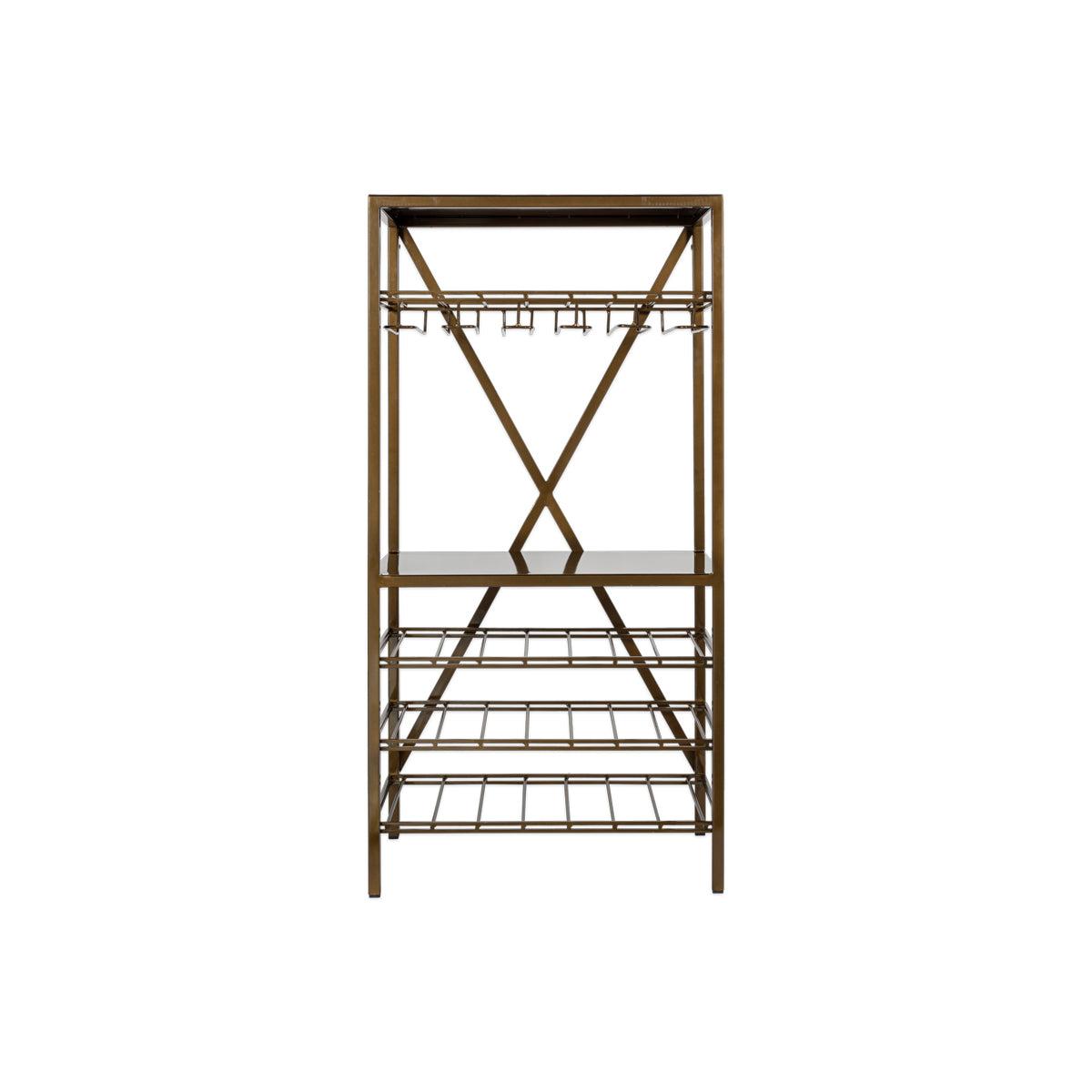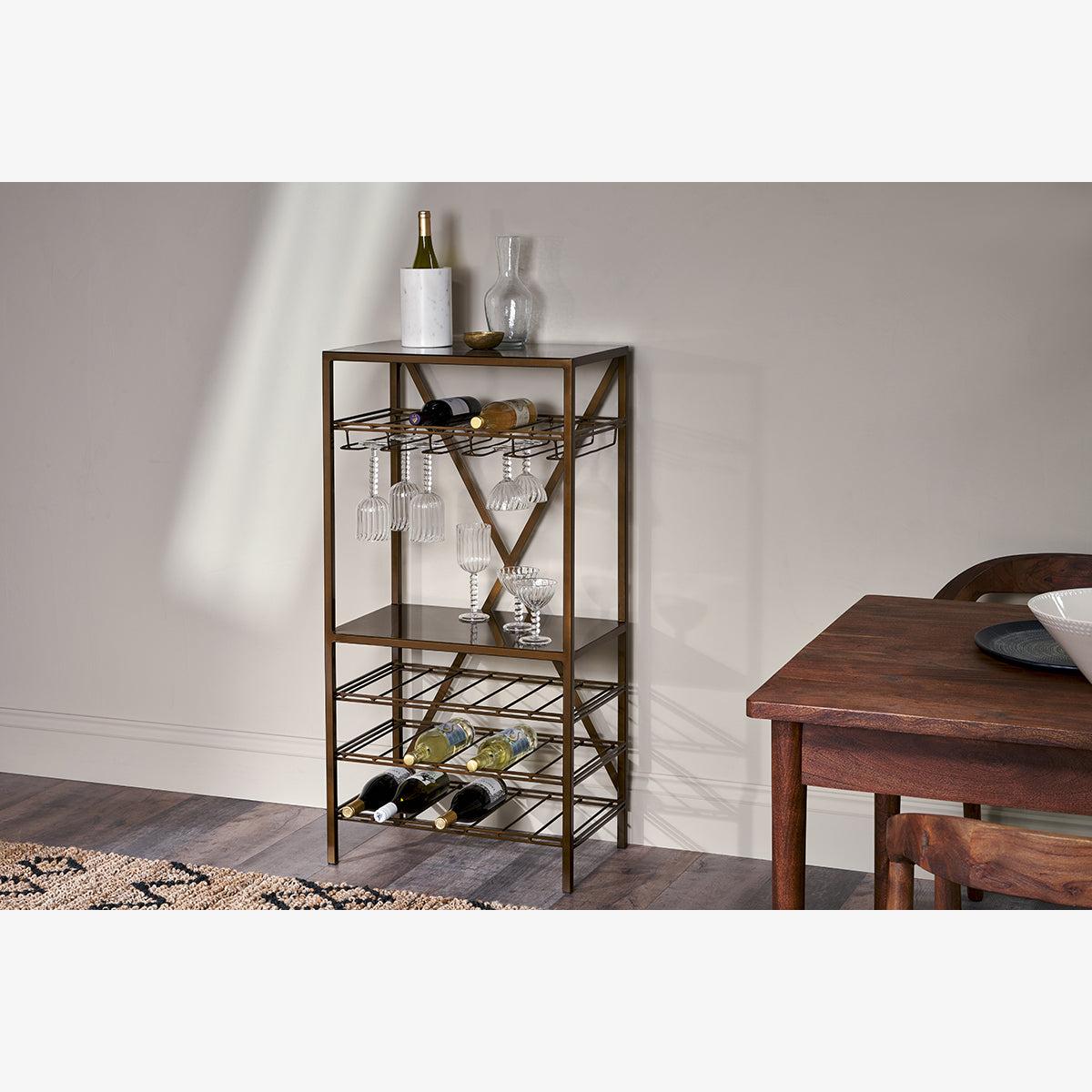Our stylish Udayan Drinks Display has an elegant antique brass finish and a top shelf with horizontal storage for seven bottles as well as hanging space for assorted glasses (wine, champagne and cocktail). The solid shelf below is perfect for standing bottles, a decanter, ice bucket and drinks accessories, while an additional three racks can hold up to 21 further bottles. A functional, sophisticated and fun addition to a home bar or corner of your kitchen or living space.
