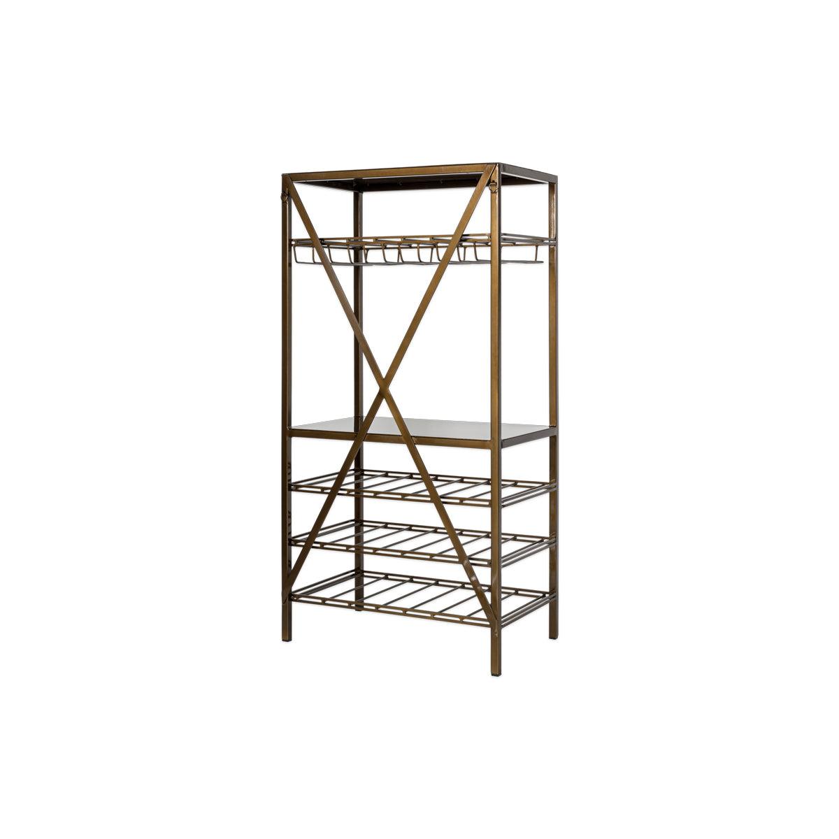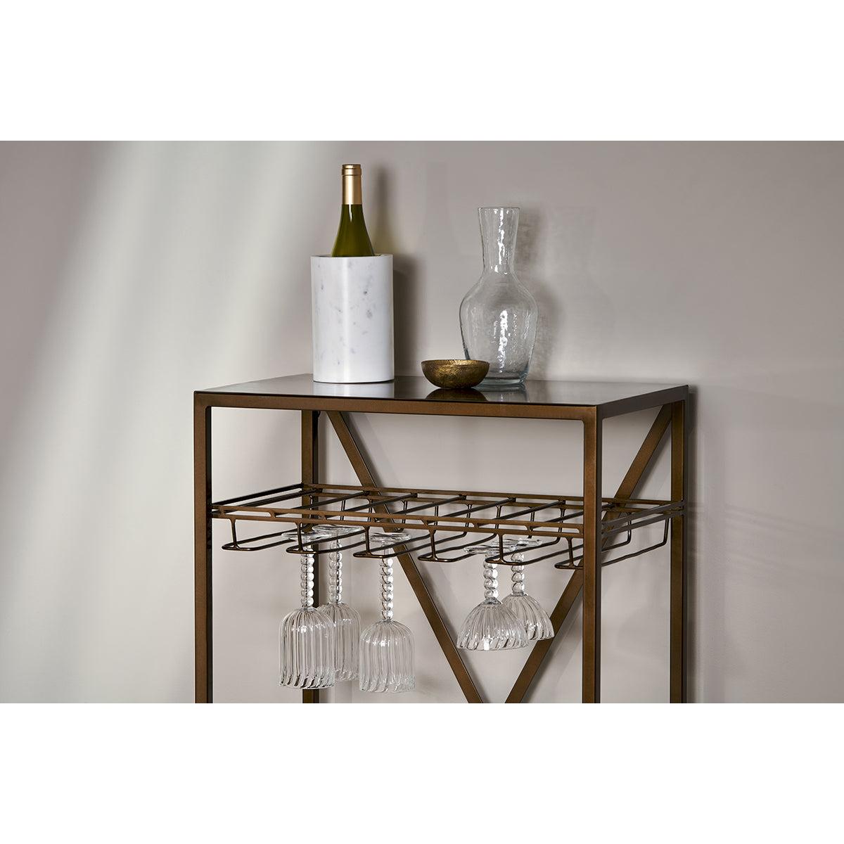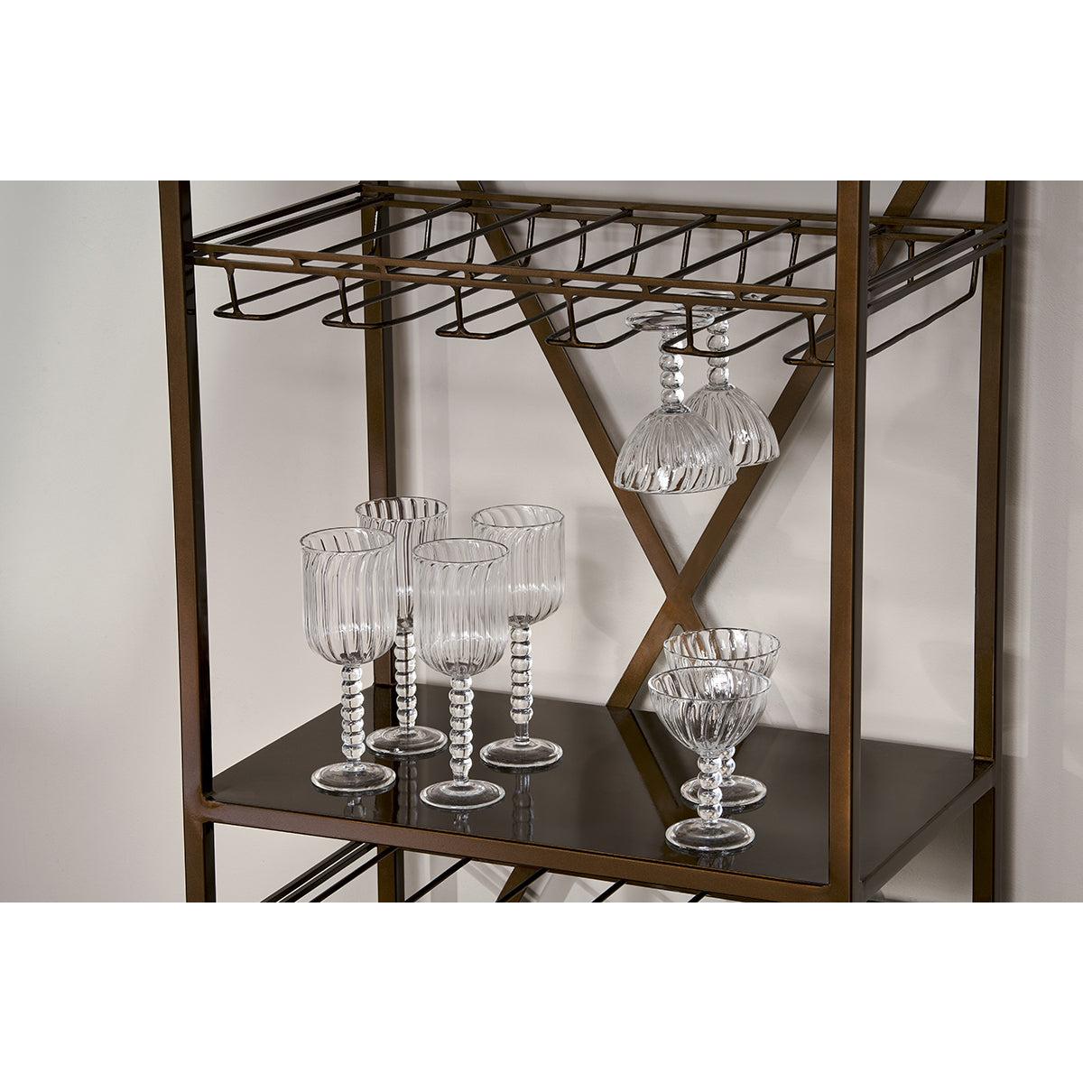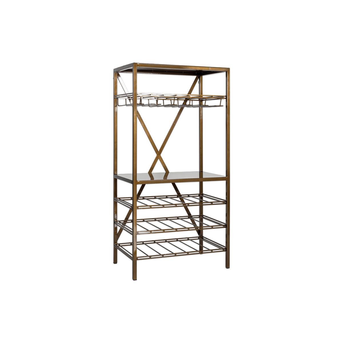 Our stylish Udayan Drinks Display has an elegant antique brass finish and a top shelf with horizontal storage for seven bottles as well as hanging space for assorted glasses (wine, champagne and cocktail). The solid shelf below is perfect for standing bottles, a decanter, ice bucket and drinks accessories, while an additional three racks can hold up to 21 further bottles. A functional, sophisticated and fun addition to a home bar or corner of your kitchen or living space.